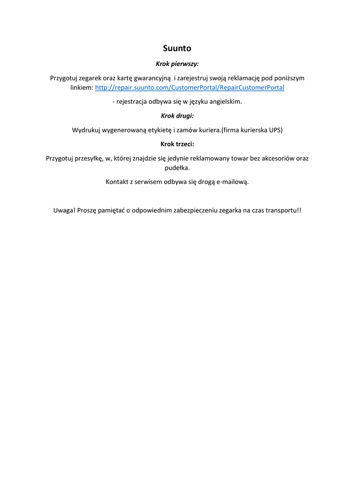 Suunto Krok pierwszy: Przygotuj zegarek oraz kartę gwarancyjną i zarejestruj swoją reklamację pod poniższym linkiem: http://repair.suunto.com/CustomerPortal/RepairCustomerPortal - rejestracja odbywa się w języku angielskim. Krok drugi: Wydrukuj wygenerowaną etykietę i zamów kuriera.(firma kurierska UPS) Krok trzeci: Przygotuj przesyłkę, w, której znajdzie się jedynie reklamowany towar bez akcesoriów oraz pudełka. Kontakt z serwisem odbywa się drogą e-mailową. Uwaga! Proszę pamiętać o odpowiednim zabezpieczeniu zegarka na czas transportu!!