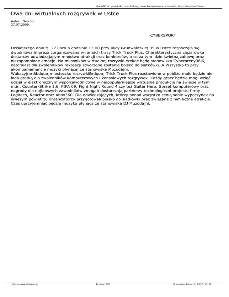strefaPC.pl - poradniki, overclocking, prasa komputerowa, sterowniki, testy, bezpieczeństwo Dwa dni wirtualnych rozgrywek w Ustce Autor: Serchio 27.07.2009. CYBERSPORT Dzisiejszego dnia tj. 27 lipca o godzinie 12.00 przy ulicy Grunwaldzkiej 35 w Ustce rozpoczęła się dwudniowa impreza zorganizowana w ramach trasy Trick Truck Plus. Charakterystyczna ciężarówka dostarczy odwiedzającym mnóstwo atrakcji oraz konkursów, a co za tym idzie świetną zabawę oraz niezapomniane emocje. Na miłośników wirtualnej rozrywki czekać będą stanowiska Cyberareny36i6, natomiast dla zwolenników rekreacji stworzone zostanie boisko do siatkówki. A Wszystko to przy akompaniamencie muzyki płynącej ze stanowiska Muzodajni. Wakacyjne „miasteczko rozrywki” Trick Truck Plus rozstawione w pobliżu molo będzie nie lada gratką dla zwolenników komputerowych i konsolowych rozgrywek. Każdy gracz będzie mógł wziąć udział w elektronicznym współzawodnictwie w najpopularniejsze wirtualne produkcje na świecie w tym m.in. Counter-Strike 1.6, FIFA 09, Fight Night Round 4 czy też Guitar Hero. Sprzęt komputerowy oraz nagrody dla najlepszych zawodników zmagań dostarczają partnerzy technologiczni projektu firmy Logitech, Reactor oraz Xbox360. Dla odwiedzających, którzy ponad wszystko cenią sobie wypoczynek na świeżym powietrzu organizatorzy przygotowali boisko do siatkówki oraz związane z nim liczne atrakcje. Czas uprzyjemniać będzie muzyka płynąca ze stanowiska DJ Muzodajni. http://www.strefapc.pl Kreator PDF Utworzono 8 March, 2017, 13:20