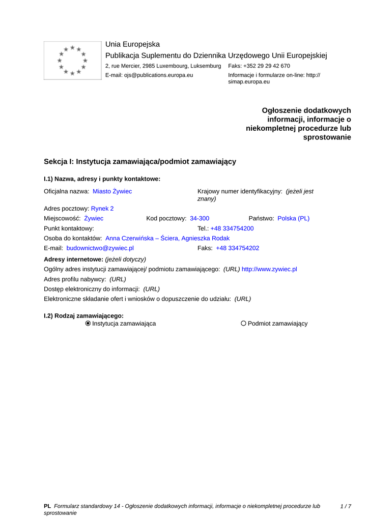 Unia Europejska Publikacja Suplementu do Dziennika Urzędowego Unii Europejskiej 2, rue Mercier, 2985 Luxembourg, Luksemburg Faks: +352 29 29 42 670 E-mail: [email protected] Informacje i formularze on-line: http:// simap.europa.eu Ogłoszenie dodatkowych informacji, informacje o niekompletnej procedurze lub sprostowanie Sekcja I: Instytucja zamawiająca/podmiot zamawiający I.1) Nazwa, adresy i punkty kontaktowe: Krajowy numer identyfikacyjny: (jeżeli jest znany) _____ Oficjalna nazwa: Miasto Żywiec Adres pocztowy: Rynek 2 Miejscowość: Żywiec Kod pocztowy: 34-300 Punkt kontaktowy: _____ Państwo: Polska (PL) Tel.: +48 334754200 Osoba do kontaktów: Anna Czerwińska – Ściera, Agnieszka Rodak E-mail: [email protected] Faks: +48 334754202 Adresy internetowe: (jeżeli dotyczy) Ogólny adres instytucji zamawiającej/ podmiotu zamawiającego: (URL) http://www.zywiec.pl Adres profilu nabywcy: (URL) _____ Dostęp elektroniczny do informacji: (URL) _____ Elektroniczne składanie ofert i wniosków o dopuszczenie do udziału: (URL) _____ I.2) Rodzaj zamawiającego: Instytucja zamawiająca Podmiot zamawiający PL Formularz standardowy 14 - Ogłoszenie dodatkowych informacji, informacje o niekompletnej procedurze lub sprostowanie 1/7 Sekcja II: Przedmiot zamówienia II.1.1) Nazwa nadana zamówieniu: Odbiór i zagospodarowanie odpadów komunalnych od właścicieli nieruchomości, na których zamieszkują i nie zamieszkują mieszkańcy, położonych na terenie miasta Żywca II.1.2) Krótki opis zamówienia lub zakupu: (podano w pierwotnym ogłoszeniu) Przedmiotem zamówienia jest usługa polegająca na odbiorze i zagospodarowaniu odpadów komunalnych od właścicieli nieruchomości zamieszkałych i niezamieszkałych położonych na terenie Miasta Żywca od dnia podpisania umowy do dnia 31 lipca 2014roku. 2.2. Szczegółowy zakres przedmiotu zamówienia obejmuje: a) odbiór i zagospodarowanie niesegregowanych (zmieszanych) odpadów komunalnych zgromadzonych w pojemnikach na nieruchomościach zamieszkałych i niezamieszkałych: przy budynkach mieszkalnych, w zakładach pracy, punktach handlowych i usługowych, szkołach, cmentarzach i parafiach, instytucjach publicznych, lokalach gastronomicznych, aptekach, targowiskach, przychodniach i placówkach leczniczych, hotelach i innych obiektach noclegowych, ogródkach działkowych i domkach rekreacyjnych, obiektach rekreacyjno – sportowych, przy ulicach i placach, pozostałych obiektach niezamieszkałych itp., b) odbiór i zagospodarowanie wyszczególnionych poniżej odpadów komunalnych, gromadzonych w sposób selektywny: przeterminowanych leków i chemikaliów w tym farb, rozpuszczalników, olejów odpadowych itd., zużytych baterii i akumulatorów, zużytego sprzętu elektrycznego i elektronicznego, opakowań po środkach ochrony roślin i nawozach, zużytych tekstyliów w tym ubrań, mebli i innych odpadów wielkogabarytowych, odpadów budowlanych i rozbiórkowych, zużytych opon, odpadów ulegających biodegradacji i zielonych, w tym odpadów opakowaniowych ulegających biodegradacji, papieru , szkła i opakowań wielomateriałowych, tworzywa sztucznego , metali, żużli z kotłów c.o. oraz ich zagospodarowanie, c) bezpośrednio z nieruchomości zamieszkałych odbierane będą każde ilości zgromadzonych odpadów komunalnych wyszczególnionych poniżej: odpadów ulegających biodegradacji i zielonych, w tym odpadów opakowaniowych ulegających biodegradacji, papieru , szkła i opakowań wielomateriałowych, tworzywa sztucznego , metali, żużli z kotłów c.o. d) z nieruchomości nie zamieszkałych odbierane będą odpady komunalne, wyszczególnione poniżej: odpady ulegające biodegradacji i zielone, w tym odpady opakowaniowe ulegające biodegradacji, papier , szkło i opakowania wielomateriałowe, PL Formularz standardowy 14 - Ogłoszenie dodatkowych informacji, informacje o niekompletnej procedurze lub sprostowanie 2/7 tworzywa sztuczne , metale, żużel z kotłów c.o. w ilościach określonych w wykazie obsługiwanych nieruchomości, o którym mowa w punkcie 3.3, e) utworzenie i obsługę na terenie Miasta Żywca Punktu Selektywnego Zbierania Odpadów Komunalnych w miejscu wskazanym przez Zamawiającego. Punkt Selektywnego Zbierania Odpadów Komunalnych musi rozpocząć funkcjonowanie w terminie dwóch tygodni od daty zawarcia umowy na odbiór i zagospodarowanie odpadów komunalnych od właścicieli nieruchomości, na których zamieszkują i nie zamieszkują mieszkańcy, położonych na terenie Miasta Żywca, f) usuwanie odpadów zgromadzonych w miejscach do tego nieprzeznaczonych, powstałych na terenie Miasta Żywca, w sposób zgodny z przepisami ustawy z dnia 13 września 1996r. o utrzymaniu czystości i porządku w gminach (Dz.U.2012 r., poz. 391 ze zm.) oraz postanowieniami Regulaminu utrzymania czystości i porządku na terenie Miasta Żywca ( uchwała Rady Miejskiej w Żywcu nr XXXVIII/269/2012 z dnia 28 grudnia 2012 roku). 2.3. Wykonawca jest zobowiązany do świadczenia usługi zgodnie z zasadami regionalnej gospodarki odpadami z zachowaniem hierarchii postępowania z odpadami, o której mowa w ustawie z dnia 14 grudnia 2012 r. o odpadach ( Dz. U. z 2013r., poz. 21), ze szczególnym uwzględnieniem priorytetu selektywnej zbiórki odpadów. 2.4. W ramach zagospodarowania odpadów komunalnych Wykonawca zobowiązany jest do przekazywania odebranych zmieszanych odpadów komunalnych, odpadów zielonych oraz pozostałości z sortowania odpadów komunalnych przeznaczonych do składowania do regionalnej lub zastępczych instalacji do przetwarzania odpadów komunalnych, właściwej dla regionu IV, zgodnie z Planem gospodarki odpadami dla województwa śląskiego 2014 (uchwała Nr IV/25/1/2012 Sejmiku Województwa Śląskiego z dnia 24 sierpnia 2012 roku). W przypadku selektywnie zebranych odpadów komunalnych, w ramach zagospodarowania odpadów, Wykonawca zobowiązany jest do ich przekazywania do instalacji odzysku i unieszkodliwiania, z