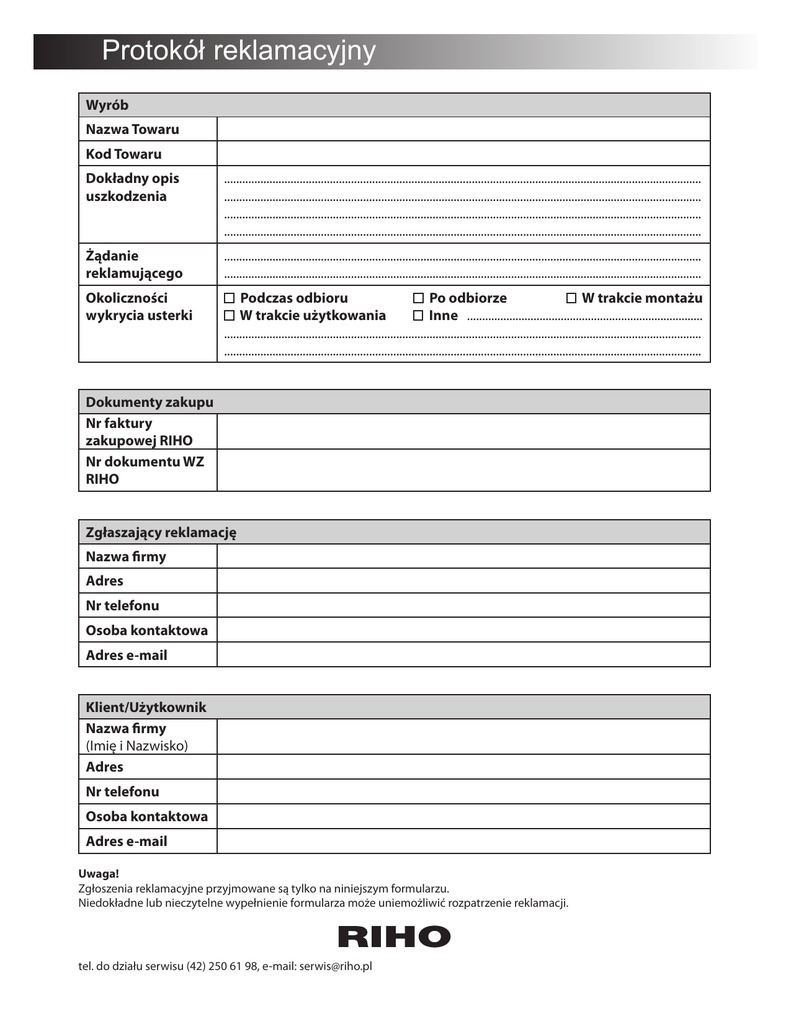 Protokóá reklamacyjny Wyrób Nazwa Towaru Kod Towaru Dokładny opis uszkodzenia .............................................................................................................................................................. .............................................................................................................................................................. .............................................................................................................................................................. .............................................................................................................................................................. Żądanie reklamującego .............................................................................................................................................................. .............................................................................................................................................................. Okoliczności wykrycia usterki Podczas odbioru Po odbiorze W trakcie montażu W trakcie użytkowania Inne .............................................................................. .............................................................................................................................................................. .............................................................................................................................................................. Dokumenty zakupu Nr faktury zakupowej RIHO Nr dokumentu WZ RIHO Zgłaszający reklamację Nazwa firmy Adres Nr telefonu Osoba kontaktowa Adres e-mail Klient/Użytkownik Nazwa firmy (Imię i Nazwisko) Adres Nr telefonu Osoba kontaktowa Adres e-mail Uwaga! Zgłoszenia reklamacyjne przyjmowane są tylko na niniejszym formularzu. Niedokładne lub nieczytelne wypełnienie formularza może uniemożliwić rozpatrzenie reklamacji. tel. do działu serwisu (42) 250 61 98, e-mail: [email protected]