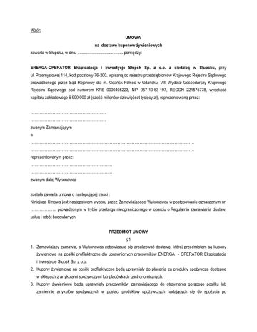 Wzór: UMOWA na dostawę kuponów żywieniowych zawarta w Słupsku, w dniu .......................................... pomiędzy: ENERGA-OPERATOR Eksploatacja i Inwestycje Słupsk Sp. z o.o. z siedzibą w Słupsku, przy ul. Przemysłowej 114, kod pocztowy 76-200, wpisaną do rejestru przedsiębiorców Krajowego Rejestru Sądowego prowadzonego przez Sąd Rejonowy dla m. Gdańsk-Północ w Gdańsku, VIII Wydział Gospodarczy Krajowego Rejestru Sądowego pod numerem KRS 0000405223, NIP 957-10-63-197, REGON 221575778, wysokość kapitału zakładowego 6 900 000 zł (sześć milionów dziewięćset tysięcy zł), reprezentowaną przez: …………………………………………………. …………………………………………………. zwanym Zamawiającym a ……………………………………………………………………………………………………………… ……………………………………………………………………………………………………………… reprezentowanym przez: ……………………………………………………… ……………………………………………………… zwanym dalej Wykonawcą została zawarta umowa o następującej treści : Niniejsza Umowa jest następstwem wyboru przez Zamawiającego Wykonawcy w postępowaniu oznaczonym nr: ……………….. prowadzonym w trybie przetargu nieograniczonego w oparciu o Regulamin zamawiania dostaw, usług i robót budowlanych. PRZEDMIOT UMOWY §1 1. Zamawiający zamawia, a Wykonawca zobowiązuje się zrealizować dostawę, której przedmiotem są kupony żywieniowe na posiłki profilaktyczne dla uprawnionych pracowników ENERGA - OPERATOR Eksploatacja i Inwestycje Słupsk Sp. z o.o. 2. Kupony żywieniowe na posiłki profilaktyczne będą uprawniały do płacenia za produkty spożywcze dostępne w sklepach z artykułami spożywczymi lub placówkach gastronomicznych. 3. Kupony żywieniowe będą uprawniały pracowników zamawiającego do otrzymania gorącego posiłku lub zamiennie artykułów spożywczych w postaci produktów spożywczych nadających się do spożycia po przygotowaniu – zgodnie z wymaganiami określonymi w Rozporządzeniu Rady Ministrów z dnia 28 maja 1996 r. w sprawie profilaktycznych posiłków i napojów ( Dz.U.Nr 60 poz.279 ). 4. Zamawiający planuje w okresie obowiązywania umowy dostawę kuponów żywieniowych o nominałach 7,75 zł na łączną wartość ok: 183.117,00 zł w okresie od dnia podpisania umowy do 31.03.2013 oraz o nominałach 8,00 zł na łączną wartość ok. 99.840,00 zł w okresie od 04.11.2013 do 31.12.2013 r. 5. Zamawiający zastrzega możliwość zmiany wartości nominału kuponu w okresie od 04.11.2013 r. do 31.12.2013 r. 6. Termin ważności kuponów: od dnia podpisania umowy do 31.12.2013 r. 7. Wartość nominalną pojedynczych kuponów Zamawiający ustala tak, aby była możliwość realizacji jednodniowego posiłku profilaktycznego za kwotę 7,75 zł i 8,00 zł. 8. Kupony żywieniowe nie mogą podlegać wymianie na gotówkę, używki oraz artykuły nieżywnościowe. OBOWIĄZKI STRON §2 1. Wykonawca zobowiązuje się do: a) wykonania przedmiotu umowy zgodnie z Warunkami Zamówienia i złożona ofertą w wyznaczonym terminie, b) sukcesywnej dostawy kuponów żywieniowych w ilościach i o nominałach zgodnych ze złożonymi zamówieniami, c) zapewnienia możliwości realizacji kuponów żywieniowych w placówkach gastronomicznych i sklepach z artykułami spożywczymi na terenie miast i miejscowości: Słupsk, Człuchów, Lębork, Bytów, Ustka, Sławno, Kępice, Miastko, Czarne, Łeba, Koszalin, Będzino, Darłowo, Malechowo, Polanów, Sianów, Świeszyno, Białogard, Połczyn Zdrój, Świdwin, Tychowo, Drawsko Pomorskie, Czaplinek, Kalisz Pomorski, Złocieniec, Szczecinek, Barwice, Biały Bór, Bobolice, Borne Sulinowo, Grzmiąca, Kołobrzeg, Gościno, Ustronie Morskie. 2. Zamawiający zobowiązuje się do: a) składania zamówień pisemnie , pocztą e-mail lub faksem, z podaniem ilości, nominałów i miejsca dostawy. b) potwierdzenia odbioru ilościowego kuponów żywieniowych. c) zapłaty wynagrodzenia w ustalonym terminie. TERMIN REALIZACJI §3 1. Wykonanie przedmiotu umowy wskazanego w § 1 nastąpi w okresie: od dnia podpisania umowy do dnia 31.12.2013 r. 2. Dostawy będą realizowane sukcesywnie w żądanych przez Zamawiającego ilościach, na podstawie oddzielnych miesięcznych zamówień składanych pisemnie lub faksem, dla każdego miejsca dostawy oddzielnie. Wykonawca zobowiązany jest potwierdzić faksem otrzymanie zamówienia. 3. Wymagany termin realizacji dostaw: do 3 dni od dnia złożenia zamówienia. 4. Miejsce dostawy: 1) Wydział Usług Sieciowych ul. Przemysłowa 114 76-200 Słupsk a) pracownik upoważniony do odbioru: p. Sawicki Zbigniew (8UE01) 2) Wydział Automatyki i Zabezpieczeń ul. Przemysłowa 114 76-200 Słupsk a) pracownik upoważniony do odbioru : p. Włodarski Tomasz ( 8USA ) 3) Wydział Maszyn i Urządzeń ul. Przemysłowa 114 76-200 Słupsk a) pracownik upoważniony do odbioru : p. Bogdan Ruth ( 8USM ) 4) Wydział Telemechaniki ul. Przemysłowa 114 76-200 Słupsk a) pracownik upoważniony do odbioru : p. Piechociak Józef ( 8UST ) 5) Wydział Usług Sieciowych w Człuchowie ul. Koszalińska 6a 77-300 Człuchów a) pracownik upoważniony do odbioru: p. Grochowski Paweł ( 8UE02 ) 6) Wydział Usług Sieciowych w Lęborku ul. Krzywoustego 34a 84-300 Lębork a) pracownik upoważniony do odbioru : Bojarski Piotr ( 8UE03 ) 7) Rejon Dystrybucji w Bytowie ul. Mickiewicza 9 77-100 Bytów a) pracownik upoważniony do odbioru: Meyer Ireneusz ( 8UE04 ) 8) Dział Usług Sieciowych w Miastku ul. Węgorzynko 5 77-200 Miastko a) pracownik upoważniony do odbioru : Drąszkowski Ryszard ( 8UE041 ) 9) Wydział Usług Sieciowych w Koszalinie ul. Energetyków 24 /zaplecze/ 75-950 Koszalin a) pracownik upoważniony do odbioru : Gaik Tomasz ( 8UE05 ) 10) Wydział Usług Sieciowyc