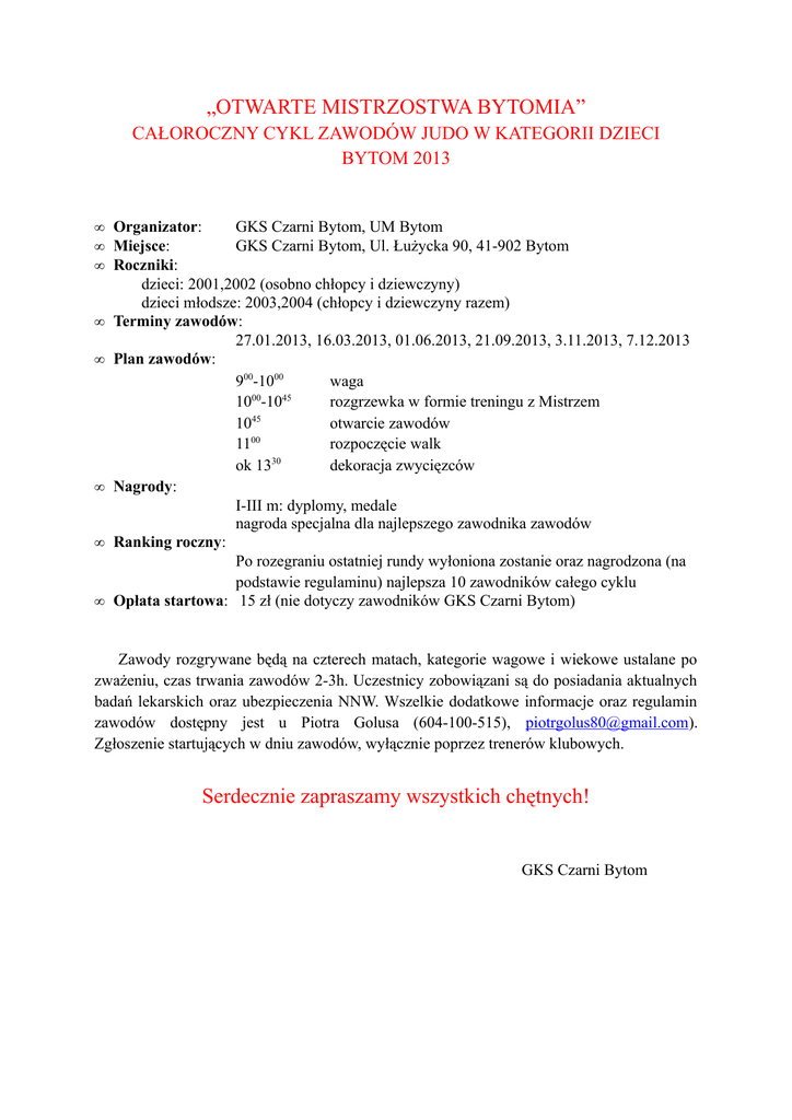 „OTWARTE MISTRZOSTWA BYTOMIA” CAŁOROCZNY CYKL ZAWODÓW JUDO W KATEGORII DZIECI BYTOM 2013 • Organizator: • Miejsce: • Roczniki: • • • • • GKS Czarni Bytom, UM Bytom GKS Czarni Bytom, Ul. Łużycka 90, 41-902 Bytom dzieci: 2001,2002 (osobno chłopcy i dziewczyny) dzieci młodsze: 2003,2004 (chłopcy i dziewczyny razem) Terminy zawodów: 27.01.2013, 16.03.2013, 01.06.2013, 21.09.2013, 3.11.2013, 7.12.2013 Plan zawodów: 900-1000 waga 00 45 10 -10 rozgrzewka w formie treningu z Mistrzem 45 10 otwarcie zawodów 00 11 rozpoczęcie walk 30 ok 13 dekoracja zwycięzców Nagrody: I-III m: dyplomy, medale nagroda specjalna dla najlepszego zawodnika zawodów Ranking roczny: Po rozegraniu ostatniej rundy wyłoniona zostanie oraz nagrodzona (na podstawie regulaminu) najlepsza 10 zawodników całego cyklu Opłata startowa: 15 zł (nie dotyczy zawodników GKS Czarni Bytom) Zawody rozgrywane będą na czterech matach, kategorie wagowe i wiekowe ustalane po zważeniu, czas trwania zawodów 2-3h. Uczestnicy zobowiązani są do posiadania aktualnych badań lekarskich oraz ubezpieczenia NNW. Wszelkie dodatkowe informacje oraz regulamin zawodów dostępny jest u Piotra Golusa (604-100-515), [email protected]). Zgłoszenie startujących w dniu zawodów, wyłącznie poprzez trenerów klubowych. Serdecznie zapraszamy wszystkich chętnych! GKS Czarni Bytom