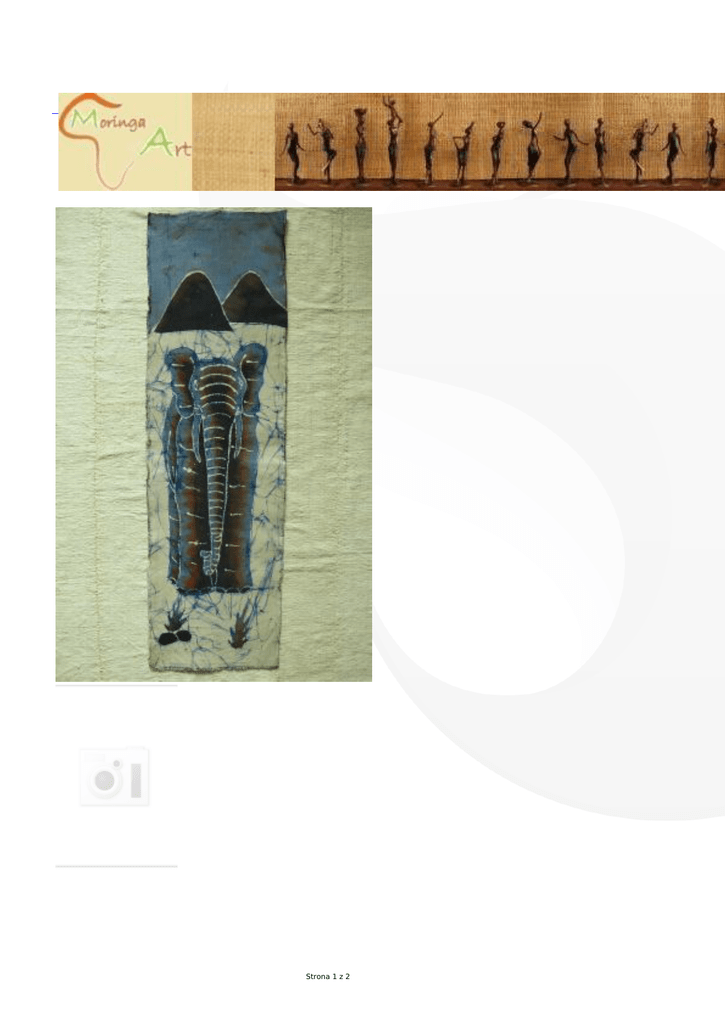 Strona 1 z 2 Niepowtarzalny batik przedstawiający afrykańskiego słonia. Wykonany na płótnie (100 % bawełny) przez artystę z pracowni Sekou Diarra. Wymiary: 24 cm x 83 cm. Każdy batik występuje w pojedynczym egzempalrzu, nie m dwóch takich samych batików. Batik pochodzi z Burkiny Faso. Batik jest to technika polegająca na kolejnym nakładaniu wosku i kąpieli tkaniny w barwniku, który farbuje jedynie miejsca nie zamaskowane warstwą wosku. Proces woskowania i farbowania można, dla uzyskania specjalnych efektów, powtarzać wielokrotnie. Nie da się zrobić dwóch identycznych prac. Wosk ma zawsze trochę inną temperaturę (co sprawia, że inaczej wsiąka w płótno), barwniki nieco inne stężenie i odcień, płótno schnie po ufarbowaniu z różną szybkością. Jednak to krakelura, czyli kolorowe „żyłki” powstające wskutek wnikania barwnika w spękania w wosku, jest tym, po czym rozpoznaje się batik. Dzięki niej każda praca jest niepowtarzalna. Strona 2 z 2