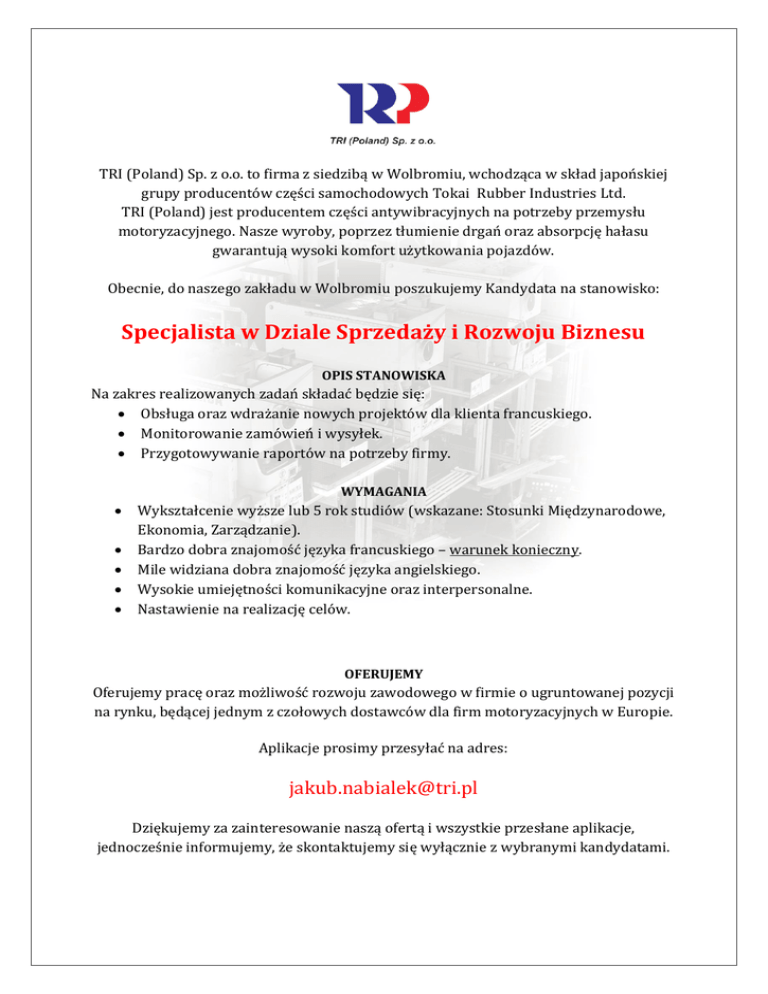 TRI (Poland) Sp. z o.o. to firma z siedzibą w Wolbromiu, wchodząca w skład japońskiej grupy producentów części samochodowych Tokai Rubber Industries Ltd. TRI (Poland) jest producentem części antywibracyjnych na potrzeby przemysłu motoryzacyjnego. Nasze wyroby, poprzez tłumienie drgań oraz absorpcję hałasu gwarantują wysoki komfort użytkowania pojazdów. Obecnie, do naszego zakładu w Wolbromiu poszukujemy Kandydata na stanowisko: Specjalista w Dziale Sprzedaży i Rozwoju Biznesu OPIS STANOWISKA Na zakres realizowanych zadań składać będzie się: Obsługa oraz wdrażanie nowych projektów dla klienta francuskiego. Monitorowanie zamówień i wysyłek. Przygotowywanie raportów na potrzeby firmy. WYMAGANIA Wykształcenie wyższe lub 5 rok studiów (wskazane: Stosunki Międzynarodowe, Ekonomia, Zarządzanie). Bardzo dobra znajomość języka francuskiego – warunek konieczny. Mile widziana dobra znajomość języka angielskiego. Wysokie umiejętności komunikacyjne oraz interpersonalne. Nastawienie na realizację celów. OFERUJEMY Oferujemy pracę oraz możliwość rozwoju zawodowego w firmie o ugruntowanej pozycji na rynku, będącej jednym z czołowych dostawców dla firm motoryzacyjnych w Europie. Aplikacje prosimy przesyłać na adres: [email protected] Dziękujemy za zainteresowanie naszą ofertą i wszystkie przesłane aplikacje, jednocześnie informujemy, że skontaktujemy się wyłącznie z wybranymi kandydatami.