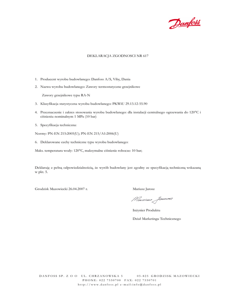 DEKLARACJA ZGODNOSCI NR 617 1. Producent wyrobu budowlanego: Danfoss A/S, Viby, Dania 2. Nazwa wyrobu budowlanego: Zawory termostatyczne grzejnikowe Zawory grzejnikowe typu RA-N 3. Klasyfikacja statystyczna wyrobu budowlanego: PKWiU 29.13.12-55.90 4. Przeznaczenie i zakres stosowania wyrobu budowlanego: dla instalacji centralnego ogrzewania do 120°C i ciśnieniu nominalnym 1 MPa (10 bar) 5. Specyfikacja techniczna: Normy: PN-EN 215:2005(U); PN-EN 215/A1:2006(U) 6. Deklarowane cechy techniczne typu wyrobu budowlanego: Maks. temperatura wody: 120°C, maksymalne ciśnienie robocze: 10 bar; Deklaruję z pełną odpowiedzialnością, Ŝe wyrób budowlany jest zgodny ze specyfikacją techniczną wskazaną w pkt. 5. Grodzisk Mazowiecki 26.04.2007 r. Mariusz Jarosz InŜynier Produktu Dział Marketingu Technicznego DANFOSS SP. Z O O UL. CHRZANOWSKA 5 05-825 GRODZISK MAZOWIECKI PHONE: 022 7550700 FAX: 022 7550701 http://www.danfoss.pl e-mail:[email protected]