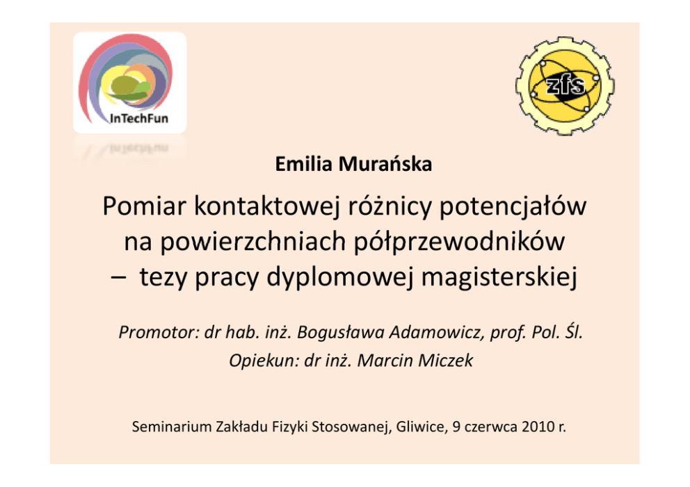 Emilia Murańska Pomiar kontaktowej różnicy potencjałów na powierzchniach półprzewodników – tezy pracy dyplomowej magisterskiej Promotor: dr hab. inż. Bogusława Adamowicz, prof. Pol. Śl. Opiekun: dr inż. Marcin Miczek Seminarium Zakładu Fizyki Stosowanej, Gliwice, 9 czerwca 2010 r. Plan prezentacji 1. Motywacja 2. Cel i zakres pracy 3. Kontaktowa różnica potencjałów (CPD) i fotonapięcie powierzchniowe (SPV) 4. Obliczenia numeryczne SPV 5. Układ pomiarowy – projekt i wykonanie 6. Pomiary SPV i dyskusja wyników 7. Podsumowanie Motywacja Miniaturyzacja przyrządów elektronicznych wzrost znaczenia powierzchni i granic fazowych zapotrzebowanie na bezkontaktowe i nieniszczące metody charakteryzacji własności elektronowych powierzchniowych i objętościowych pomiar CPD/SPV Analiza zjawisk nierównowagowych wzbudzanych światłem: o generacja par elektron-dziura oraz rozdzielenie ładunków w polu elektrycznym – baterie słoneczne i fotodetektory, o rekombinacja promienista nośników – lasery półprzewodnikowe i diody świecące, o procesy rekombinacji nośników (w tym niepromienista rekombinacja powierzchniowa) – diody, tranzystory i układy wielowarstwowe . Motywacja Pomiar CPD/SPV – wyznaczanie: Schroder, Meas. Sci. Technol. 12 (2001) parametrów objętościowych: o długość drogi dyfuzji nośników mniejszościowych, o czas życia nośników, o domieszkowanie; parametrów powierzchniowych: o potencjał powierzchniowy, o ładunek powierzchniowy, o gęstość stanów powierzchniowych. Kilka zastosowań szczegółowych: charakteryzacja półprzewodników przez pomiar drogi dyfuzji nośników mniejszościowych z CPD/SPV (konwersja fotowoltaiczna w kolektorach słonecznych), monitorowanie zanieczyszczeń warstw Si (głównie Fe). Mapa drogi dyfuzji dla Si domieszkowanego B a) przed b) po dysocjacji par Fe-B c) mapa zanieczyszczeń Fe [7] Cel i zakres pracy 1. Analiza teoretyczna wpływu stanów powierzchniowych i domieszkowania na SPV w Si i GaAs. 2. Weryfikacja numeryczna przybliżonej metody wyznaczania drogi dyfuzji nośników mniejszościowych z SPV. 3. Zaprojektowanie i uruchomienie stanowiska do pomiarów CPD oraz SPV za pomocą sondy Kelvina (InTechFun, zadanie Z7.7). 4. Pomiar CPD i SPV dla wybranych powierzchni półprzewodników (GaAs, InP, Si) . Kontaktowa różnica potencjałów (CPD) Układ metal/próżnia/półprzewodnik w stanie równowagi: wyrównanie poziomu Fermiego, zakrzywienie pasm energetycznych. Фs,m – prace wyjścia VS – potencjał powierzchniowy LD – długość ekranowania Debye’a q(CPD) Φm Φs Ec Ef qVs próŜnia Ev półprzewodnik x typu n metal LD 0 Fotonapięcie powierzchniowe (SPV) Zmiana potencjału powierzchniowego oraz CPD Model dryftowo-dyfuzyjny pod wpływem oświetlenia rekombinacja powierzchniowa rekombinacja pasmo - pasmo dyfuzja SPV rekombinacja Auger V q S Φ Efn Ec d2 V q = − (ND − NA + p − n), 2 dx εε0 Ef dn 1 dIn = + G −U, dt q dx dp 1 dIp =− + G −U, dt q dx dV dn In = qDn − qnµn , dx dx dp dV I p = −qDp − qpµp . dx dx Efp stany powierzchniowe Nss(E) Ev dryf rekombinacja generacja SRH x ∆SPV = Vs (on ) − Vs (off ) SPV = CPD(on ) − CPD (off ) - Rozwiązanie układu 5 równań róŜniczkowych ->modelowanie komputerowe gdzie: U = Urad + USRH + U Aug Model DIGS (Disorder Induced Gap State) H. Hasegawa, H. Ohno JVST B 1986 Nss warstwa quasi-amorficzna A D metal, izolator, lub półprzewodnik Nss0 półprzewodnik stan pusty zapełniony donorowy + 0 0 − akceptorowy EV EHO EC Obliczenia numeryczne: obliczenie SPV(Ф); n(x), p(x), V(x), EFn, EFp w funkcji Ф i zadanego rozkładu NSS(E); Wyniki obliczeń własnych 0,6 Wpływ stanów powierzchniowych na SPV NSS0 =1013 eV-1 cm-2 SPV, V 0,4 1012 n-GaAs 1011 0,2 1010 0 1E+5 1E+9 1E+13 1E+17 Ф, foton cm-2 s-1 1E+5 1E+9 1E+13 1E+17 SPV, V 1013 1E-3 1012 1011 NSS0 =1010 eV-1 cm-2 n-GaAs 1E-6 Ф, foton cm-2 s-1 Im większe NSS0 tym większe SPV – zaleta metody (w porównaniu z PL, C-V); dla małych SPV i Φ SPV(Φ) jest f. liniową; SPV zaczyna wzrastać log. tym wcześniej, im większe NSS0; Nie ma nasycenia SPV dla dużych Φ – efekt Dembera. Wyniki obliczeń własnych 0,6 SPV, V 0,4 0,2 n-GaAs NSS0 = 1011 eV-1 cm-2 Nd = 1014 cm-3 1015 Wpływ domieszkowania na SPV 1016 1017 0 1E+7 1E+10 1E+13 1E+16 1E+19 1E+22 Φ, foton cm-2 s-1 1E+14 Ф, foton cm-2 s-1 Próg detekcji 1E+12 n-GaAs SPV > 0,01 V NSS0 = 1011 eV-1 cm-2 1E+10 1E+8 1E+14 1E+15 1E+16 Nd, cm-3 1E+17 Im mniejsze Nd tym większe SPV; SPV zaczyna wzrastać log. tym wcześniej, im mniejsze Nd. Numeryczna weryfikacja metody wyznaczania drogi dyfuzji z SPV Założenia upraszczające (model jednowymiarowy): 1) niski poziom wzbudzenia (model liniowy), 2) próbka gruba, 3) światło pochłanianie względnie słabo (penetracja warstwy zubożonej), ale zanikające w próbce, 4) szerokość warstwy zubożonej mniejsza od drogi dyfuzji nośników mniejszościowych. 1 / α >> W ; L p >> W ; 1 / α << d ; L p << d ; ∆ p << n 0 . d – grubość próbki; W – szerokość warstwy zubożonej; α – współczynnik absorpcji światła; Δp – zmiana koncentracji dziur; n0 – równowagowa koncentracja elektronów Φ(α) α Wyznaczanie drogi dyfuzji nośników mniejszościowych z SPV Rozwiązanie równania dyfuzji nośników mniejszościowych poza warstwą zubożoną (zaniedbanie pola elektrycznego) Równanie Einsteina: Φ 1  = C Lp +  SPV α  L p = D pτ p Lp – droga dyfuzji nośników mniejszościowych; α – współczynnik pochłaniania światła; C – stała niezależna od α, Φ i SPV. kT Dp = µ p e μp – ruchliwość dziur Dp – stała dyfuzji e – ładunek elementarny k – stała Boltzmana T – temperatura τp – czas życia dziur Wyznaczenie Lp z pomiarów Φ/SPV(1/α) Pomiar SPV dla ustalonego Φ i zmiennego λ (a przez to α), wykreślenie 1/SPV w funkcji 1/α, wyznaczenie Lp z ekstrapolacji. Schroder, Meas. Sci. Technol. 12 (2001) 1/SPV|Φ=const 1/α Lp Metoda szeroko st