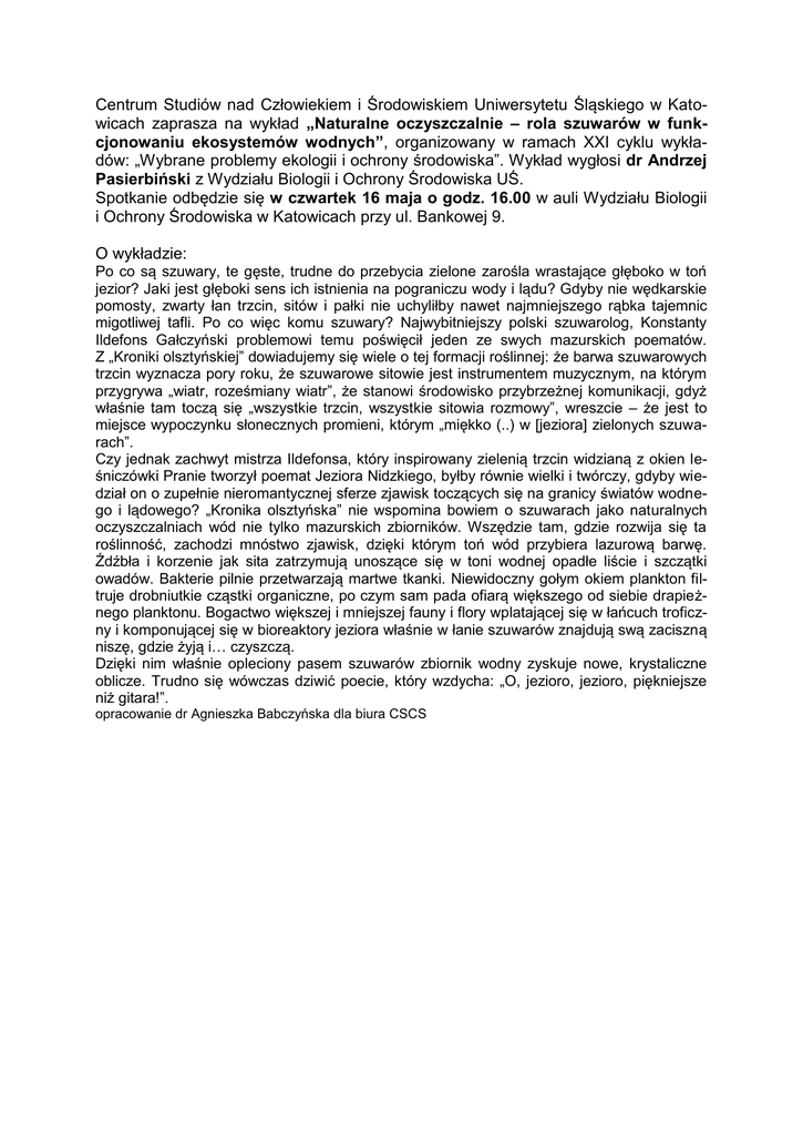 Centrum Studiów nad Człowiekiem i Środowiskiem Uniwersytetu Śląskiego w Katowicach zaprasza na wykład „Naturalne oczyszczalnie – rola szuwarów w funkcjonowaniu ekosystemów wodnych”, organizowany w ramach XXI cyklu wykładów: „Wybrane problemy ekologii i ochrony środowiska”. Wykład wygłosi dr Andrzej Pasierbiński z Wydziału Biologii i Ochrony Środowiska UŚ. Spotkanie odbędzie się w czwartek 16 maja o godz. 16.00 w auli Wydziału Biologii i Ochrony Środowiska w Katowicach przy ul. Bankowej 9. O wykładzie: Po co są szuwary, te gęste, trudne do przebycia zielone zarośla wrastające głęboko w toń jezior? Jaki jest głęboki sens ich istnienia na pograniczu wody i lądu? Gdyby nie wędkarskie pomosty, zwarty łan trzcin, sitów i pałki nie uchyliłby nawet najmniejszego rąbka tajemnic migotliwej tafli. Po co więc komu szuwary? Najwybitniejszy polski szuwarolog, Konstanty Ildefons Gałczyński problemowi temu poświęcił jeden ze swych mazurskich poematów. Z „Kroniki olsztyńskiej” dowiadujemy się wiele o tej formacji roślinnej: że barwa szuwarowych trzcin wyznacza pory roku, że szuwarowe sitowie jest instrumentem muzycznym, na którym przygrywa „wiatr, roześmiany wiatr”, że stanowi środowisko przybrzeżnej komunikacji, gdyż właśnie tam toczą się „wszystkie trzcin, wszystkie sitowia rozmowy”, wreszcie – że jest to miejsce wypoczynku słonecznych promieni, którym „miękko (..) w [jeziora] zielonych szuwarach”. Czy jednak zachwyt mistrza Ildefonsa, który inspirowany zielenią trzcin widzianą z okien leśniczówki Pranie tworzył poemat Jeziora Nidzkiego, byłby równie wielki i twórczy, gdyby wiedział on o zupełnie nieromantycznej sferze zjawisk toczących się na granicy światów wodnego i lądowego? „Kronika olsztyńska” nie wspomina bowiem o szuwarach jako naturalnych oczyszczalniach wód nie tylko mazurskich zbiorników. Wszędzie tam, gdzie rozwija się ta roślinność, zachodzi mnóstwo zjawisk, dzięki którym toń wód przybiera lazurową barwę. Źdźbła i korzenie jak sita zatrzymują unoszące się w toni wodnej opadłe liście i szczątki owadów. Bakterie pilnie przetwarzają martwe tkanki. Niewidoczny gołym okiem plankton filtruje drobniutkie cząstki organiczne, po czym sam pada ofiarą większego od siebie drapieżnego planktonu. Bogactwo większej i mniejszej fauny i flory wplatającej się w łańcuch troficzny i komponującej się w bioreaktory jeziora właśnie w łanie szuwarów znajdują swą zaciszną niszę, gdzie żyją i… czyszczą. Dzięki nim właśnie opleciony pasem szuwarów zbiornik wodny zyskuje nowe, krystaliczne oblicze. Trudno się wówczas dziwić poecie, który wzdycha: „O, jezioro, jezioro, piękniejsze niż gitara!”. opracowanie dr Agnieszka Babczyńska dla biura CSCS