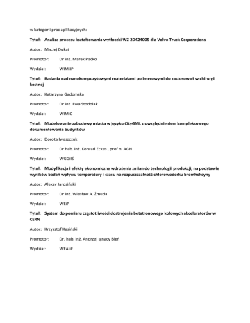 w kategorii prac aplikacyjnych: Tytuł: Analiza procesu kształtowania wytłoczki WZ 2D424005 dla Volvo Truck Corporations Autor: Maciej Dukat Promotor: Dr inż. Marek Paćko Wydział: WIMiIP Tytuł: Badania nad nanokompozytowymi materiałami polimerowymi do zastosowań w chirurgii kostnej Autor: Katarzyna Gadomska Promotor: Dr inż. Ewa Stodolak Wydział: WIMiC Tytuł: Modelowanie zabudowy miasta w języku CityGML z uwzględnieniem kompleksowego dokumentowania budynków Autor: Dorota Iwaszczuk Promotor: Dr hab. inż. Konrad Eckes , prof n. AGH Wydział: WGGiIŚ Tytuł: Modyfikacja i efekty ekonomiczne wdrożenia zmian do technologii produkcji, na podstawie wyników badań wpływu temperatury i czasu na rozpuszczalność chlorowodorku bromheksyny Autor: Aleksy Jarosiński Promotor: Dr inż. Wiesław A. Żmuda Wydział: WEiP Tytuł: System do pomiaru częstotliwości dostrojenia betatronowego kołowych akceleratorów w CERN Autor: Krzysztof Kasiński Promotor: Dr. hab. inż. Andrzej Ignacy Bień Wydział: WEAIiE Tytuł: Możliwość zastosowania spektroskopii w bliskiej podczerwieni do analizy wybranych własności węgla brunatnego Autor: Ewa Kawala Promotor: Dr inż. Marcin Chodak Wydział: WGiG Tytuł: Projekt elektroniki front-end dla kalorymetru LumiCal dla ILC Autor: Szymon Kulis Promotor: Dr hab. inż. Marek Idzik Wydział: WFiIS Tytuł: Formy polodowcowe jako atrakcje geoturystyczne Doliny Pięciu Stawów Polskich Autorzy: Paulina Mrowczyk, Grzegorz Madeja Promotor: Dr inż. Marek Doktor Wydział: WGGiOŚ Tytuł: Koncepcja i modelowanie spiralnego wymiennika ciepła do odzysku energii z wody odpływowej prysznica Autor: Leszek Pstraś Promotor: prof. dr hab. inż. Wiesław Rakowski Wydział: MSE Tytuł: Próba wykonania odlewów ze staliwa i stali wysokowęglowej metodą thixoformingu Autor: Łukasz Rogal Promotor: Prof. dr hab. inż. Jan Dutkiewicz Wydział: WO Tytuł: Metody wykorzystywania badań geochemicznych przy likwidowanych odwiertach Autor: Józef Walczyk Promotor: Dr inż. Jan Macuda Wydział: WWNiG w kategorii prac teoretycznych: Tytuł: Modelowanie ekscytonowego widma fotoluminescencyjnego stosów kropek kwantowych w zewnętrznym polu elektrycznym Autor: Ewelina Barczyk Promotor: Dr hab. inż. Bartłomiej Szafran Wydział: WFiIS Tytuł: Screen Printing of Micro Structured Cathodes for Solid Oxide Fuel Cells (SOFCe) Autor: Dariusz Burnat Promotor: Dr hab. inż. Dariusz Kata Wydział: WIMiC Tytuł: Analiza numeryczna procesu formowania na zimno rur miedzianych do przesyłania energii elektrycznej Autor: Konrad Perzyński Promotor: Prof. dr inż. Maciej Pietrzyk Wydział: WIMiIP Tytuł: Analiza Jakościowa, ilościowa i mikrobiologiczna wody pitnej Autor: Joanna Piotrowska Promotor: Dr inż. Andrzej Rozwadowski Wydział: WEiP Tytuł: Wykorzystanie funkcji sklejanych do opisu powierzchniowych budowli inżynierskich Autor: Michał Sachar Promotor: Dr inż. Grzegorz Lenda Wydział: WGGiIŚ Tytuł: Collection and storage of provenance data Autor: Jakub Wach Promotor: Dr Marian Bubak Wydział: WEAIiE Tytuł: Geometryczna analiza transformacji dyslokacji sieci RSC w wyniku złożenia pierwotnego i wtórnego bliźniakowania Autor: Łukasz Wzorek Promotor: Dr hab. inż. Marek S. Szczerba prof. nadzw. Wydział: WMN