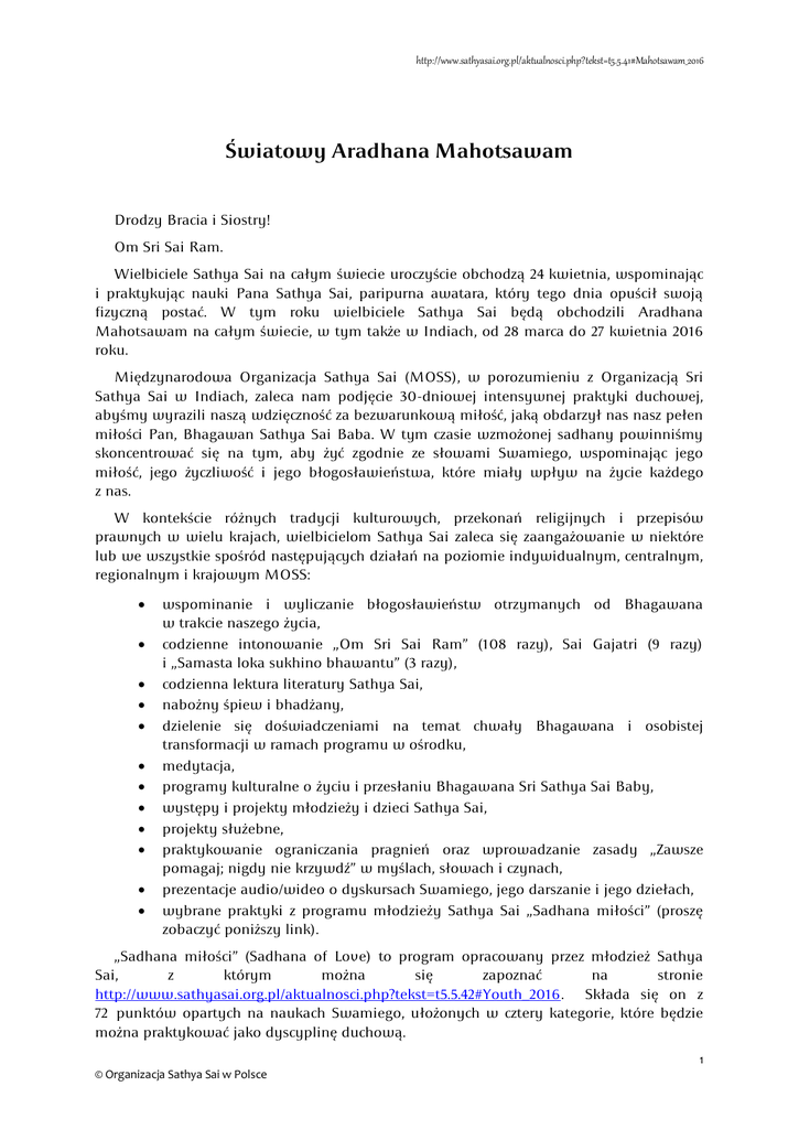 http://www.sathyasai.org.pl/aktualnosci.php?tekst=t5.5.41#Mahotsawam_2016 Światowy Aradhana Mahotsawam Drodzy Bracia i Siostry! Om Sri Sai Ram. Wielbiciele Sathya Sai na całym świecie uroczyście obchodzą 24 kwietnia, wspominając i praktykując nauki Pana Sathya Sai, paripurna awatara, który tego dnia opuścił swoją fizyczną postać. W tym roku wielbiciele Sathya Sai będą obchodzili Aradhana Mahotsawam na całym świecie, w tym także w Indiach, od 28 marca do 27 kwietnia 2016 roku. Międzynarodowa Organizacja Sathya Sai (MOSS), w porozumieniu z Organizacją Sri Sathya Sai w Indiach, zaleca nam podjęcie 30-dniowej intensywnej praktyki duchowej, abyśmy wyrazili naszą wdzięczność za bezwarunkową miłość, jaką obdarzył nas nasz pełen miłości Pan, Bhagawan Sathya Sai Baba. W tym czasie wzmożonej sadhany powinniśmy skoncentrować się na tym, aby żyć zgodnie ze słowami Swamiego, wspominając jego miłość, jego życzliwość i jego błogosławieństwa, które miały wpływ na życie każdego z nas. W kontekście różnych tradycji kulturowych, przekonań religijnych i przepisów prawnych w wielu krajach, wielbicielom Sathya Sai zaleca się zaangażowanie w niektóre lub we wszystkie spośród następujących działań na poziomie indywidualnym, centralnym, regionalnym i krajowym MOSS: wspominanie i wyliczanie błogosławieństw otrzymanych od Bhagawana w trakcie naszego życia, codzienne intonowanie „Om Sri Sai Ram” (108 razy), Sai Gajatri (9 razy) i „Samasta loka sukhino bhawantu” (3 razy), codzienna lektura literatury Sathya Sai, nabożny śpiew i bhadżany, dzielenie się doświadczeniami na temat chwały Bhagawana i osobistej transformacji w ramach programu w ośrodku, medytacja, programy kulturalne o życiu i przesłaniu Bhagawana Sri Sathya Sai Baby, występy i projekty młodzieży i dzieci Sathya Sai, projekty służebne, praktykowanie ograniczania pragnień oraz wprowadzanie zasady „Zawsze pomagaj; nigdy nie krzywdź” w myślach, słowach i czynach, prezentacje audio/wideo o dyskursach Swamiego, jego darszanie i jego dziełach, wybrane praktyki z programu młodzieży Sathya Sai „Sadhana miłości” (proszę zobaczyć poniższy link). „Sadhana miłości” (Sadhana of Love) to program opracowany przez młodzież Sathya Sai, z którym można się zapoznać na stronie http://www.sathyasai.org.pl/aktualnosci.php?tekst=t5.5.42#Youth_2016. Składa się on z 72 punktów opartych na naukach Swamiego, ułożonych w cztery kategorie, które będzie można praktykować jako dyscyplinę duchową. 1 © Organizacja Sathya Sai w Polsce http://www.sathyasai.org.pl/aktualnosci.php?tekst=t5.5.41#Mahotsawam_2016 Zjednoczmy się jako jedna rodzina Sai w tej szlachetnej i wzbogacającej praktyce duchowej, aby uczcić i pielęgnować pamięć o Bhagawanie Sri Sathya Sai Babie. Z jego nieskończoną łaską i błogosławieństwem wysławiajmy naszego Pana i uświęcajmy nasze życie żyjąc w miłości i czyniąc bezinteresowną służbę aż do ostatniego tchnienia. Dżej Sai Ram! Z pełnymi miłości pozdrowieniami dr Narendranath Reddy (M.D.) Przewodniczący Rady Prasanthi (dk) Źródło: http://www.sathyasai.org/announcement/2016-aradhana-mahotsavam 2 © Organizacja Sathya Sai w Polsce