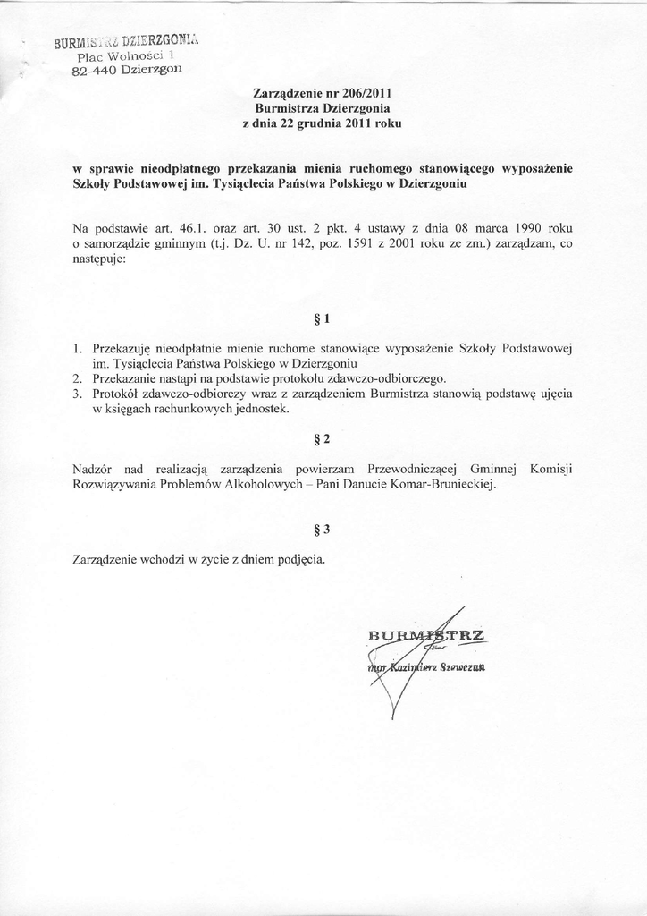 ; ri[ IreffiRZGoNt; BURM1ii Plac Wolnosci I 82-440 Dzierzgon' Zarzapdzenie nr 206| 20ll Burmistrza Dzierzgonia z dnia 22 grudnia 2011roku w sprawie nieodplatnegoprzekazania mienia ruchomego stanowi4cegowyposa2enie SzkolyPodstawowejim. Tysi4cleciaPafistwaPolskiegow Dzierzgoniu Na podstawieart. 46.1. orM art. 30 ust. 2 pkt. 4 ustawy z dnia 08 marca 1990 roku gminnym (tj. Dz. U. w 142, poz. 1591z 2001 roku ze zm.) zarzqdzam, co o samorz4dzie nastEpuj e: s1 1. Przekazujpnieodplatniemienie ruchomestanowiecewlposarzenieSzkoly Podstawowej im. Tysi4cleciaParistwaPolskiegow Dzierzgoniu 2. Przekazanie nast4pina podstawieprotokoluzdawczo-odbiorczego. wraz z zarzqdzeniem Burmistrzastanowi4podstawEujgcia 3. Protok6lzdawczo-odbiorczy jednostek. w ksiggachrachunkowych s2 Nadz6r nad realizacjq zanqdzenia powierzam Przewodnicz4cej Gminnej Rozwi4zl'wania Problem6w Alkoholowych - Pani Danucie Komar-Brunieckiej. s3 Zanqdzeniewchodziw Lryciez dniempodjgcia. R: Komisji lJrzQd Miejski w Dzierzgoniu Plac WolnoSci 1,82-440 Dzierzgoir tel. 552762612,552762501fax. 552762257,e-mail: [email protected], wrvw.dzierzgon.pl,wrrrv.dzierzgon.samorzady.pl PROTOKOT,ZDAW CZO-ODBIORCZY 1 roku,pomigdzy: w dnfu22.12.201 sporzqdzony Gminq Dzierzgof, Plac WolnoScil, 82-440Dzierugofircprezentowanqprzez: - BurmistrzaDzierzgonia - KazimierzaSzewczuna zwanqdalej przekazuj4cym Szkol4Podstawow4im. Tysi4cleciaParistwaPolskiego,ul. Krzywa 17, 82-440Dzietzgoh reprezenlowanqprzez.. - SlawomiraErbera- Dyrektora zwanqdalej przyjmuj4cym Na podstawie Zarz4dzeniaw 20612011Burmistrza Dzietzgonra z dnia 22 grudnia 2011 roku w sprawie w nieodplatnegoprzekazaniamienia ruchomego stanowiqcego wyposa2enieSzkoly Podstawowejim. Tysi4clecia Paristwa Polskiego w Dzierzgoniu przekazujesiE: s1 im. Tysi4cleciaParistwaPolskiegow Dzierzgoniu: SzkolyPodstawowej WyposaZenie Nazwa towaru J.m. Ilo56 Alto TSl 12aTruesinic- kolumna aktywna12",400WRMS ( 2 1 ) U T110 6 1 0 0 1 0 5 5 3 9 NOVOX 110NH 315Zestaw UHF bezprzewodowy Odbiomik+Mikofon bezprzewodowy M.131128-3777-r 2xRCA- 2 x SL2R180-kabel Bespeco RCA,1,8. M.119622-5583-r9 - kabelJack BespecoSLYMSRSOO stereo1/8" 2 RCA, 5m, M.131128-5598-1 sn. I Warto56 brutto lzll 1. 150,00 SZt. I 250,00 szI- I 30,00 s^. 1 40,00 BespecoSLJJ600kabel inshumentalny 6m Jack mono M.131128-5275-1 szt. I 30,00 Lp. 1. 2. 3. 4. 1.s00,00 RAZEM s2 Protok6l "" tttotB Lt r*tut t jednobrzmi4cycn w dw6ch *lTt*i*f.f HZ difp2516 iiiglg-to-ers Sze rczttfl i iir l il'i,1. l,',.'. li2-;+i{} i ),, rciTgtr I'l:rr:l,Vs)liit!ci I itilLON \1(Y//i7a31 t.l I t' !t-l()-1l-ir]97O ! dla kazdej mgr Sla it Erher