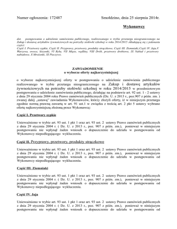 Numer ogłoszenia: 172487 Smołdzino, dnia 25 sierpnia 2014r. Wykonawcy dot. postępowania o udzielenie zamówienia publicznego, realizowanego w trybie przetargu nieograniczonego na Zakup i dostawę artykułów żywnościowych na potrzeby stołówki szkolnej w roku 2014/2015 składającą się z jedenastu części: Część I. Przetwory sypkie, Część II. Przyprawy, przetwory, produkty strączkowe, Część III. Ziemniaki, Część IV. Jaja,V. Warzywa, owoce, kiszonki, VI Ryby, VII Mięso, wędliny, VIII Drób, przetwory drobiowe, IX Nabiał i przetwory nabiałowe, X Mrożonki, XI Pieczywo. ZAWIADOMIENIE o wyborze oferty najkorzystniejszej o wyborze najkorzystniejszej oferty w postępowaniu o udzielenie zamówienia publicznego realizowanego w trybie przetargu nieograniczonego na Zakup i dostawę artykułów żywnościowych na potrzeby stołówki szkolnej w roku 2014/2015 w przedmiotowym postępowaniu o udzielenie zamówienia publicznego, działając na podstawie art. 92 ust. 1 - 2 ustawy z dnia 29 stycznia 2004 roku Prawo zamówień publicznych (Dz. U. z 2013 r., poz.907 z późn. zm. ) zwanej dalej „ustawą” zawiadamia Wykonawców, którzy złożyli oferty, iż w niniejszym przetargu zgodnie normą prawną zawartą w art. 91 ust.1 w związku z treścią art. 2 pkt 5 ustawy wybrano ofertę najkorzystniejszą złożoną przez Wykonawcę: Część I. Przetwory sypkie Unieważniono w trybie art. 93 ust. 1 pkt 1 oraz art. 93 ust. 2 ustawy Prawo zamówień publicznych z dnia 29 stycznia 2004 r. ( Dz. U. z 2013 r., poz. 907 z późn. zm.), ponieważ w niniejszym postępowaniu nie wpłynął żaden wniosek o dopuszczenie do udziału w postępowaniu od Wykonawcy niepodlegającego wykluczeniu. Część II. Przyprawy, przetwory, produkty strączkowe Unieważniono w trybie art. 93 ust. 1 pkt 1 oraz art. 93 ust. 2 ustawy Prawo zamówień publicznych z dnia 29 stycznia 2004 r. ( Dz. U. z 2013 r., poz. 907 z późn. zm.), ponieważ w niniejszym postępowaniu nie wpłynął żaden wniosek o dopuszczenie do udziału w postępowaniu od Wykonawcy niepodlegającego wykluczeniu. Część III. Ziemniaki Unieważniono w trybie art. 93 ust. 1 pkt 1 oraz art. 93 ust. 2 ustawy Prawo zamówień publicznych z dnia 29 stycznia 2004 r. ( Dz. U. z 2013 r., poz. 907 z późn. zm.), ponieważ w niniejszym postępowaniu nie wpłynął żaden wniosek o dopuszczenie do udziału w postępowaniu od Wykonawcy niepodlegającego wykluczeniu. Część IV. Jaja Unieważniono w trybie art. 93 ust. 1 pkt 1 oraz art. 93 ust. 2 ustawy Prawo zamówień publicznych z dnia 29 stycznia 2004 r. ( Dz. U. z 2013 r., poz. 907 z późn. zm.), ponieważ w niniejszym postępowaniu nie wpłynął żaden wniosek o dopuszczenie do udziału w postępowaniu od Wykonawcy niepodlegającego wykluczeniu. Część IV. Warzywa, owoce, kiszonki Unieważniono w trybie art. 93 ust. 1 pkt 1 oraz art. 93 ust. 2 ustawy Prawo zamówień publicznych z dnia 29 stycznia 2004 r. ( Dz. U. z 2013 r., poz. 907 z późn. zm.), ponieważ w niniejszym postępowaniu nie wpłynął żaden wniosek o dopuszczenie do udziału w postępowaniu od Wykonawcy niepodlegającego wykluczeniu. Część VI. Ryby Unieważniono w trybie art. 93 ust. 1 pkt 1 oraz art. 93 ust. 2 ustawy Prawo zamówień publicznych z dnia 29 stycznia 2004 r. ( Dz. U. z 2013 r., poz. 907 z późn. zm.), ponieważ w niniejszym postępowaniu nie wpłynął żaden wniosek o dopuszczenie do udziału w postępowaniu od Wykonawcy niepodlegającego wykluczeniu. Część VII. Mięso, wędliny Wykonawca – Firma Produkcyjno Handlowo Usługowa ,, Dzióbek”, Justyna Cyman, 84-311 Bukowina 64a W uzasadnieniu niniejszego wyboru należy wskazać, iż wybrana oferta jest ofertą najkorzystniejszą spełniającą wszystkie wymogi SIWZ i przedstawia najniższą cenę, która była jedynym kryterium wyboru oferty najkorzystniejszej. Cena za w/w przedmiot zamówienia (łącznie z podatkiem VAT): 27 986.10 zł Przyznana ilość punktów: 70 pkt Jednocześnie Zamawiający zawiadamia, iż w niniejszym przetargu dot. części II w terminie do składania ofert złożono 1 ofertę. Przewidywany termin podpisania umowy: 28 sierpnia 2014r. W toku badania i oceny wykluczono i odrzucono ofert:0 Część VII. Drób, przetwory drobiowe Wykonawca – Firma Produkcyjno Handlowo Usługowa ,, Dzióbek”, Justyna Cyman, 84-311 Bukowina 64a W uzasadnieniu niniejszego wyboru należy wskazać, iż wybrana oferta jest ofertą najkorzystniejszą spełniającą wszystkie wymogi SIWZ i przedstawia najniższą cenę, która była jedynym kryterium wyboru oferty najkorzystniejszej. Cena za w/w przedmiot zamówienia (łącznie z podatkiem VAT): 8 697.80 zł Przyznana ilość punktów: 70 pkt Jednocześnie Zamawiający zawiadamia, iż w niniejszym przetargu dot. części II w terminie do składania ofert złożono 1 ofertę. Przewidywany termin podpisania umowy: 28 sierpnia 2014r. W toku badania i oceny wykluczono i odrzucono ofert:0 Część IX. Nabiał i przetwory nabiałowe Unieważniono w trybie art. 93 ust. 1 pkt 1 oraz art. 93 ust. 2 ustawy Prawo zamówień publicznych z dnia 29 stycznia 2004 r. ( Dz. U. z 2013 r., poz. 907 z późn. zm.), ponieważ w niniejszym postępowaniu nie wpłynął żaden wniosek o dopuszczenie do udziału w postępowaniu od Wykonawcy niepodlegającego wykluczeniu. Część X. Mrożonki Unieważniono w trybie art. 93 ust. 1 pkt 1 oraz art. 93 ust. 2 ustawy Prawo zamówień publicznych z dnia 29 stycznia 2004 r. ( Dz. U. z 2013 r., poz. 907 z późn. zm.), ponieważ w niniejszym postępowaniu nie wpłynął żaden wniosek o dopuszczenie do udziału w postępowaniu od Wykonawcy niepodlegającego wykluczeniu. Część XI. Pieczywo Wykonawca – Piekarnia - Ciastkarnia ,,Duet”, Janusz Cymek, Roman Jedynak ul. Kościuszki 4,76-213 Gardna Wielka W uzasadnieniu niniejszego wyboru należy wskazać, iż wybrana oferta jest ofertą najkorzystniejszą spełniającą wszystkie wymogi SIWZ i przedstawia najniższą cenę, k