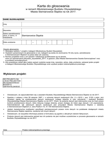 Karta do głosowania w ramach Młodzieżowego Budżetu Obywatelskiego Miasta Siemianowice Śląskie na rok 2017. DANE GŁOSUJĄCEGO Imię Nazwisko Adres zameldowania: ulica, nr domu, nr mieszkania Siemianowice Śląskie - Data urodzenia - Zasady głosowania: 1. Głosujący wybiera 1 projekt z kategorii Młodzieżowy Budżet Obywatelski. 2. Osobami uprawnionymi do głosowania w ww. kategorii są osoby do ukończenia 18 roku życia, zameldowane w Siemianowicach Śląskich na pobyt stały lub czasowy. 3. Numery projektów wraz z ich opisami i lokalizacją opublikowane są na stronie www.um.siemianowice.pl/budzet_obywatelski_2017, w gazecie „Głos Miasta Siemianowicka Gazeta Samorządowa” oraz w punktach konsultacyjnych. 5. Aby prawidłowo oddać głos należy wpisać czytelnie swoje imię, nazwisko, adres, datę urodzenia, wskazać jeden projekt w kategorii Młodzieżowego Budżetu Obywatelskiego oraz uzyskać podpis rodzica/opiekuna prawnego. Wybieram projekt: NR PROJEKTU NA LIŚCIE PROJEKTÓW MŁODZIEŻOWEGO BUDŻETU OBYWATELSKIEGO Oświadczam, że zapoznałem/łam się z zasadami Budżetu Obywatelskiego Miasta Siemianowice Śląskie na rok 2017. Zgodnie z ustawą z dnia 29 sierpnia 1997 r. o ochronie danych osobowych (Dz. U z 2015 r. poz. 2135 z późn. zm) wyrażam zgodę na przetwarzanie danych osobowych mojego dziecka w celu wdrożenia i realizacji Budżetu Obywatelskiego Miasta Siemianowice Śląskie na rok 2017. Wiem, że podanie danych jest dobrowolne oraz że mam prawo kontroli przetwarzania danych, które dotyczą mojego dziecka, prawo dostępu do treści jego danych i ich poprawiania. Administratorem tak zebranych danych osobowych jest prezydent Miasta Siemianowice Śląskie z siedzibą w Siemianowicach Śląskich ul. Jana Pawła II 10, 41-100 Siemianowice Śląskie. Jestem świadomy/ma możliwości weryfikacji zamieszczonych przeze mnie danych na podstawie dostępnych miastu Siemianowice Śląskie rejestrów, ewidencji lub innych danych. Oświadczam, że wszystkie informacje podane w formularzu są zgodne z aktualnym stanem faktycznym. Podanie danych jest dobrowolne jednak bez ich podania nie jest możliwe uczestnictwo w procesie głosowania w ramach Budżetu Obywatelskiego na rok 2017. Data Podpis rodzica/opiekuna prawnego Projekty Młodzieżowego Budżetu Obywatelskiego 2017 Numer projektu (w kolejności wpływu do UM) Nazwa projektu Imię i nazwisko wnioskodawcy Wnioskowana kwota Opis projektu 3 Strefa gier przy Szkole Podstawowej nr 3 Maja Posmyk 50.000,00 Utworzenie strefy gier przy Szkole Podstawowej nr 3 4 Siłownia na wolnym powietrzu Martin Didkowski 50.000,00 Utworzenie siłowni na wolnym powietrzu przy Zespole Szkół Ponadgimnazjalnych "Cogito" 50.000,00 Położenie kostki brukowej, wygospodarowanie miejsc parkingowych, montaż ławek, odnowienie terenu trawiastego przy Zespole Szkół Katolickich 49.999,00 Sala multimedialna w Szkole Podstawowej nr 6 w Siemianowicach Śląskich 6 Rekultywacja terenu przed szkołą (ul. 1 Maja) 7 Utworzenie sali multimedialnej w Szkole Podstawowej nr 6 Paulina Brandy Natalia Być 9 Radosny ogród bez barier Julia Kuć 32.000,00 Doposażenie placu zabaw w zestaw integracyjny przy Przedszkolu nr 19 10 Park Linowy Przełajka Franciszek LewWostal 145.352,05 Utworzenie Parku Linowego na Przełajce 11 Ścieżka sprawnościowo-rekreacyjna Alicja Kaps 49.802,70 Ścieżka sprawnościowo-rekreacyjna przy Szkole Podstawowej nr 1 12 Siłownia pod chmurką przy SP. nr 5 Sylwia Drożdż 50.000,00 Budowa siłowni przy SP. nr 5 13 Modernizacja boiska "Puma", zamontowanie stołów do szachów oraz piramid do wspinaczki na osiedlu Robotniczym w Michałkowicach Tomasz Szafarczyk 197.271,52 Modernizacja boiska "Puma", na osiedlu Robotniczym w Michałkowicach 14 Siłownia "Pod Czwórką" Krzysztof Domżoł, Michał Blacha 49.421,00 Siłownia przy Zespole Szkół nr 4 22.600,00 Utworzenie sali kinowej w Zespole Szkół Ogólnokształcących i Zawodowych w Siemianowicach Śląskich przy ul. Budryka 2 170.000,00 Budowa Młodzieżowego Kompleksu IntegracyjnoSportowego "Rzęsa" ul. Spacerowa 15 16 Utworzenie sali kinowej w Zespole Szkół Ogólnokształcących i Zawodowych Joanna Długajczyk w Siemianowicach Śląskich przy ul. Budryka 2 Młodzieżowy Kompleks IntegracyjnoSportowy "Rzęsa" ul. Spacerowa Julia Lewicka