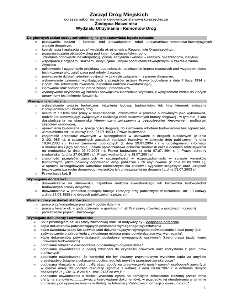 Zarząd Dróg Miejskich ogłasza nabór na wolne kierownicze stanowisko urzędnicze Zastępca Naczelnika Wydziału Utrzymania i Remontów Dróg Do głównych zadań osoby zatrudnionej na tym stanowisku będzie naleŜało: • planowanie, nadzór i kontrola nad prowadzeniem robót utrzymaniowo-remontowo-inwestycyjnych w pasie drogowym, • koordynacja i realizacja zadań wydziału określonych w Regulaminie Organizacyjnym, • przeprowadzanie objazdów dróg pod kątem bezpieczeństwa ruchu, udzielanie odpowiedzi na interpelację, pisma, zapytania i wnioski – radnych, mieszkańców, instytucji • współpraca z organami, słuŜbami, instytucjami i innymi podmiotami zewnętrznymi w zakresie zadań Wydziału • opiniowanie i uzgadnianie projektów budowlanych, opiniowanie imprez masowych pod względem stanu technicznego ulic, zajęć pasa pod roboty drogowe, • prowadzenie działań administracyjnych w zakresie związanym z pasem drogowym, • wykonywanie czynności wynikających z przepisów ustawy Prawo budowlane z dnia 7 lipca 1994 r. z późn. zm. (obowiązki inwestora, inspektora nadzoru inwestorskiego), • kierowanie oraz nadzór nad pracą zespołu pracowników, • wykonywanie czynności wg zakresu obowiązków Naczelnika Wydziału, z wyłączeniem zadań do których uprawniony jest imiennie Naczelnik. Wymagania konieczne: • wykształcenie wyŜsze techniczne: inŜynieria lądowa, budownictwo lub inny kierunek związany z projektowaniem i budową dróg • minimum 10 letni staŜ pracy w bezpośrednim uczestnictwie w procesie budowlanym jako wykonawca, nadzór lub zamawiający, związanym z realizacją robót budowlanych branŜy drogowej - w tym min. 3 lata doświadczenia na stanowisku kierowniczym związanym z bezpośrednim kierowaniem podległym zespołem osobowym, • uprawnienia budowlane w specjalności drogowej do kierowania robotami budowlanymi bez ograniczeń, w rozumieniu art. 14 ustawy z dn. 07.07.1994 r. Prawo budowlane • znajomość przepisów zawartych w szczególności w ustawach: o drogach publicznych (z dnia 21.03.1985 r.), o szczególnych zasadach realizacji inwestycji w zakresie dróg publicznych (z dnia 10.04.2003 r.), Prawo zamówień publicznych (z dnia 29.01.2004 r.), o udostępnieniu informacji o środowisku i jego ochronie, udziale społeczeństwa ochronie środowisk oraz o ocenach oddziaływania na środowisko (z dnia 03.10.2008 r.), Prawo budowlane (z dnia 07.07.1994 r. ), Prawo ochrony środowiska (z dnia 27.04.2001 r.), Prawo wodne (z dnia 18.07.2001 r.) • znajomość przepisów zawartych w szczególności w rozporządzeniach: w sprawie warunków technicznych, jakim powinny odpowiadać drogi publiczne i ich usytuowanie (z dnia 02.03.1999 r.), w sprawie szczegółowych warunków technicznych dla znaków i sygnałów drogowych oraz urządzeń bezpieczeństwa ruchu drogowego i warunków ich umieszczania na drogach ( z dnia 03.07.2003 r.) • Prawo jazdy kat. B Wymagania dodatkowe: • doświadczenie na stanowisku inspektora nadzoru inwestorskiego lub kierownika budowy/robót budowlanych branŜy drogowej • doświadczenie w jednostce pełniącej funkcje zarządcy dróg publicznych w rozumieniu art. 19 ustawy z dnia 21.03.1985 r. o drogach publicznych z późn. zm. Warunki pracy na danym stanowisku: • praca przy komputerze powyŜej 4 godzin dziennie • praca w terenie ok. 4 godz. dziennie, w granicach m.st. Warszawy (równieŜ w godzinach nocnych) • prowadzenie pojazdu słuŜbowego Wymagane dokumenty i oświadczenia: • CV z przebiegiem nauki i pracy zawodowej oraz list motywacyjny – podpisane odręcznie • kopie dokumentów potwierdzających posiadanie wymaganego wykształcenia • kopie świadectw pracy lub zaświadczeń dokumentujących wymagane doświadczenie i staŜ pracy (lub zaświadczenie o zatrudnieniu z aktualnego miejsca pracy potwierdzające ww. wymagania), • kopie dokumentów potwierdzających posiadanie wymaganych uprawnień (ksero prawa jazdy, ksero uprawnień budowlanych) • podpisane odręcznie oświadczenie o posiadanym obywatelstwie* • podpisane oświadczenie o pełnej zdolności do czynności prawnych oraz korzystaniu z pełni praw publicznych* • podpisane oświadczenie, Ŝe kandydat nie był skazany prawomocnym wyrokiem sądu za umyślne przestępstwo ścigane z oskarŜenia publicznego lub umyślne przestępstwo skarbowe* • podpisana klauzula o treści : „WyraŜam zgodę na przetwarzanie moich danych osobowych zawartych w ofercie pracy dla potrzeb rekrutacji, zgodnie z ustawą z dnia 29.08.1997 r. o ochronie danych osobowych (t. j. Dz. U. z 2015 r., poz. 2135 ze zm.)” * • podpisane oświadczenie o treści: „wyraŜam zgodę na komisyjne zniszczenie złoŜonej przeze mnie oferty na stanowisko...........(wraz z kserokopiami dokumentów), w przypadku jej nieodebrania w terminie 6. miesięcy od upowszechnienia w Biuletynie Informacji Publicznej informacji o wyniku naboru* 1 • • • osoba wybrana do zatrudnienia będzie zobowiązana do przedstawienia oryginału aktualnego „Zapytania o udzielenie informacji o osobie” z Krajowego Rejestru Karnego dodatkowo moŜna złoŜyć referencje, rekomendacje, kopie dokumentów potwierdzających posiadanie uprawnień i umiejętności przydatnych na danym stanowisku kserokopia dokumentu potwierdzającego niepełnosprawność w przypadku kandydata zamierzającego skorzystać z uprawnienia, o którym mowa w art. 13a ust. 2 ustawy z dnia 21 listopada 2008 r. o pracownikach samorządowych (Dz.U.2014.1202). Wskaźnik zatrudnienia osób niepełnosprawnych w kwietniu 2016 r. wyniósł mniej niŜ 6% Osoby zainteresowane prosimy o składanie kompletu dokumentów w zamkniętej kopercie osobiście w kancelarii ZDM lub przesłanie pocztą na poniŜszy adres do dnia 06.06.2016 r. Zarząd Dróg Miejskich Wydział Spraw Pracowniczych ul. Chmielna 120, 00-801 Warszawa tel. 22 5589228, 22 5589160 z dopiskiem na kopercie: „08/K/2016 – zastępca naczelnika wydziału - Wydział Utr