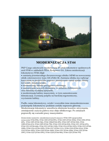 MODERNIZACJA ST44 PKP Cargo zakończyło modernizację 25 sztuk lokomotyw spalinowych serii ST44 w zakładach PESA Bydgoszcz SA. Zakres modernizacji lokomotywy ST44 objął: • zamianę przestarzałego dwusuwowego silnika 14D40 na nowoczesny silnik czterosuwowy typu 12CzN26/26. Zamiana silnika ma wpłynąć korzystnie na środowisko poprzez zmniejszenie emisji spalin, obniŜy teŜ koszty eksploatacyjne, • modernizację układu pociągowo-zderznego, • zastosowanie nowych elementów w układzie elektrycznym oraz bardziej wydajnej spręŜarki, • modernizację kabiny maszynisty, w tym zamontowanie klimatyzacji, wymianę pulpitu na bardziej ergonomiczny, wyciszenie kabiny. Pudło, rama lokomotywy, wózki i wszystkie inne niemodernizowane podzespoły lokomotywy poddane zostały naprawie głównej. Modernizacja lokomotyw umoŜliwia obniŜenie kosztów utrzymania, zmniejszenie zuŜycia paliwa oraz oleju silnikowego. Po zmianach poprawiły się warunki pracy maszynistów. Zestawienie numerów zmodernizowanych maszyn: ST44-1201 (poprzednie oznaczenie ST44-894), ST44-1202 (ST44-891), ST44-1203 (ST44-1024), ST44-1204 (ST44405), ST44-1205 (ST44-546), ST44-1206(ST44-495), ST44-1207 (ST44-543), ST441208 (ST44-613), ST44-1209 (ST44-758), ST44-1210 (ST44-818), ST44-1211 (ST44-651), ST44-1212 (ST44-644), ST44-1213 (ST44-1100), ST44-1214 (ST44-1023), ST44-1215 (ST441090), ST44-1216 (ST44-1092), ST44-1217 (ST44-1111), ST44-1218 (ST44-1014), ST441219 (ST44-1093), ST44-1220 (ST44-1049), ST44-1221 (ST44-1094), ST44-1222 (ST441097), ST44-1223 (ST44-1091), ST44-1224 (ST44-966), ST44-1225 (ST44-793)