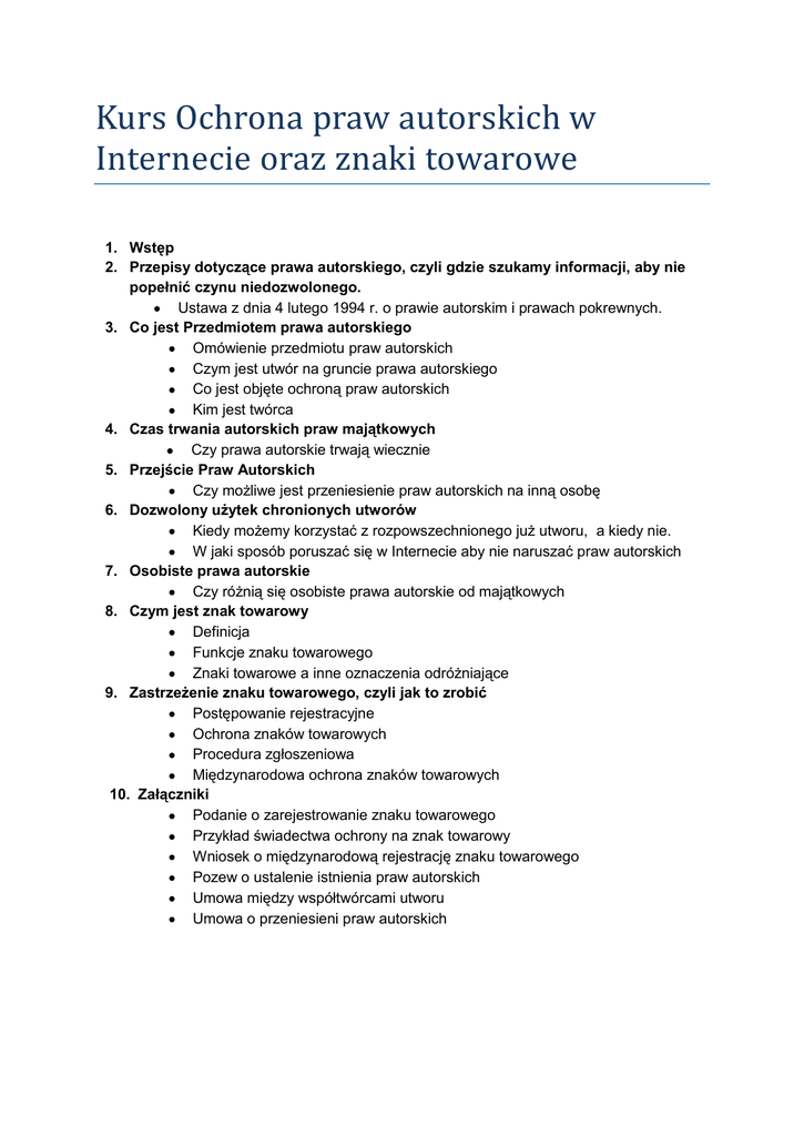 Kurs Ochrona praw autorskich w Internecie oraz znaki towarowe 1. Wstęp 2. Przepisy dotyczące prawa autorskiego, czyli gdzie szukamy informacji, aby nie popełnić czynu niedozwolonego. Ustawa z dnia 4 lutego 1994 r. o prawie autorskim i prawach pokrewnych. 3. Co jest Przedmiotem prawa autorskiego Omówienie przedmiotu praw autorskich Czym jest utwór na gruncie prawa autorskiego Co jest objęte ochroną praw autorskich Kim jest twórca 4. Czas trwania autorskich praw majątkowych Czy prawa autorskie trwają wiecznie 5. Przejście Praw Autorskich Czy możliwe jest przeniesienie praw autorskich na inną osobę 6. Dozwolony użytek chronionych utworów Kiedy możemy korzystać z rozpowszechnionego już utworu, a kiedy nie. W jaki sposób poruszać się w Internecie aby nie naruszać praw autorskich 7. Osobiste prawa autorskie Czy różnią się osobiste prawa autorskie od majątkowych 8. Czym jest znak towarowy Definicja Funkcje znaku towarowego Znaki towarowe a inne oznaczenia odróżniające 9. Zastrzeżenie znaku towarowego, czyli jak to zrobić Postępowanie rejestracyjne Ochrona znaków towarowych Procedura zgłoszeniowa Międzynarodowa ochrona znaków towarowych 10. Załączniki Podanie o zarejestrowanie znaku towarowego Przykład świadectwa ochrony na znak towarowy Wniosek o międzynarodową rejestrację znaku towarowego Pozew o ustalenie istnienia praw autorskich Umowa między współtwórcami utworu Umowa o przeniesieni praw autorskich