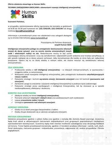 Oferta szkolenia otwartego w Human Skills: TECHNIKI ZARZĄDZANIA EMOCJAMI z elementami rozwoju inteligencji emocjonalnej Szanowni Państwo, w przypadku zainteresowania ofertą zapraszamy do kontaktu w godzinach od 8:30 do 16:30 pod numerem tel. (22) 2242195, (22) 2242196 lub drogą mailową [email protected] Informacje o prowadzonych przez nas szkoleniach oraz usługach dostępne są na stronie internetowej www.humanskills.pl Pozostajemy do Państwa dyspozycji, zespół Human Skills Inteligencja emocjonalna polega na umiejętności dostosowania własnych emocji do danej sytuacji oraz na ocenie stanów emocjonalnych innych osób i właściwych reakcji na nie. Niekoniecznie muszą to być cechy uspokajające własną nerwowość. Liczy się samokontrola- odpowiedni punkt widzenia oraz trzeźwa weryfikacja, w jaki sposób najlepiej się w danej sytuacji zachować, żeby konsekwencje dla każdej ze stron były jak najbardziej pozytywne. Opiera się to na dużej wiedzy o samym sobie, ale można nauczyć się świadomości własnej emocjonalności. CELE SZKOLENIA Przekazanie wiedzy o roli inteligencji emocjonalnej – w relacjach interpersonalnych, w wyznaczaniu i osiąganiu celów, w samorozwoju. Wskazanie zasad rozwijania inteligencji emocjonalnej, jako umiejętności budowania satysfakcjonujących relacji z ludźmi. Pokazanie strategii i technik wyrażania emocji, kierowania emocjami oraz ich kontroli (panowania nad emocjami). Zwrócenie uwagi na znaczenie i używanie inteligencji Emocjonalnej w praktyce życia codziennego. Pokazanie strategii pracy wynikających z inteligencji Emocjonalnej, tak by stosować ją w sposób nieskomplikowany, efektywny i skuteczny. KORZYŚCI DLA UCZESTNIKÓW Zdobycie wiedzy na temat inteligencji emocjonalnej. Poznanie własnych mocnych i słabych stron oraz podstawowych cech osobowości. Lepsze zrozumienie siebie i innych. Umiejętne panowanie nad własnymi emocjami. ADRESACI SZKOLENIA Osoby na co dzień pracujące bezpośrednio z ludźmi. Osoby chcące doskonalić się w zakresie zarządzania emocjami. METODA SZKOLENIOWA Szkolenie prowadzone zgodnie z cyklem Kolba oraz zgodnie z metodą ABL (Activity Based Learning). Uczestnicy będą brali udział w aktywizujących ćwiczeniach indywidualnych oraz grupowych poprzedzonych niezbędnym wprowadzeniem teoretycznym. Uczestnicy będą mieli również możliwość autodiagnozy oraz otrzymają feedback od trenera. Trener będzie przedstawiał merytorykę zgodnie z 3 kanałami przekazu informacji – wzrok, ruch, słuch. Panel dyskusyjny, ćwiczenia grupowe i indywidualne, prezentacja, odgrywanie ról, analiza przypadków i filmów poglądowych. 1 Oferta szkolenia otwartego w Human Skills: TECHNIKI ZARZĄDZANIA EMOCJAMI z elementami rozwoju inteligencji emocjonalnej PROGRAM SZKOLENIA: TECHNIKI ZARZĄDZANIA EMOCJAMI z elementami rozwoju inteligencji emocjonalnej 09:30 – 10:00 Rozpoczęcie szkolenia, kontrakt, omówienie celów szkolenia i potrzeb uczestników. 10:00 - 11:30 Techniki zarządzania emocjami – samoświadomość. Inteligencja emocjonalna a emocje podstawowe. Ćwiczenie rozpoznawania emocji podstawowych. Diady emocjonalne R.Plutchnik w zarządzaniu emocjami. Omówienie. Cztery kroki zarządzania emocjami. Omówienie. Czułe punkty a zarządzanie emocjami. Ćwiczenie indywidualne, omówienie. Wpływ emocji na neurobiologię. Omówienie casu. Trzy mózgi człowieka a zarządzanie emocjami. Omówienie teorii P.MacLeana. Budowanie świadomości jak uczymy się wyrażania emocji. Omówienie. Różnice indywidualne w postrzeganiu i zarządzaniu emocjami. Omówienie. Emocje w naszym ciele – ich rola, pozytywna i zabójcza. 11:30 – 11:45 Przerwa 11:45 – 13:00 Techniki zarządzania emocjami – komunikacja i budowanie relacji. Komunikacja interpersonalna z określonymi typami osobowości a zarządzanie emocjami. Omówienie i ćwiczenia praktyczne. Budowanie zdrowych i spokojnych relacji z określonymi typami osobowości. Ćwiczenie indywidualne. 11:00-11:15 Przerwa 11:15 – 12: 50 Techniki zarządzania emocjami –narzędzia do radzenie sobie z emocjami w pracy. Ćwiczenie związane z rozpoznawaniem stanu wewnętrznego a zarządzania emocjami. Fakt czy przekonanie z zarządzaniu emocjami. Ćwiczenie. Omówienie. Ćwiczenia praktyczne związane z zarzadzaniem emocjami: podwójna dysocjacja, ćwiczenie mentalne, helikopter, RTZ, technika stop. Techniki czyszczenia emocji. Techniki kontroli emocji – depresji, lęku, złości, 12:50 – 13:50 Przerwa na obiad 13:50 – 16:00 Techniki zarządzania emocjami –narzędzia do radzenie sobie z emocjami w pracy. Umiejętność wyrażania swoich opinii, oczekiwań i potrzeb a zarządzania emocjami. Techniki rozumienia emocji innych osób. Techniki opanowania emocji podczas konfliktów. Ćwiczenia fizyczne rozładowujące zdenerwowanie, gniew, złość, smutek, poczucie obciążenia. 16:00 – 16:30 Podsumowanie szkolenia, sporządzenie indywidualnych planów rozwoju. 2 Oferta szkolenia otwartego w Human Skills: TECHNIKI ZARZĄDZANIA EMOCJAMI z elementami rozwoju inteligencji emocjonalnej „Tak jak istnieje strumień myśli, tak też istnieje równoległy do niego strumień uczuć. Pogląd, że istnieje „czysta myśl”, wyprana zupełnie z uczucia, jest złudzeniem, fikcją, będącą wynikiem niezauważania subtelnych zmian nastroju, którym podlegamy przez cały dzień. Mamy stosunek uczuciowy do wszystkiego, co robimy, myślimy, wyobrażamy sobie i przypominamy. Myśli i uczucia są ze sobą nierozerwalnie splecione”. Daniel Goleman TERMINY: zgodnie z harmonogramem. PROFIL TRENERA: przesyłamy jako dodatkowy załącznik. CENA STAŁA: 690 zł netto (+23% vat)= 848, 70 zł brutto. Zwolnienie z VAT – jeżeli szkolenie będzie opłacone w 70% lub w całości ze środków publicznych. CENA ZAWIERA: 1. Szkolenie prowadzone przez praktyka z wieloletnim doświadczeniem. 2. Materiały szkoleniowe w formie książki szkoleniowej zawierającej merytorykę, ćwiczeni