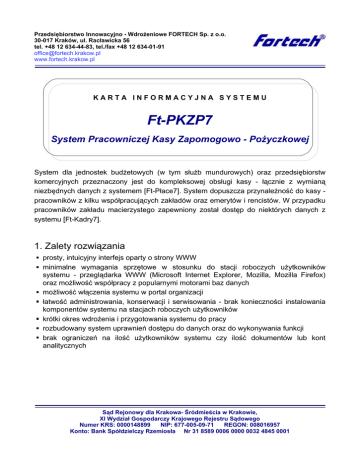 Przedsiębiorstwo Innowacyjno - Wdrożeniowe FORTECH Sp. z o.o. 30-017 Kraków, ul. Racławicka 56 tel. +48 12 634-44-83, tel./fax +48 12 634-01-91 [email protected] www.fortech.krakow.pl KARTA INFORMACYJNA SYSTEMU Ft-PKZP7 System Pracowniczej Kasy Zapomogowo - Pożyczkowej System dla jednostek budżetowych (w tym służb mundurowych) oraz przedsiębiorstw komercyjnych przeznaczony jest do kompleksowej obsługi kasy - łącznie z wymianą niezbędnych danych z systemem [Ft-Płace7]. System dopuszcza przynależność do kasy pracowników z kilku współpracujących zakładów oraz emerytów i rencistów. W przypadku pracowników zakładu macierzystego zapewniony został dostęp do niektórych danych z systemu [Ft-Kadry7]. 1. Zalety rozwiązania prosty, intuicyjny interfejs oparty o strony WWW minimalne wymagania sprzętowe w stosunku do stacji roboczych użytkowników systemu - przeglądarka WWW (Microsoft Internet Explorer, Mozilla, Mozilla Firefox) oraz możliwość współpracy z popularnymi motorami baz danych możliwość włączenia systemu w portal organizacji łatwość administrowania, konserwacji i serwisowania - brak konieczności instalowania komponentów systemu na stacjach roboczych użytkowników krótki okres wdrożenia i przygotowania systemu do pracy rozbudowany system uprawnień dostępu do danych oraz do wykonywania funkcji brak ograniczeń na ilość użytkowników systemu czy ilość dokumentów lub kont analitycznych Sąd Rejonowy dla Krakowa- Śródmieścia w Krakowie, XI Wydział Gospodarczy Krajowego Rejestru Sądowego Numer KRS: 0000148899 NIP: 677-005-09-71 REGON: 008016957 Konto: Bank Spółdzielczy Rzemiosła Nr 31 8589 0006 0000 0032 4845 0001 Przedsiębiorstwo Innowacyjno - Wdrożeniowe FORTECH Sp. z o.o. 2. Wybrana funkcjonalność systemu prowadzenie kartoteki członków kasy prowadzenie rejestru wniosków składanych przez członków kasy prowadzenie kartoteki pożyczek wprowadzania i jednoczesnego ewidencjonowania tzw. żyrantów współpraca z systemami [Ft-Kadry7] i [Ft-Płace7] rozliczanie dokumentów finansowych (księgowych) oraz wszystkich zmian stanów zadłużenia w cyklach miesięcznych możliwość wykonania wszystkich niezbędnych raportów analitycznych i syntetycznych Przykładowy fragment ekranu systemu Ft-PKZP7 Karta informacyjna systemu Ft-PKZP7 2/2
