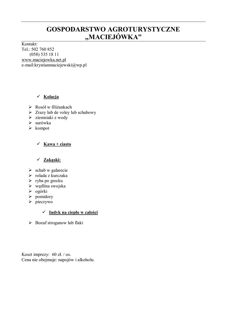 GOSPODARSTWO AGROTURYSTYCZNE „MACIEJÓWKA” Kontakt: Tel.: 502 760 852 (058) 535 18 11 www.maciejowka.net.pl e-mail:[email protected] Kolacja Rosół w filiżankach Zrazy lub de voley lub schabowy ziemniaki z wody surówka kompot Kawa + ciasto Zakąski: schab w galarecie rolada z kurczaka ryba po grecku wędlina swojska ogórki pomidory pieczywo Indyk na ciepło w całości Boeuf stroganow lub flaki Koszt imprezy: 60 zł. / os. Cena nie obejmuje: napojów i alkoholu.