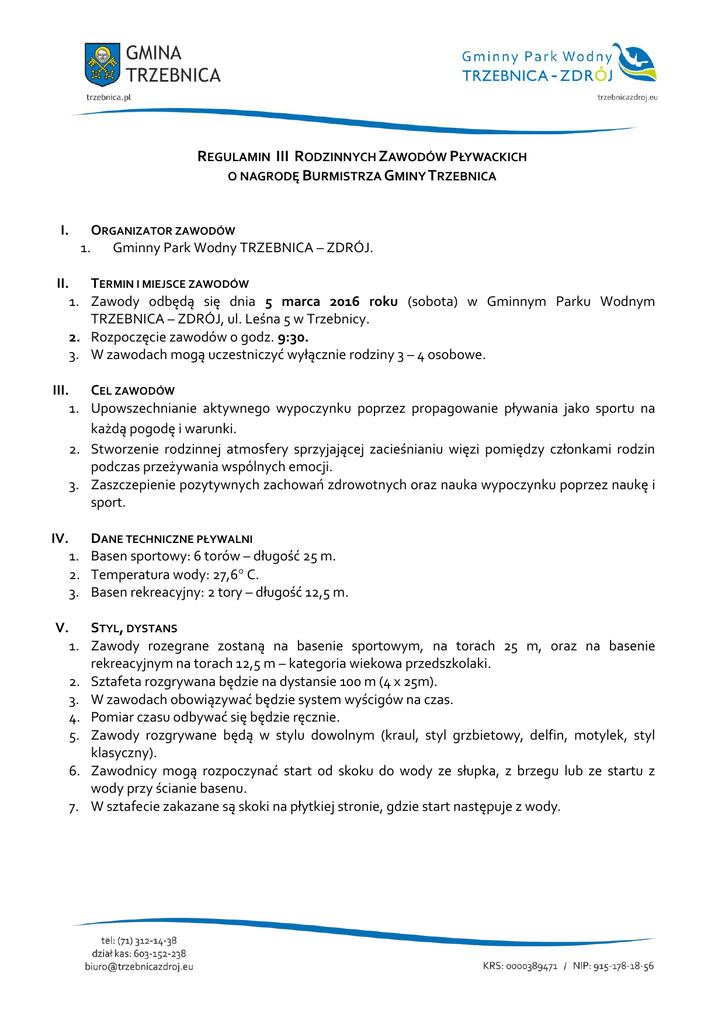 REGULAMIN III RODZINNYCH ZAWODÓW PŁYWACKICH O NAGRODĘ BURMISTRZA GMINY TRZEBNICA I. ORGANIZATOR ZAWODÓW 1. Gminny Park Wodny TRZEBNICA – ZDRÓJ. II. TERMIN I MIEJSCE ZAWODÓW 1. Zawody odbędą się dnia 5 marca 2016 roku (sobota) w Gminnym Parku Wodnym TRZEBNICA – ZDRÓJ, ul. Leśna 5 w Trzebnicy. 2. Rozpoczęcie zawodów o godz. 9:30. 3. W zawodach mogą uczestniczyć wyłącznie rodziny 3 – 4 osobowe. III. CEL ZAWODÓW 1. Upowszechnianie aktywnego wypoczynku poprzez propagowanie pływania jako sportu na każdą pogodę i warunki. 2. Stworzenie rodzinnej atmosfery sprzyjającej zacieśnianiu więzi pomiędzy członkami rodzin podczas przeżywania wspólnych emocji. 3. Zaszczepienie pozytywnych zachowań zdrowotnych oraz nauka wypoczynku poprzez naukę i sport. IV. DANE TECHNICZNE PŁYWALNI 1. Basen sportowy: 6 torów – długość 25 m. 2. Temperatura wody: 27,6 C. 3. Basen rekreacyjny: 2 tory – długość 12,5 m. V. STYL, DYSTANS 1. Zawody rozegrane zostaną na basenie sportowym, na torach 25 m, oraz na basenie rekreacyjnym na torach 12,5 m – kategoria wiekowa przedszkolaki. 2. Sztafeta rozgrywana będzie na dystansie 100 m (4 x 25m). 3. W zawodach obowiązywać będzie system wyścigów na czas. 4. Pomiar czasu odbywać się będzie ręcznie. 5. Zawody rozgrywane będą w stylu dowolnym (kraul, styl grzbietowy, delfin, motylek, styl klasyczny). 6. Zawodnicy mogą rozpoczynać start od skoku do wody ze słupka, z brzegu lub ze startu z wody przy ścianie basenu. 7. W sztafecie zakazane są skoki na płytkiej stronie, gdzie start następuje z wody. VI. 1. 2. 3. 4. 5. KATEGORIE WIEKOWE Przedszkolaki – dystans 12,5 m. I – III klasa szkoły podstawowej – dystans 25 m. IV – VI klasa szkoły podstawowej – dystans 25 m. Uczniowie do 18 roku życia – dystans 25 m. Kategoria „open” powyżej 18 roku życia – dystans 25 m. VII. KLASYFIKACJA RODZINNA Klasyfikacja rodzinna jest przez organizatorów najbardziej honorowana. O wynikach w tej klasyfikacji decydują czasy uzyskane przez sztafety rodzinne pływające w składach 3 lub 4 osobowych. W sztafecie rodzinnej mogą startować: dzieci i ich rodzice lub opiekunowie prawni. W przypadku drużyny 3 osobowej Kapitan wyznacza osobę płynącą 2 x 25 m w sztafecie. Każda z osób startujących musi posiadać umiejętności pływackie. VIII. NAGRODY 1. Zwycięzcy kategorii otrzymują nagrody: o medale i dyplomy za zajęcie I, II i III miejsca, o puchary dla I, II i III najlepszej rodziny. 2. Nagroda Burmistrza Gminy Trzebnicy wręczona zostanie dla najlepszej rodziny. IX. 1. 2. 3. KOSZTY UDZIAŁU I UBEZPIECZENIE Każdy uczestnik zawodów startuje na własny koszt. Organizator nie zwraca kosztów podróży. Opłata startowa wynosi 30 zł (opłata obejmuje koszt wejścia). Opłata musi zostać uiszczona w dniu startu, przed wejściem na teren hali basenowej. 4. Startujący może ubezpieczyć się dodatkowo we własnym zakresie. 5. Każdy uczestnik wpłacając opłatę startową oświadcza, iż startuje na własną odpowiedzialność lub do zgłoszenia dołącza odpowiednie zaświadczenie lekarskie zezwalające na udział w zawodach pływackich. X. 1. 2. 3. 4. 5. 6. PROGRAM ZAWODÓW 9:00 otwarcie biura zawodów. 9:30 otwarcie zawodów. 9:40 rozgrzewka. 9:50 start poszczególnych kategorii. 10:45 start sztafet rodzinnych. Rozdanie nagród. UWAGA! Organizator zastrzega sobie możliwość zmiany godziny startu poszczególnych konkurencji wynikającej z różnych przyczyn. Organizator zastrzega sobie prawo zmian w regulaminie. XI. ZGŁOSZENIA 1. Formularze zgłoszenia można pobrać ze strony internetowej: www.trzebnicazdroj.eu lub w stanowisku kas Gminnego Parku Wodnego TRZEBNICA – ZDRÓJ. 2. Zgłoszenia przyjmują osobiście koordynatorzy zawodów: Magdalena Ciesielska – Wojada oraz Dominika Duszak na terenie Gminnego Parku Wodnego TRZEBNICA – ZDRÓJ. 3. Wypełnione formularze można pozostawić w stanowisku kas Gminnego Parku Wodnego TRZEBNICA – ZDRÓJ lub przesłać e-mailem na adres: [email protected]. 4. Zawody odbędą się przy obecności min. 6 rodzin. Wyniki klasyfikacji indywidualnej i rodzinnej podane zostaną na stronie internetowej Gminnego Parku Wodnego TRZEBNICA – ZDRÓJ. Komisję sędziowską powołuje organizator. Wszelkie sprawy nie objęte regulaminem rozstrzyga Sędzia Główny Zawodów – Dominika Duszak.