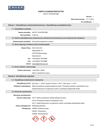 KARTA CHARAKTERYSTYKI AIR-FIT WINTERTIME Strona: 1 Data opracowania: 17.11.2014 Nr weryfikacji: 1 Sekcja 1: Identyfikacja substancji/mieszaniny i identyfikacja przedsiębiorstwa 1.1. Identyfikator produktu Nazwa produktu: AIR-FIT WINTERTIME Kod produktu: CH812xx 1.2. Istotne zidentyfikowane zastosowania substancji lub mieszaniny oraz zastosowania odradzane Zastosowanie produktu: Koncentrat zapachowy zimowy 1.3. Dane dotyczące dostawcy karty charakterystyki Nazwa firmy: Otto Christ AG Alpenstraße 75 D-87700 Memmingen Deutschland Tel.: +49-(0)8331-8574880 Fax: +49-(0)8331-8574888 Email: [email protected] 1.4. Numer telefonu alarmowego Telefon alarmowy: +49-(0)761-19240 (tylko w godzinach pracy) Sekcja 2: Identyfikacja zagrożeń 2.1. Klasyfikacja substancji lub mieszaniny Klasyfikacja (CLP): Eye Dam. 1: H318; Aquatic Chronic 2: H411; Skin Sens. 1: H317 Działania niepożądane: Może powodować reakcję alergiczną skóry. Powoduje poważne uszkodzenie oczu. Działa toksycznie na organizmy wodne, powodując długotrwałe skutki. 2.2. Elementy oznakowania Elementy oznakowania: Zwroty rodzaj zagr: H317: Może powodować reakcję alergiczną skóry. H318: Powoduje poważne uszkodzenie oczu. H411: Działa toksycznie na organizmy wodne, powodując długotrwałe skutki. Hasła ostrzegawcze: Niebezpieczeństwo Piktogramy: GHS05: Działanie żrące GHS07: Wykrzyknik GHS09: Środowiskowy [c.d.] KARTA CHARAKTERYSTYKI AIR-FIT WINTERTIME Strona: 2 Zwroty środki ostr: P272: Zanieczyszczonej odzieży ochronnej nie wynosić poza miejsce pracy. P273: Unikać uwolnienia do srodowiska. P280: Stosować rękawice ochronne/odzież ochronną/ochronę oczu/ochronę twarzy. P305+351+338: W PRZYPADKU DOSTANIA SIĘ DO OCZU: Ostrożnie płukać wodą przez kilka minut. Wyjąć soczewki kontaktowe, jeżeli są i można je łatwo usunąć. Nadal płukać. P310: Natychmiast skontaktować się z OŚRODKIEM ZATRUĆ/lekarzem/. 2.3. Inne zagrożenia PBT: Substancji nie oznaczono jako substancji trwałej, ulegającej bioakumulacji i toksycznej (tzw. substancja PBT/vPvB). Sekcja 3: Skład/informacja o składnikach 3.2. Mieszaniny Składniki niebezpieczne: P-T-BUTYLCYCLOHEXYLACETAT EINECS 250-954-9 CAS 32210-23-4 PBT / WEL - Klasyfikacja (CLP) Aquatic Chronic 2: H411 Procento wa 1-10% ALKOHOL C13-C15 POLY (1-6) ETHOXYLAT 500-241-6 69011-36-5 - - 1-10% 5413-60-5 - Aquatic Chronic 3: H412 1-10% - Skin Irrit. 2: H315 1-10% CYCLACET 219-700-4 ISOBORNYLCYCLOHEXANOL 222-294-1 3407-42-9 TRANS-3-PHENYL-2-PROPEN-1-OL 203-212-3 104-54-1 - - 1-10% 3-METHYL-5-PHENYL-1-PENTANOL 259-461-3 55066-48-3 - Eye Dam. 1: H318 1-10% 2-TERT-BUTYLCYCLOHEXYLACETAT 201-828-7 88-41-5 - Aquatic Chronic 2: H411 1-10% 138-86-3 - Flam. Liq. 3: H226; Skin Irrit. 2: H315; Skin Sens. 1: H317; Aquatic Acute 1: H400; Aquatic Chronic 1: H410 1-10% DIPENTENE 205-341-0 [c.d.] KARTA CHARAKTERYSTYKI AIR-FIT WINTERTIME Strona: 3 PIN-2(3)-EN 201-291-9 80-56-8 - - 1-10% BENZOPHENON 204-337 119-61-9 - Aquatic Acute 1: H400; Aquatic Chronic 1: H410 <1% 93-08-3 - Aquatic Chronic 2: H411 <1% 101-84-8 - Aquatic Chronic 2: H411 <1% 2'-ACETONAPHTHON 202-216-2 PHENYLETHER 202-981-2 4-ISOPROPYLIDEN-1-METHYLCYCLOHEXEN 209-578-0 586-62-9 - Asp. Tox. 1: H304; Aquatic Chronic 2: H411 <1% 99-87-6 - Flam. Liq. 3: H226; Asp. Tox. 1: H304; Aquatic Chronic 2: H411 <1% P-CYMOL 202-796-7 Sekcja 4: Środki pierwszej pomocy 4.1. Opis środków pierwszej pomocy Kontakt ze skórą Natychmiast zmyć dużą ilością wody z mydłem. Zanieczyszczenie oka Płukać oko pod bieżącą wodą przez 15 minut. Spożycie: Przemyć jamę ustną wodą. Wdychanie: Wynieść poszkodowanego z zagrożonego miejsca dbając przy tym o własne bezpieczeństwo. 4.2. Najważniejsze ostre i opóźnione objawy oraz skutki narażenia Kontakt ze skórą W miejscu zetknięcia może wystąpić łagodne podrażnienie. Zanieczyszczenie oka Może wystąpić podrażnienie i zaczerwienienie. Spożycie: Może wystąpić podrażnienie gardła. Wdychanie: Brak objawów. 4.3. Wskazania dotyczące wszelkiej natychmiastowej pomocy lekarskiej i szczególnego postępowania z poszkodowanym Sekcja 5: Postępowanie w przypadku pożaru 5.1. Środki gaśnicze Środki gaśnicze: Do gaszenia ognia w sąsiedztwie należy zastosować odpowiednie środki gaśnicze. Do schłodzenia pojemników zastosować pył wodny. 5.2. Szczególne zagrożenia związane z substancją lub mieszaniną Zagroż. w przyp. naraż.: Podczas spalania wydziela toksyczne dymy. [c.d.] KARTA CHARAKTERYSTYKI AIR-FIT WINTERTIME Strona: 4 5.3. Informacje dla straży pożarnej Informacje dla straży pożarnej: Zastosować niezależny aparat oddechowy. W celu zapobieżenia zetknięciu ze skórą i dostaniem do oczu należy nosić odzież ochronną. Sekcja 6: Postępowanie w przypadku niezamierzonego uwolnienia do środowiska 6.1. Indywidualne środki ostrożności, wyposażenie ochronne i procedury w sytuacjach awaryjnych Śr. ostrożn. wzgledem ludzi: Informacje odnośnie ochrony osobistej podano w punkcie 8 karty bezpieczeństwa. Aby zapobiec dalszemu wyciekowi obrócić cieknące pojemniki tak, by miejsce cieknące znalazło się u góry. Oznaczyć skażone miejsce odpowiednimi znakami i uniemożliwić dostęp osobom postronnym. 6.2. Środki ostrożności w zakresie ochrony środowiska Śr. ostrożn. wzgl. środ.: Nie wylewać do kanalizacji lub do rzeki. Powstrzymać dalszy rozlew za pomocą obwałowania. 6.3. Metody i materiały zapobiegające rozprzestrzenianiu się skażenia i służące do usuwania skażenia Procedury usuwania: Zaabsorbować za pomocą suchej ziemi lub piasku. Przenieść do zamykanego, opisanego pojemnika awaryjnego w celu likwidacji odpowiednią metodą. 6.4. Odniesienia do innych sekcji Sekcja 7: Postępowanie z substancjami i mieszaninami oraz ich magazynowanie 7.1. Środki ostrożności dotyczące bezpiecznego postępowania 7.2. Warunki bezpiecznego magazynowania, łącznie z informacjami dotyczącymi wszelkich wzajemnych niezgodności Warunki
