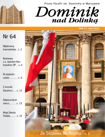 Pismo Parafii św. Dominika w Warszawie Pismo Parafii św. Dominika w Warszawie Rok 17, Lato 2011 Nr 64 Wędrowny kaznodzieja .. s. 2 Rozmowa z o. Jackiem Norkowskim OP ... s. 4 W ostatnim czasie ............. s. 6 Z kroniki klasztoru .... s. 12 Odpocznijcie nieco... ...... s. 13 Moja Ziemia Święta .......... s. 15 Ze Służewa do Rzymu - s. 3 Wędrowny kaznodzieja Kilkakrotnie pieszo przemierzył Europę, głosząc Słowo i ujmując ludzi autentycznością ewangelicznego życia. Z Półwyspu Iberyjskiego dotarł do Danii, trzykrotnie przemierzył Alpy, przez lata apostołował w południowej Francji, dał się poznać jako organizator życia zakonnego w Rzymie. Celem jego życia stało się niesienie światła Ewangelii, głoszenie jej w drodze, zwłaszcza pogrążającym się w herezji. W Europie bowiem szerzyły się wówczas wpływy różnych ruchów heretyckich, głoszących poglądy sprzeczne z nauką Kościoła. Święty Dominik pragnął zanieść Ewangelię Chrystusa na krańce ówczesnego świata, do legendarnych Kumanów. Dominik de Guzmán, o którym mówimy, urodził się około 1170 roku w północnej Hiszpanii, w niewielkim mieście Caleruega. Rodzice Dominika – Feliks de Guzmán i błogosławiona Joanna d’Aza – zadbali o jego wykształcenie. Nauki pobierał początkowo u swojego wuja, archiprezbitera, potem podjął studia teologiczne na uniwersytecie w Palencji. W wieku 25 lat przyjmuje święcenia kapłańskie i wstępuje do Zgromadzenia Kanoników Regularnych w Osmie. Wkrótce zostaje subprzeorem wspólnoty. W 1203 roku, podczas pierwszej podróży do Danii, wraz ze swoim przyjacielem, biskupem Diego d’Azevedo, spotyka się z heretykami i widząc ich duchowe nieszczęście, odczuwa wewnętrzne przynaglenie do głoszenia Słowa – by nim nawracać coraz liczniejszych odstępców od wiary i Kościoła. Pragnie w prostocie, jak pierwsi Apostołowie, nieść światło nauki Chrystusa. Wędruje pieszo, najczęściej boso, mając przy sobie jedynie Ewangelię wg św. Mateusza i Listy św. Pawła, do których często się odwołuje. Pokorą, wytrwałością, wymową, ujmującą życzliwością i radosnym usposobieniem zjednuje Bogu ludzi. Mówiono o nim, że rozmawia albo z Bogiem, albo z ludźmi o Bogu. Dostrzegając miłość Dominika do zagubionych dusz oraz mądrość i pokorę, z jaką podejmuje głoszenie Ewangelii, najpierw biskup Tuluzy, Fulko, a potem papież Innocenty III udzielają jemu i jego braciom zgody na działalność kaznodziejską. Warto zwrócić uwagę, że prawo głoszenia Słowa w ówczesnym Kościele mieli jedynie biskupi. Walkę o dusze Dominik prowadzi nie tylko przez głoszenie Ewangelii. Podejmuje różne umartwienia, pokutuje za grzechy własne i innych, za dusze czyśćcowe, żarliwie modli się, często w nocy, z płaczem wstawia się za grzesznikami 2 św. Dominika i pości. Bracia niejednokrotnie słyszeli, jak w czasie nocnej modlitwy wołał: Panie, co się stanie z grzesznikami? Przed założeniem klasztorów braci powołuje do życia klasztory sióstr, pierwszy w południowej Francji – w Prouille, w 1206 roku. Gromadzi w nim kobiety nawrócone z herezji, aby swoją modlitwą przygotowały grunt pod apostolską pracę braci. Po dziesięciu latach apostołowania w sercu Dominika dojrzewa pragnienie założenia zakonu, który by kształcił i posyłał w świat coraz to nowe pokolenia głosicieli Słowa. Potrzebuje do tego zgody Stolicy Apostolskiej. W Rzymie przedstawia nowy sposób działalności i papież Honoriusz III zatwierdza zakon – bullą z 22 grudnia 1216 roku – nadając mu tytuł Zakonu Głosicieli z prawem powszechnego głoszenia. Bracia kaznodzieje swoje życie zakonne zaczynają od wyrzeczenia się rzeczy doczesnych, postanawiając żyć z jałmużny, w najściślejszym ubóstwie. Gdy w klasztorze w Tuluzie jest zebranych szesnastu braci, w Święto Wniebowzięcia NMP 1217 roku, Dominik rozsyła ich w różne strony Europy: do Hiszpanii, Paryża, Orleanu, Bolonii. Zarzut zbyt prędkiego rozesłania nowo powstałej wspólnoty odrzuca stwierdzeniem: Ziarno rozsiane wydaje owoc, ale gdy je zgromadzić w jednym miejscu – gnije. Bracia idą ubrani w białe habity i czarne kapy. Wyruszają bez pieniędzy, za jedyne swoje bogactwo mając Chrystusa. Takim radykalizmem porywają za sobą wielu młodych mężczyzn, którzy zapełniają coraz liczniej powstające dominikańskie klasztory. Od sierpnia 1219 roku Dominik najczęściej przebywa w założonym przez siebie klasztorze w Bolonii. Tam, w maju 1220 roku, zwołuje kapitułę generalną Zakonu, podczas której zostaje wypracowanych wiele zasad dotyczących życia wspólnotowego braci. Przed śmiercią św. Dominik przekazuje braciom swój testament: Oto moja spuścizna: miejcie miłość, zachowujcie pokorę, pielęgnujcie dobrowolne ubóstwo. Ufa Bogu, że mimo doświadczenia ubóstwa, braciom nie zabraknie niczego, co konieczne w prowadzeniu apostolskiego dzieła. Zapewnia, że bardziej niż za życia będzie im pomocny i użyteczny po swojej śmierci. Wyczerpany pracą misyjną, umiera w Bolonii 6 sierpnia 1221 roku, polecając wszystkich swoich braci Bogu Ojcu i prosząc, by pochowano go w chórze zakonnym, pod stopami modlących się tam braci. Redakcja Ze Służewa do Rzymu – z dziennika pątniczki Gdy podano informację o dniu beatyfikacji Jana Pawła II, nie miałam wątpliwości, że 1 maja 2011 roku pragnę być w Rzymie. Wyruszając (było nas ok. 45 osób), znaliśmy się jedynie z widzenia. Nasze bogactwo kryło się w różnorodności: byli wśród nas dorośli i dzieci, studenci, rodziny, matki z córkami i ojcowie z synami, kapłani oraz świeccy. Nigdy wcześniej nie stanowiliśmy zorganizowanej grupy, ale po tygodniu wracaliśmy już jako wspólnota. To niesamowite, jak poprzez wspólną modlitwę, codzienną Eucharystię, wspólne wędrowanie, radości i trudy podróży Duch Święty budował w nas jedność. Naszą pielgrzymkę można by nazwa