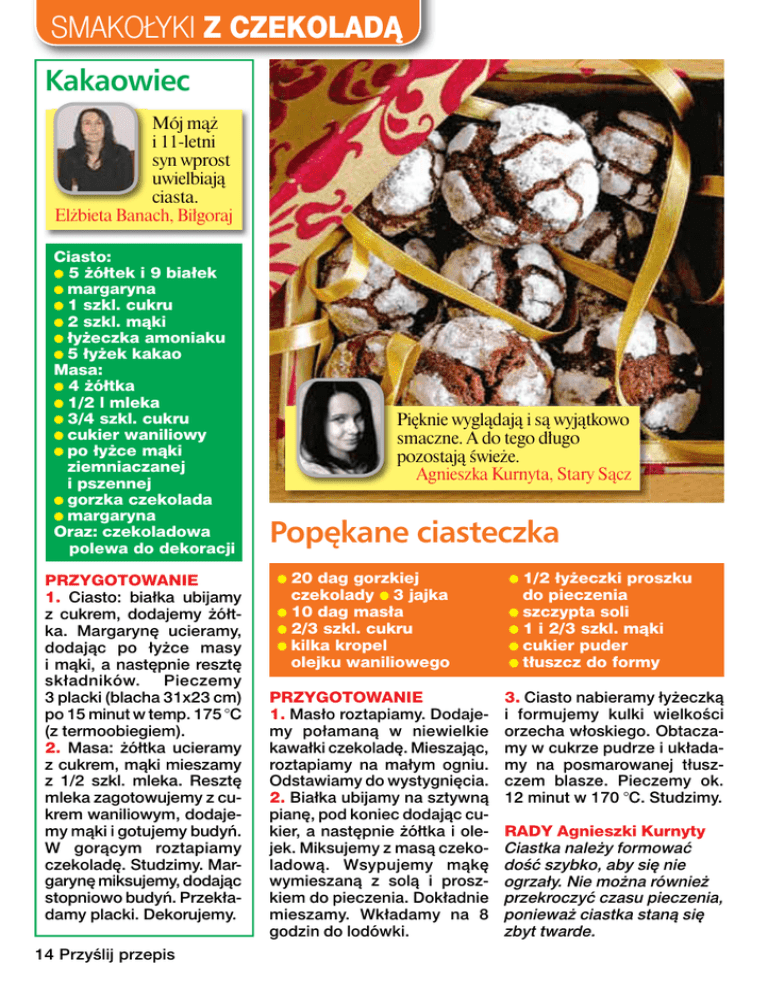 SMAKOŁYKI Z CZEKOLADĄ Kakaowiec Mój mąż i 11-letni syn wprost uwielbiają ciasta. Elżbieta Banach, Biłgoraj Ciasto: ● 5 żółtek i 9 białek ● margaryna ● 1 szkl. cukru ● 2 szkl. mąki ● łyżeczka amoniaku ● 5 łyżek kakao Masa: ● 4 żółtka ● 1/2 l mleka ● 3/4 szkl. cukru ● cukier waniliowy ● po łyżce mąki ziemniaczanej i pszennej ● gorzka czekolada ● margaryna Oraz: czekoladowa polewa do dekoracji PRZYGOTOWANIE 1. Ciasto: białka ubijamy z cukrem, dodajemy żółtka. Margarynę ucieramy, dodając po łyżce masy i mąki, a następnie resztę składników. Pieczemy 3 placki (blacha 31x23 cm) po 15 minut w temp. 175 °C (z termoobiegiem). 2. Masa: żółtka ucieramy z cukrem, mąki mieszamy z 1/2 szkl. mleka. Resztę mleka zagotowujemy z cukrem waniliowym, dodajemy mąki i gotujemy budyń. W gorącym roztapiamy czekoladę. Studzimy. Margarynę miksujemy, dodając stopniowo budyń. Przekładamy placki. Dekorujemy. 14 Przyślij przepis Pięknie wyglądają i są wyjątkowo smaczne. A do tego długo pozostają świeże. Agnieszka Kurnyta, Stary Sącz Popękane ciasteczka ● 20 dag gorzkiej czekolady ● 3 jajka ● 10 dag masła ● 2/3 szkl. cukru ● kilka kropel olejku waniliowego PRZYGOTOWANIE 1. Masło roztapiamy. Dodajemy połamaną w niewielkie kawałki czekoladę. Mieszając, roztapiamy na małym ogniu. Odstawiamy do wystygnięcia. 2. Białka ubijamy na sztywną pianę, pod koniec dodając cukier, a następnie żółtka i olejek. Miksujemy z masą czekoladową. Wsypujemy mąkę wymieszaną z solą i proszkiem do pieczenia. Dokładnie mieszamy. Wkładamy na 8 godzin do lodówki. ● 1/2 łyżeczki proszku do pieczenia ● szczypta soli ● 1 i 2/3 szkl. mąki ● cukier puder ● tłuszcz do formy 3. Ciasto nabieramy łyżeczką i formujemy kulki wielkości orzecha włoskiego. Obtaczamy w cukrze pudrze i układamy na posmarowanej tłuszczem blasze. Pieczemy ok. 12 minut w 170 °C. Studzimy. RADY Agnieszki Kurnyty Ciastka należy formować dość szybko, aby się nie ogrzały. Nie można również przekroczyć czasu pieczenia, ponieważ ciastka staną się zbyt twarde.
