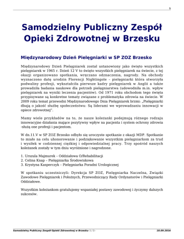 1 Samodzielny Publiczny Zespół Opieki Zdrowotnej w Brzesku Międzynarodowy Dzień Pielęgniarki w SP ZOZ Brzesko Międzynarodowy Dzień Pielęgniarek został ustanowiony jako święto wszystkich pielęgniarek w 1965 r. Dzień 12 V to święto wszystkich pielęgniarek na świecie, z tej okazji organizowano spotkania, wręczano odznaczenia, nagrody. Na obchody wyznaczono datę urodzin Florencji Nightingole – pielęgniarki która stworzyła podwaliny profesji, wykształciła pierwsze kadry pielęgniarek w Anglii a także prowadziła badania naukowe dla potrzeb pielęgniarstwa (udowodniła m.in. wpływ pielęgniarek na wyniki leczenia pacjentów). Od 1971 roku obchodom tego święta przypisywane są konkretne tematy związane z problematyka zdrowia na świecie. W 2009 roku temat przewodni Międzynarodowego Dnia Pielęgniarek brzmi: „Pielęgniarki dbają o jakość służbę społeczeństwu: Są liderami we wprowadzaniu innowacji w opiece zdrowotnej”. Mamy wiele przykładów na to, że nasze koleżanki podejmują różnego rodzaju innowacyjne działania mające pozytywny wpływ na pacjenta i system ochrony zdrowia -służą one profesji i pacjentom. W dn.11.V w SP ZOZ Brzesko odbyło się uroczyste spotkanie z okazji MDP. Spotkanie to miało na celu uhonorowanie i podziękowanie wszystkim pielęgniarkom za trud i wysiłek w codziennej ciężkiej i odpowiedzialnej pracy. Trzy spośród naszych koleżanek zostały w tym dniu wyróżnione i nagrodzone. 1. Urszula Majmurek – Oddziałowa O/Rehabilitacji 2. Celina Knap – Pielęgniarka Środowiskowa 3. Krystyna Kasperczyk – Pielęgniarka Poradni Urologicznej W spotkaniu uczestniczyli: Dyrekcja SP ZOZ, Pielęgniarka Naczelna, Związki Zawodowe Pielęgniarek i Położnych, Przewodniczący Rady Ordynatorów i Pielęgniarki Oddziałowe. Wszystkim koleżankom gratulujemy wspaniałej postawy zawodowej i życzymy dalszych sukcesów. Samodzielny Publiczny Zespół Opieki Zdrowotnej w Brzesku- 1 / 3 - 18.09.2016 2 Samodzielny Publiczny Zespół Opieki Zdrowotnej w Brzesku- 2 / 3 - 18.09.2016 3 Samodzielny Publiczny Zespół Opieki Zdrowotnej w Brzesku- 3 / 3 - 18.09.2016