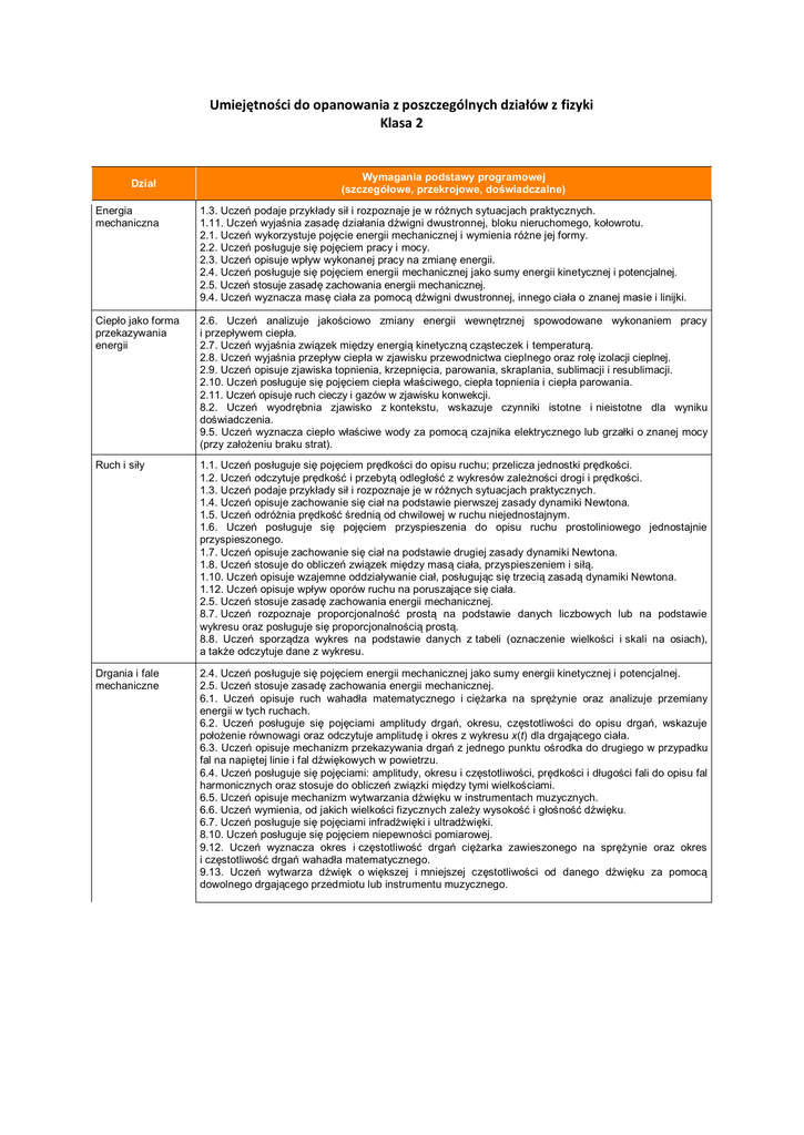 Umiejętności do opanowania z poszczególnych działów z fizyki Klasa 2 Dział Wymagania podstawy programowej (szczegółowe, przekrojowe, doświadczalne) Energia mechaniczna 1.3. Uczeń podaje przykłady sił i rozpoznaje je w różnych sytuacjach praktycznych. 1.11. Uczeń wyjaśnia zasadę działania dźwigni dwustronnej, bloku nieruchomego, kołowrotu. 2.1. Uczeń wykorzystuje pojęcie energii mechanicznej i wymienia różne jej formy. 2.2. Uczeń posługuje się pojęciem pracy i mocy. 2.3. Uczeń opisuje wpływ wykonanej pracy na zmianę energii. 2.4. Uczeń posługuje się pojęciem energii mechanicznej jako sumy energii kinetycznej i potencjalnej. 2.5. Uczeń stosuje zasadę zachowania energii mechanicznej. 9.4. Uczeń wyznacza masę ciała za pomocą dźwigni dwustronnej, innego ciała o znanej masie i linijki. Ciepło jako forma przekazywania energii 2.6. Uczeń analizuje jakościowo zmiany energii wewnętrznej spowodowane wykonaniem pracy i przepływem ciepła. 2.7. Uczeń wyjaśnia związek między energią kinetyczną cząsteczek i temperaturą. 2.8. Uczeń wyjaśnia przepływ ciepła w zjawisku przewodnictwa cieplnego oraz rolę izolacji cieplnej. 2.9. Uczeń opisuje zjawiska topnienia, krzepnięcia, parowania, skraplania, sublimacji i resublimacji. 2.10. Uczeń posługuje się pojęciem ciepła właściwego, ciepła topnienia i ciepła parowania. 2.11. Uczeń opisuje ruch cieczy i gazów w zjawisku konwekcji. 8.2. Uczeń wyodrębnia zjawisko z kontekstu, wskazuje czynniki istotne i nieistotne dla wyniku doświadczenia. 9.5. Uczeń wyznacza ciepło właściwe wody za pomocą czajnika elektrycznego lub grzałki o znanej mocy (przy założeniu braku strat). Ruch i siły 1.1. Uczeń posługuje się pojęciem prędkości do opisu ruchu; przelicza jednostki prędkości. 1.2. Uczeń odczytuje prędkość i przebytą odległość z wykresów zależności drogi i prędkości. 1.3. Uczeń podaje przykłady sił i rozpoznaje je w różnych sytuacjach praktycznych. 1.4. Uczeń opisuje zachowanie się ciał na podstawie pierwszej zasady dynamiki Newtona. 1.5. Uczeń odróżnia prędkość średnią od chwilowej w ruchu niejednostajnym. 1.6. Uczeń posługuje się pojęciem przyspieszenia do opisu ruchu prostoliniowego jednostajnie przyspieszonego. 1.7. Uczeń opisuje zachowanie się ciał na podstawie drugiej zasady dynamiki Newtona. 1.8. Uczeń stosuje do obliczeń związek między masą ciała, przyspieszeniem i siłą. 1.10. Uczeń opisuje wzajemne oddziaływanie ciał, posługując się trzecią zasadą dynamiki Newtona. 1.12. Uczeń opisuje wpływ oporów ruchu na poruszające się ciała. 2.5. Uczeń stosuje zasadę zachowania energii mechanicznej. 8.7. Uczeń rozpoznaje proporcjonalność prostą na podstawie danych liczbowych lub na podstawie wykresu oraz posługuje się proporcjonalnością prostą. 8.8. Uczeń sporządza wykres na podstawie danych z tabeli (oznaczenie wielkości i skali na osiach), a także odczytuje dane z wykresu. Drgania i fale mechaniczne 2.4. Uczeń posługuje się pojęciem energii mechanicznej jako sumy energii kinetycznej i potencjalnej. 2.5. Uczeń stosuje zasadę zachowania energii mechanicznej. 6.1. Uczeń opisuje ruch wahadła matematycznego i ciężarka na sprężynie oraz analizuje przemiany energii w tych ruchach. 6.2. Uczeń posługuje się pojęciami amplitudy drgań, okresu, częstotliwości do opisu drgań, wskazuje położenie równowagi oraz odczytuje amplitudę i okres z wykresu x(t) dla drgającego ciała. 6.3. Uczeń opisuje mechanizm przekazywania drgań z jednego punktu ośrodka do drugiego w przypadku fal na napiętej linie i fal dźwiękowych w powietrzu. 6.4. Uczeń posługuje się pojęciami: amplitudy, okresu i częstotliwości, prędkości i długości fali do opisu fal harmonicznych oraz stosuje do obliczeń związki między tymi wielkościami. 6.5. Uczeń opisuje mechanizm wytwarzania dźwięku w instrumentach muzycznych. 6.6. Uczeń wymienia, od jakich wielkości fizycznych zależy wysokość i głośność dźwięku. 6.7. Uczeń posługuje się pojęciami infradźwięki i ultradźwięki. 8.10. Uczeń posługuje się pojęciem niepewności pomiarowej. 9.12. Uczeń wyznacza okres i częstotliwość drgań ciężarka zawieszonego na sprężynie oraz okres i częstotliwość drgań wahadła matematycznego. 9.13. Uczeń wytwarza dźwięk o większej i mniejszej częstotliwości od danego dźwięku za pomocą dowolnego drgającego przedmiotu lub instrumentu muzycznego. Dział Optyka Wymagania podstawy programowej (szczegółowe, przekrojowe, doświadczalne) 7.2. Uczeń wyjaśnia powstawanie obszarów cienia i półcienia za pomocą prostoliniowego rozchodzenia się światła w ośrodku jednorodnym. 7.3. Uczeń wyjaśnia powstawanie obrazu pozornego w zwierciadle płaskim, wykorzystując prawa odbicia; opisuje zjawisko rozproszenia światła przy odbiciu od powierzchni chropowatej. 7.4. Opisuje skupianie promieni w zwierciadle wklęsłym, posługując się pojęciami ogniska i ogniskowej, rysuje konstrukcyjnie obrazy wytworzone przez zwierciadła wklęsłe. 7.5. Uczeń opisuje (jakościowo) bieg promieni przy przejściu światła z ośrodka rzadszego do ośrodka gęstszego optycznie i odwrotnie. 7.6. Uczeń opisuje bieg promieni przechodzących przez soczewkę skupiającą i rozpraszającą (biegnących równolegle do osi optycznej), posługując się pojęciami ogniska i ogniskowej. 7.7. Uczeń rysuje konstrukcyjnie obrazy wytworzone przez soczewki, rozróżnia obrazy rzeczywiste, pozorne, proste, odwrócone, powiększone, pomniejszone. 7.8. Uczeń wyjaśnia pojęcia krótkowzroczności i dalekowzroczności oraz opisuje rolę soczewek w ich korygowaniu. 7.9. Uczeń opisuje zjawisko rozszczepienia światła za pomocą pryzmatu. 7.10. Uczeń opisuje światło białe jako mieszaninę barw, a światło lasera jako światło jednobarwne. 7.11. Uczeń podaje przybliżoną wartość prędkości światła w próżni; wskazuje prędkoś