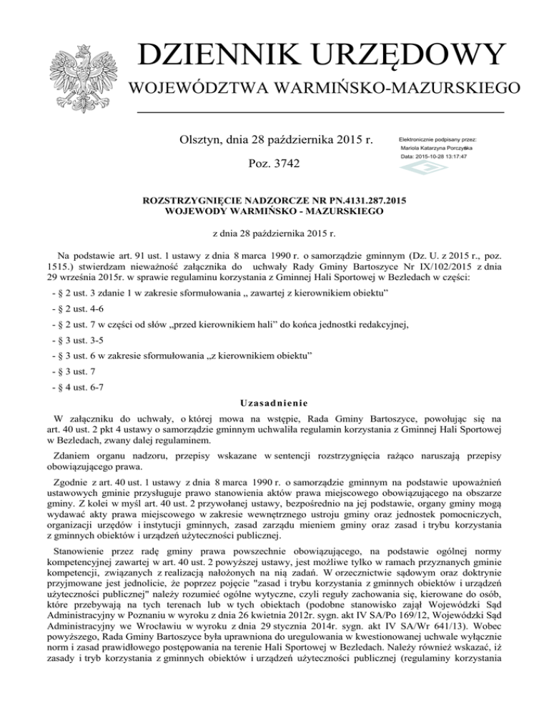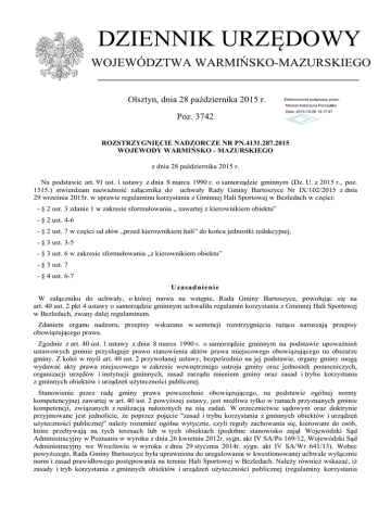 DZIENNIK URZĘDOWY WOJEWÓDZTWA WARMIŃSKO-MAZURSKIEGO Olsztyn, dnia 28 października 2015 r. Elektronicznie podpisany przez: Mariola Katarzyna Porczyńska Poz. 3742 Data: 2015-10-28 13:17:47 ROZSTRZYGNIĘCIE NADZORCZE NR PN.4131.287.2015 WOJEWODY WARMIŃSKO - MAZURSKIEGO z dnia 28 października 2015 r. Na podstawie art. 91 ust. 1 ustawy z dnia 8 marca 1990 r. o samorządzie gminnym (Dz. U. z 2015 r., poz. 1515.) stwierdzam nieważność załącznika do uchwały Rady Gminy Bartoszyce Nr IX/102/2015 z dnia 29 września 2015r. w sprawie regulaminu korzystania z Gminnej Hali Sportowej w Bezledach w części: - § 2 ust. 3 zdanie 1 w zakresie sformułowania „ zawartej z kierownikiem obiektu” - § 2 ust. 4-6 - § 2 ust. 7 w części od słów „przed kierownikiem hali” do końca jednostki redakcyjnej, - § 3 ust. 3-5 - § 3 ust. 6 w zakresie sformułowania „z kierownikiem obiektu” - § 3 ust. 7 - § 4 ust. 6-7 Uzasadnienie W załączniku do uchwały, o której mowa na wstępie, Rada Gminy Bartoszyce, powołując się na art. 40 ust. 2 pkt 4 ustawy o samorządzie gminnym uchwaliła regulamin korzystania z Gminnej Hali Sportowej w Bezledach, zwany dalej regulaminem. Zdaniem organu nadzoru, przepisy wskazane w sentencji rozstrzygnięcia rażąco naruszają przepisy obowiązującego prawa. Zgodnie z art. 40 ust. 1 ustawy z dnia 8 marca 1990 r. o samorządzie gminnym na podstawie upoważnień ustawowych gminie przysługuje prawo stanowienia aktów prawa miejscowego obowiązującego na obszarze gminy. Z kolei w myśl art. 40 ust. 2 przywołanej ustawy, bezpośrednio na jej podstawie, organy gminy mogą wydawać akty prawa miejscowego w zakresie wewnętrznego ustroju gminy oraz jednostek pomocniczych, organizacji urzędów i instytucji gminnych, zasad zarządu mieniem gminy oraz zasad i trybu korzystania z gminnych obiektów i urządzeń użyteczności publicznej. Stanowienie przez radę gminy prawa powszechnie obowiązującego, na podstawie ogólnej normy kompetencyjnej zawartej w art. 40 ust. 2 powyższej ustawy, jest możliwe tylko w ramach przyznanych gminie kompetencji, związanych z realizacją nałożonych na nią zadań. W orzecznictwie sądowym oraz doktrynie przyjmowane jest jednolicie, że poprzez pojęcie "zasad i trybu korzystania z gminnych obiektów i urządzeń użyteczności publicznej" należy rozumieć ogólne wytyczne, czyli reguły zachowania się, kierowane do osób, które przebywają na tych terenach lub w tych obiektach (podobne stanowisko zajął Wojewódzki Sąd Administracyjny w Poznaniu w wyroku z dnia 26 kwietnia 2012r. sygn. akt IV SA/Po 169/12, Wojewódzki Sąd Administracyjny we Wrocławiu w wyroku z dnia 29 stycznia 2014r. sygn. akt IV SA/Wr 641/13). Wobec powyższego, Rada Gminy Bartoszyce była uprawniona do uregulowania w kwestionowanej uchwale wyłącznie norm i zasad prawidłowego postępowania na terenie Hali Sportowej w Bezledach. Należy również wskazać, iż zasady i tryb korzystania z gminnych obiektów i urządzeń użyteczności publicznej (regulaminy korzystania Dziennik Urzędowy Województwa Warmińsko-Mazurskiego –2– Poz. 3742 z obiektów i urządzeń) - jak sama treść przepisu wskazuje - nie są adresowane do podmiotów nimi zarządzających, lecz do podmiotów korzystających z owych obiektów i urządzeń. Podkreślić zatem należy, iż przepis art. 40 ust. 2 pkt 4 ustawy o samorządzie gminnym upoważnia radę gminy do stanowienia aktów prawa miejscowego w zakresie tworzenia zasad i trybu korzystania z obiektów i urządzeń użyteczności publicznej, natomiast poza zakresem wskazanego upoważnienia pozostają sprawy związane z zasadami i trybem gospodarowania i korzystania z tego mienia przez podmiot nim zarządzający. Tym samym, Rada Gminy Bartoszyce uprawniona była wyłącznie do określenia w uchwale w sprawie regulaminu korzystania z Hali Sportowej w Bezledach norm i zasad prawidłowego postępowania na terenie tego obiektu, nie miała natomiast kompetencji do wprowadzania jakichkolwiek postanowień odnośnie uprawnień i obowiązków kierownika obiektu (§ 2 ust. 3 – 6, § 3 ust. 6 regulaminu). Taka materia, nie mieści się bowiem ani w pojęciu zasad, ani w pojęciu trybu korzystania z obiektów użyteczności publicznej. Zgodnie z art. 30 ust. 2 pkt 3 ustawy o samorządzie gminnym: "Do zadań wójta należy w szczególności gospodarowanie mieniem komunalnym.". Wybór konkretnego podmiotu, jak też ustalenie jego kompetencji, należy zatem do zadań wójta, jako organu gminy gospodarującego mieniem komunalnym. Należy podkreślić, iż unormowana w ww. paragrafach złącznika do uchwały materia, dotyczy kwestii, które powinna określać umowa zawarta między organem wykonawczym gminy, a kierownikiem obiektu (umowa o pracę lub inna umowa określająca zakres obowiązków kierownika obiektu). Zdaniem organu nadzoru Rada wprowadzając w regulaminie postanowienia § 2 ust. 5 i ust. 7, § 3 ust. 3 – 4 i ust. 7, wykroczyła poza zakres przyznanego jej upoważnienia do uregulowania zasad i trybu korzystania z gminnych obiektów i urządzeń użyteczności publicznej, jednocześnie naruszając kompetencje wójta do gospodarowania mieniem komunalnym. Przede wszystkim należy stwierdzić, że przepis art. 3531 ustawy z dnia 23 kwietnia 1964 r. - Kodeks cywilny (Dz. U. z 2014r., poz. 121 z późn. zm.) ustanawia zasadę swobody w zakresie zawierania umów. Zgodnie z nim, strony zawierające umowę mogą ułożyć stosunek prawny według swojego uznania, byleby jego treść lub cel nie sprzeciwiały się właściwości (naturze) stosunku, ustawie ani zasadom współżycia społecznego. W świetle powyższego to zawierające umowę strony, mają wyłączne prawo negocjować i uzgadniać warunki wiążącej je umowy. Rada Gminy nie posiada kompetencji w powyższym zakresie. Oznacza to, iż nie przysługują jej żadne kompetencje w zakresie ustalania warunków umowy i zawierania umowy. Rada nie jest bowiem stroną umowy