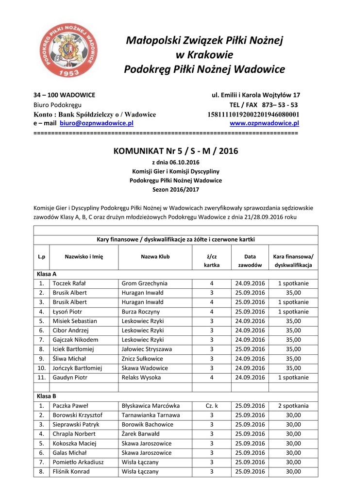 Małopolski Związek Piłki Nożnej w Krakowie Podokręg Piłki Nożnej Wadowice 34 – 100 WADOWICE ul. Emilii i Karola Wojtyłów 17 Biuro Podokręgu TEL / FAX 873– 53 - 53 Konto : Bank Spółdzielczy o / Wadowice 15811110192002201946080001 e – mail [email protected] www.ozpnwadowice.pl =========================================================================== KOMUNIKAT Nr 5 / S - M / 2016 z dnia 06.10.2016 Komisji Gier i Komisji Dyscypliny Podokręgu Piłki Nożnej Wadowice Sezon 2016/2017 Komisje Gier i Dyscypliny Podokręgu Piłki Nożnej w Wadowicach zweryfikowały sprawozdania sędziowskie zawodów Klasy A, B, C oraz drużyn młodzieżowych Podokręgu Wadowice z dnia 21/28.09.2016 roku Kary finansowe / dyskwalifikacje za żółte i czerwone kartki L.p Nazwisko i Imię Nazwa Klub Klasa A 1. Toczek Rafał 2. Brusik Albert 3. Brusik Albert 4. Łysoń Piotr 5. Misiek Sebastian 6. Cibor Andrzej 7. Gajczak Nikodem 8. Iciek Bartłomiej 9. Śliwa Michał 10. Jończyk Bartłomiej 11. Gaudyn Piotr Grom Grzechynia Huragan Inwałd Huragan Inwałd Burza Roczyny Leskowiec Rzyki Leskowiec Rzyki Leskowiec Rzyki Jałowiec Stryszawa Znicz Sułkowice Skawa Wadowice Relaks Wysoka Klasa B 1. Paczka Paweł 2. Borowski Krzysztof 3. Sieprawski Patryk 4. Chrapla Norbert 5. Kokoszka Maciej 6. Galas Michał 7. Pomietło Arkadiusz 8. Fliśnik Konrad Błyskawica Marcówka Tarnawianka Tarnawa Borowik Bachowice Żarek Barwałd Skawa Jaroszowice Skawa Jaroszowice Wisła Łączany Wisła Łączany ż/cz kartka Data zawodów Kara finansowa/ dyskwalifikacja 4 3 4 4 3 3 3 3 3 3 4 24.09.2016 25.09.2016 25.09.2016 25.09.2016 24.09.2016 24.09.2016 24.09.2016 25.09.2016 24.09.2016 24.09.2016 24.09.2016 1 spotkanie 35,00 1 spotkanie 1 spotkanie 35,00 35,00 35,00 35,00 35,00 35,00 1 spotkanie Cz. k 3 3 3 3 3 3 3 25.09.2016 25.09.2016 25.09.2016 25.09.2016 25.09.2016 25.09.2016 25.09.2016 25.09.2016 2 spotkania 30,00 30,00 30,00 30,00 30,00 30,00 30,00 9. 10. Nicieja Artur Grych Jarosław Płomień Sosnowice Płomień Sosnowice 3 3 25.09.2016 25.09.2016 30,00 30,00 Klasa C 1. Błachut Marcin 2. Śmiłek Paweł 3. Pocielej Tadeusz 4. Łypik Wojciech Filkówka Barwałd Jastrzębianka Jastrzębia Korona Skawinki Chełm Stryszów 3 3 3 3 25.09.2016 25.09.2016 25.09.2016 25.09.2016 25,00 25,00 25,00 25,00 I Liga Juniorzy Młodsi 1. Monica Dariusz Orzeł Ryczów 4 24.09.2016 1 spotkanie II Liga Juniorzy Młodsi 1. Wojnar Dawid 2. Gawor Brajan 3. Mirek Sebastian Orzeł Radocza Kalwarianka Kalwaria Kalwarianka Kalwaria Cz. k Cz. k Cz. k 24.09.2016 24.09.2016 24.09.2016 2 spotkania 3 spotkania 3 spotkania Komisja Dyscypliny postanowiła : 1. LKS Borowik Bachowice Komisja Gier i Dyscypliny Podokręgu Piłki Nożnej Wadowice informuje, że w dniu 30.09.2016 roku klub Wasz został ukarany karą weryfikacji zawodów zgodnie z REGULAMINEM ROZGRYWEK na sezon 2016/2017 za brak zespołu na zawodach Liga Orlika w dniu 28.09.2016 roku pomiędzy zespołami AP Wisła Brzeźnica – LKS Borowik Bachowice oraz dokonała weryfikacji zawodów jako walkower 3 : 0 dla AP Wisła Brzeźnica – Uchwała nr 14/Z/2015 z dnia 23 lipca 2015 roku art. 2 pkt. 10.15 - bez kary finansowej pismo klubu. 2. LKS Sokół Frydrychowice Komisja Dyscypliny Podokręgu Piłki Nożnej Wadowice informuje, że w dniu 30.09.2016 roku klub Wasz został ukarany karą porządkową UPOMNIENIE z godnie z Regulaminem rozgrywek na sezon 2016/2017 za brak późne dostarczenie sprawozdania sędziowskiego na zawodach II Liga Juniorzy Starsi w dniu 24.09.2016 roku zawody LKS Sokół Frydrychowice – LKS Watra Zawoja – Uchwała nr 14/Z/2015 z dnia 23 lipca 2015 roku. 3. LKS Jastrzębianka Jastrzębia Komisja Dyscypliny Podokręgu Piłki Nożnej Wadowice informuje, że w dniu 30.09.2016 roku klub Wasz został ukarany karą porządkową UPOMNIENIE zgodnie z REGULAMINEM ROZGRYWEK na sezon 2016/2017 za brak wpisanego trenera drużyny w sprawozdaniu sędziego na zawodach Klasa C w dniu 25.09.2016 roku pomiędzy zespołami LKS Żarek Stronie – LKS Jastrzębianka Jastrzębia - Uchwała nr 14/Z/2015 z dnia 23 lipca 2015 roku . 4. LKS Jastrzębianka Jastrzębia Komisja Dyscypliny Podokręgu Piłki Nożnej w Wadowicach prosi o przybycie PREZESA Waszego klubu Pana RADOŃ TADEUSZ na Komisję Dyscypliny ul Emilii i Karola Wojtyło 17 w Wadowicach w dniu 07.10.2016 roku o godz. 17 00 / piątek / w związku z zawodami Klasa C z dnia 25.09.2016 roku pomiędzy zespołami LKS Żarek Stronie – LKS Jastrzębianka Jastrzębia. Nie zgłoszenie się na wezwanie Komisji spowoduje nałożenie kary dyscyplinarnej. 5. LKS Iskra Klecza Komisja Gier i Dyscypliny Podokręgu Piłki Nożnej Wadowice informuje, że w dniu 30.09.2016 roku klub Wasz został ukarany karą finansową w wysokości 150,00 złotych / słownie sto pięćdziesiąt złotych / zgodnie z REGULAMINEM ROZGRYWEK na sezon 2016/2017 za grę nieuprawnionego zawodnika w zawodach Klasa C w systemie extranet ( BRYNDZA KRZYSZTOF ) w dniu 25.09.2016 roku LKS Iskra Klecza – LKS Sokół Chrząstowice oraz dokonano weryfikacji zawodów na wynik 0 : 4 ( wyniki na boisku ) dla LKS Sokół Chrząstowice – Uchwała nr 14/Z/2015 z dnia 23 lipca 2015 roku art. 2 pkt. 10.14. 6. KS Korona Skawinki Komisja Dyscypliny Podokręgu Piłki Nożnej Wadowice informuje, że w dniu 30.09.2016 roku klub Wasz został ukarany karą finansową w wysokości 100,00 złotych / słownie sto złotych / zgodnie z REGULAMINEM ROZGRYWEK na sezon 2016/2017 Jeżeli co najmniej 5 zawodników jednej drużyny otrzyma ostrzeżenie (żółtą kartkę) lub wykluczenie (czerwona kartka) w jednym meczu, klub ukaranych zawodników podlega karze pieniężnej w wysokości orzeczonej przez Komisję Dyscyplinarną, nie mniejszej niż 100 zł. Zawody Klasa C z dnia 25.09.2016 roku KS Korona Skawinki – LKS Chełm Stryszów - Uchwała nr 14/Z/2015 z dnia 23 lipca 2015 roku art. 7 pkt. 7.1. Od nałożonych kar przysługuje stronom tryb odwoławczy zgodnie z Regulaminem Rozgrywek na sezon 2