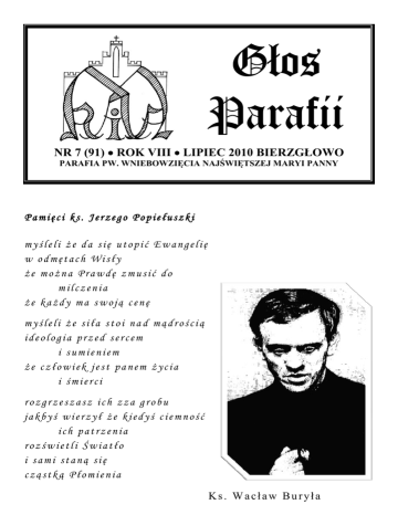 Głos Parafii NR 7 (91) ROK VIII LIPIEC 2010 BIERZGŁOWO PARAFIA PW. WNIEBOWZIĘCIA NAJŚWIĘTSZEJ MARYI PANNY Pamięci ks. Jerzego Popiełuszki myśleli że da się utopić Ewangelię w odmętach Wisły że można Prawdę zmusić do milczenia że każdy ma swoją cenę myśleli że siła stoi na d mądrością ideologia przed sercem i sumieniem że człowiek jest panem życia i śmierci rozgrzeszasz ich zza grobu jakbyś wierzył że kiedyś ciemność ich patrzenia rozświetli Światło i sami staną się cząstką Płomienia Ks. Wacław Buryła LIPCOWE KALENDARIUM 2 lipca – Wspomnienie św. Tomasza Apostoła – Pierwszy piątek miesiąca 4 lipca – Liturgia niedzielna – XIV niedziela zwykła 6 lipca – Wspomnienie bł. Marii Teresy Ledóchowskiej 9 lipca – Ks. proboszcz odwiedza chorych (w tym miesiącu ze względu na kolonie nie w Pierwszy piątek miesiąca a tydzień później) 10 lipca – 100-lecie istnienia Kółka Rolniczego w Bierzgłowie (Msza Święta o godz. 17.15) 11 lipca – Liturgia niedzielna – XV niedziela zwykła – Wspomnienie św. Benedykta, patrona Europy – Światowy Dzień Ludności 15 lipca – Dzień bez Telefonu Komórkowego 16 lipca – Wspomnienie Najświętszej Maryi Panny z Góry Karmel 18 lipca – Liturgia niedzielna – XVI niedziela zwykła 22 lipca – Wspomnienie św. Marii Magdaleny 23 lipca – Wspomnienie św. Brygidy, patronki Europy 24 lipca – Dzień Policjanta 25 lipca – Liturgia niedzielna – XVII niedziela zwykła – Wspomnienie św. Jakuba Apostoła – Wspomnienie Św. Krzysztofa, patrona kierowców – Poświęcenie nowych lub nowo nabytych pojazdów (po Sumie) – Dzień Bezpiecznego Kierowcy 26 lipca – Wspomnienie św. Joachima i św. Anny, rodziców Maryi 29 lipca – Wspomnienie św. Marty 31 lipca – Wspomnienie św. Ignacego Loyoli Jak co roku o tej porze – latem, skutki upałów bywają bardzo dokuczliwe nie tylko dla nas – ludzi, ale również dla naszych zwierząt. Pamiętajmy, że są one zależne od nas i tylko my możemy uchronić je przed cierpieniem. Dopilnujmy, aby oprócz pożywienia, zawsze miały dostęp do świeżej, schłodzonej wody i schronienie przed słońcem, nie zapominając również o wydłużeniu zbyt krótkich uwięzi, łańcuchów (jeżeli na takowych je trzymamy). Elżbieta Giersz Z ŻYCIA PARAFII REMONTY Trwają prace konserwatorsko – remontowe przy ostatniej, wschodniej elewacji kościoła. Ponieważ najpierw pracownicy skuwają zwietrzałe cegły oraz cementowe fugi, więc trochę się więcej kurzy. Nie ma możliwości na bieżąco, codziennie sprzątać. Proszę Parafian o wyrozumiałość na czas remontu. Jak przy poprzednich pracach remontowych, tak i tym razem mamy niespodzianki. Konserwatorzy odkryli na fasadzie od strony wschodniej kościoła okienko. Było zamurowane i tam właśnie zagnieździł się rój dzikich pszczół. Początkowo myśleliśmy, że pszczoły tak mocno zdewastowały ścianę, że wyżłobiły głęboką dziurę. Po odbiciu zewnętrznych kamieni widać wyraźnie okno. Początkowa hipoteza nie znalazła uzasadnienia. Prawdopodobnie w średniowieczu, w tym okienku za szybką, stawiano zapaloną świecę lub zapalony kaganek, który oznajmiał obecność Pana Jezusa w Najświętszym Sakramencie. Szybka, którą widać pozostaje okopcona. Wieczna lampka wewnątrz kościoła a na zewnątrz, w tym okienku, świeca. Proszę pamiętać, że przy kościele, od tamtej strony, prawdopodobnie biegła droga. Każdy przechodzący drogą musiał widzieć święcące się światełko, uchylał czapkę lub żegnał się, wspominając, że Pan Jezus jest blisko. Równolegle są prowadzone prace przy portalu pomiędzy zakrystią a kościołem. Z kolei 8 czerwca rozpoczęliśmy prace remontowe przy zabytkowym wiatraku – koźlaku. Najpierw został uprzątnięty sam wiatrak i plac, aby przygotować miejsce dla firmy remontowej. Bóg zapłać za społeczne wykonanie prac porządkowych. Firma ogrodziła teren, postawiła zaplecze dla pracowników oraz na narzędzia i rozpoczęła rozbiórkę. W ciągu tygodnia wiatrak został zdemontowany. Użyto do tego również dźwigu. Po ponad stu latach wiatrak chwilowo zniknął z krajobrazu Bierzgłowa. Gdy wychodzi się z kościoła i spogląda naprzeciw miejsce wydaje się dziwnie puste. Wiatrak bowiem datowany jest na rok 1863. Taką datę znaleźliśmy na górnej belce podczas inwentaryzacji. Wszystkie zachowane części oznaczono symbolami i zabezpieczono. Zostaną ponownie użyte. Zniszczone, spróchniałe przeznaczono na opał. Po dokonaniu rozbiórki szef firmy, której zlecono remont wiatraka, zrobił dokładne zestawienie materiałowe ile i jakiego drewna będzie potrzebował. Obecnie trwa przygotowanie materiału. Potrzeba ok. 62 m3 drewna. Są również wielkie przekroje np. na wał potrzebne jest drewno dębowe o wymiarach 69 na 69 cm i długości 8 m. Na zgromadzenie materiału mamy ponad miesiąc. Od początku sierpnia rozpocznie się odbudowa, która potrwa do końca roku. NOWE MIEJSCE NA EWANGELIARZ Po Misjach Rodzinnych, które odprawiliśmy od 23 do 30 maja br., ustawiliśmy przed ołtarzem pulpit na Ewangeliarz. Zrobił go stolarz p. Ziółkowski. Bóg zapłać. Dziesięć lat temu w Roku Wielkiego Jubileuszu 2000 odprawiliśmy Misje Ewangelizacyjne. Po nich „pozostał” śpiew Duchu Święty, przyjdź prosimy, który zanosimy przed kazaniem, prosząc, aby nauka którą usłyszymy i którą pragniemy przyjmować była prawdziwie Boża, proklamowana i przyjmowana w Duchu Świętym, w Bożym Duchu. Ewangeliarz jest specjalną księgą liturgiczną, która zawiera teksty Ewangelii odczytywane w czasie liturgii Mszy Św. Ewangelia, która zawiera słowa Jezusa, posiada szczególną rangę. Wyraża się to między innymi w postawie stojącej, gdy odczytujemy fragmenty Ewangelii, w robieniu trzykrotnego znaku krzyża: na czole, na wargach i na sercu przed czytaniem. Gdy słuchamy Ewangelii sam Chrystus do nas mó