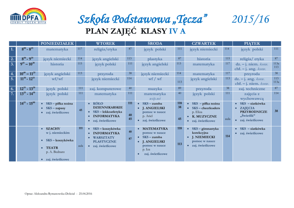 Szkoła Podstawowa „Tęcza” 2015/16 PLAN ZAJĘĆ KLASY IV A 00 45 PONIEDZIAŁEK matematyka 1. 8 -8 2. 3. 850 - 935 945 – 1030 język niemiecki historia 114 4. 5. 1040 – 1125 1130 - 1215 język angielski wf/wf 113 6. 7. 1235 - 1320 1325 - 1410 język polski język polski 111 1415 - 1500 SKS – piłka nożna SKS – zapasy zaj. świetlicowe SZACHY w j. niemieckim język angielski język polski 115 111 45 111 SKS – koszykówka TEATR p. A. Bednarz WTOREK religia/etyka 117 aula przyroda język niemiecki zaj. komputerowe matematyka KÓŁO DZIENNIKARSKIE SKS – lekkoatletyka INFORMATYKA zaj. świetlicowe SKS – koszykówka INFORMATYKA WARSZTATY PLASTYCZNE zaj. świetlicowe zaj. świetlicowe Oprac: Aleksandra Rymanowska-Doleżal - 25.04.2016 87 113 111 38 114 40 111 111 40 45 40 87 ŚRODA język polski plastyka język angielski 111 87 113 język niemiecki wf / wf 114 muzyka matematyka wsip.net 89 SKS – zumba J. ANGIELSKI pomoc w nauce p. Ariel zaj. świetlicowe 118 38 MATEMATYKA pomoc w nauce SKS – zumba J. ANGIELSKI pomoc w nauce p. Iza zaj. świetlicowe 118 113 40 45 113 CZWARTEK język niemiecki 114 historia matematyka 115 matematyka język angielski 117 przyroda język polski 38 SKS – piłka nożna SKS – cheerleaders p. Eliza K. MUZYCZNE zaj. świetlicowe SKS – gimnastyka korekcyjna J. NIEMIECKI pomoc w nauce zaj. świetlicowe 117 113 111 aula 114 PIĄTEK język polski religia/ etyka dz. – j. niem. konw. chł. – j. ang. konw. przyroda dz. – j. ang. konw. chł. – j. niem. konw. zaj. techniczne zajęcia z wychowawcą SKS – siatkówka ZAJĘCIA PRZYRODNICZE „Świetlik” zaj. świetlicowe SKS – siatkówka zaj. świetlicowe 111 87 113a 113 38 113 113a 87 114 38 Szkoła Podstawowa „Tęcza” 2015/16 PLAN ZAJĘĆ KLASY IV B 1. 2. 3. 8 -8 850 - 935 945 – 1030 PONIEDZIAŁEK język polski matematyka historia 4. 5. 1040 – 1125 1130 - 1215 język niemiecki wf/wf 114 6. 7. 1235 - 1320 1325 - 1410 język angielski zajęcia z wychowawcą 113 1415 - 1500 SKS – piłka nożna SKS – zapasy zaj. świetlicowe 00 45 1505 - 1550 SZACHY w j. niemieckim 111 117 113 45 111 aula 113 111 87 język niemiecki przyroda 114 plastyka matematyka wsip.net 89 KÓŁO DZIENNIKARSKIE SKS – lekkoatletyka INFORMATYKA zaj. świetlicowe 111 113 SKS – koszykówka TEATR p. A. Bednarz WTOREK język angielski język polski religia/etyka SKS – koszykówka INFORMATYKA WARSZTATY PLASTYCZNE zaj. świetlicowe zaj. świetlicowe Oprac: Aleksandra Rymanowska-Doleżal - 25.04.2016 38 40 40 45 40 87 ŚRODA język niemiecki język angielski język polski 114 113 111 zaj. komputerowe wf / wf 40 matematyka historia 118 SKS – zumba J. ANGIELSKI pomoc w nauce p. Ariel zaj. świetlicowe 118 38 MATEMATYKA pomoc w nauce SKS – zumba J. ANGIELSKI pomoc w nauce p. Iza zaj. świetlicowe 118 113 45 113 CZWARTEK matematyka matematyka dz. – j. niem. konw. chł. – j. angielski przyroda muzyka język polski dz. – j. angielski chł. – j. niem. konw. SKS – piłka nożna SKS – cheerleaders p. Eliza K. MUZYCZNE zaj. świetlicowe SKS – gimnastyka korekcyjna J. NIEMIECKI pomoc w nauce zaj. świetlicowe 117 117 113a 111 38 89 111 113 113a aula 114 PIĄTEK przyroda język polski język polski religia/ etyka język niemiecki język angielski zajęcia techniczne SKS – siatkówka ZAJĘCIA PRZYRODNICZE „Świetlik” zaj. świetlicowe SKS – siatkówka zaj. świetlicowe 38 111 111 87 114 113 87 38 Szkoła Podstawowa „Tęcza” 2015/16 PLAN ZAJĘĆ KLASY V a 00 45 1. 8 -8 2. 850 - 935 3. 4. PONIEDZIAŁEK historia 115 WTOREK matematyka 118 87 ŚRODA matematyka 113 113a religia/etyka 945 – 1030 1040 – 1125 dz. – j. angielski chł. – j. ang. konw. język niemiecki matematyka 114 5. 1130 - 1215 język polski 89 przyroda dz. - j. ang. konw. chł. – j. angielski zajęcia techniczne 6. 1235 - 1320 język polski 89 język polski 111 7. 1325 - 1410 wf/wf zajęcia z wychowawcą 118 dz. – zaj. komp. chł. – wf plastyka 1415 - 1500 SKS – piłka nożna SKS – zapasy zaj. świetlicowe KÓŁO DZIENNIKARSKIE SKS – lekkoatletyka INFORMATYKA zaj. świetlicowe 111 SKS – zumba 1505 - 1550 SZACHY w j. niemieckim 118 45 111 SKS – koszykówka TEATR p. A. Bednarz aula SKS – koszykówka INFORMATYKA WARSZTATY PLASTYCZNE zaj. świetlicowe zaj. świetlicowe Oprac: Aleksandra Rymanowska-Doleżal - 25.04.2016 j. polski gramatyka język niemiecki język angielski 38 113a 113 87 język angielski 40 45 40 87 MECZE MATEMAT. J. ANGIELSKI pomoc w nauce p. Ariel zaj. świetlicowe MATEMATYKA pomoc w nauce SKS – zumba J. ANGIELSKI pomoc w nauce p. Iza zaj. świetlicowe 115 PIĄTEK język niemiecki 114 111 język angielski 113 38 113 j. polski gramatyka przyroda matematyka 113 matematyka 118 religia/ etyka I gr. – j. niem. konw. II gr. – j. nim. konw. przyroda 40 muzyka 89 język polski 89 87 język niemiecki 114 dz. – wf chł. – zaj. komp. 40 118 89 114 118 38 45 118 113 CZWARTEK historia SKS – piłka nożna SKS – cheerleaders p. Eliza K. MUZYCZNE zaj. świetlicowe SKS – gimnastyka korekcyjna J. NIEMIECKI pomoc w nauce zaj. świetlicowe 118 aula 114 SKS – siatkówka ZAJĘCIA PRZYRODNICZE „Świetlik” zaj. świetlicowe SKS – siatkówka zaj. świetlicowe 87 115 114 38 38 Szkoła Podstawowa „Tęcza” 2015/16 PLAN ZAJĘĆ KLASY V b 1. 8 -8 2. 850 - 935 historia 115 przyroda 38 ŚRODA j. polski gramatyka język niemiecki 3. 945 – 1030 język polski 89 matematyka 118 matematyka 4. 5. 1040 – 1125 1130 - 1215 język polski matematyka 89 118 religia/etyka język angielski 115 6. 1235 - 1320 język angielski 115 zaj. techniczne 87 7. 1325 – 1410 wf/wf j. niem. konw. II gr. – j. niem. konw. 113a 115 1415 - 1500 SKS – piłka nożna SKS – zapasy zaj. świetlicowe KÓŁO DZIENNIKARSKIE SKS – lekkoatletyka INFORMATYKA zaj. świetlicowe 111 00 45 1505 - 1550 PONIEDZIAŁEK język niemiecki SZACHY w j. niemieckim 114 WTOREK język polski 89 I gr. – 45 111 SKS – koszykówka TEATR p. A. Bedn