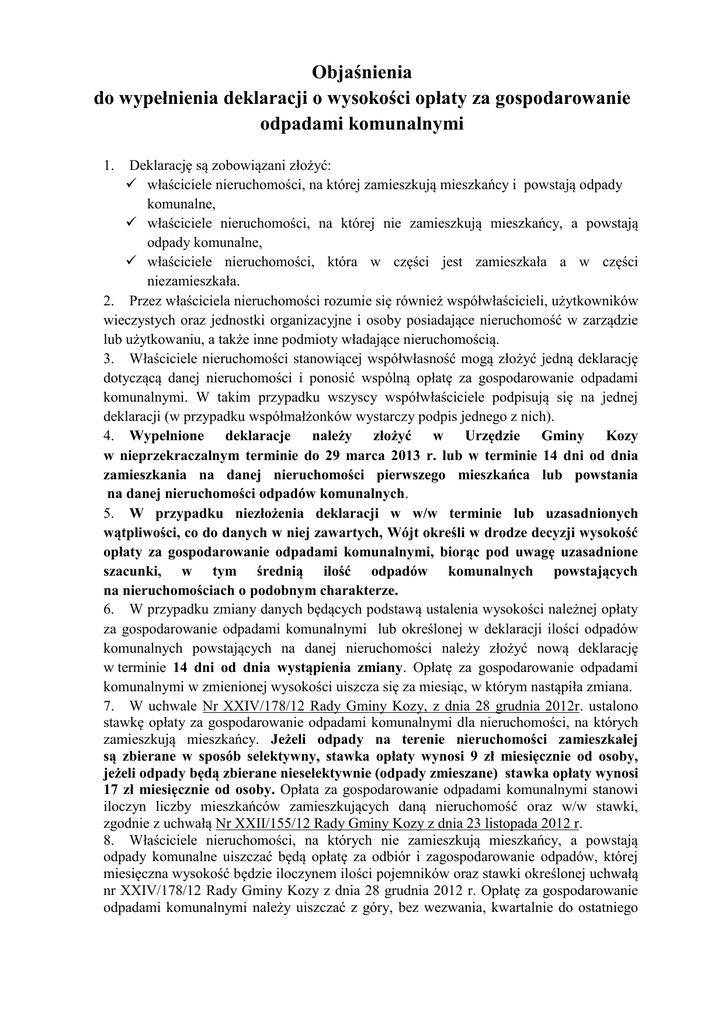 Objaśnienia do wypełnienia deklaracji o wysokości opłaty za gospodarowanie odpadami komunalnymi Deklarację są zobowiązani złożyć: właściciele nieruchomości, na której zamieszkują mieszkańcy i powstają odpady komunalne, właściciele nieruchomości, na której nie zamieszkują mieszkańcy, a powstają odpady komunalne, właściciele nieruchomości, która w części jest zamieszkała a w części niezamieszkała. 2. Przez właściciela nieruchomości rozumie się również współwłaścicieli, użytkowników wieczystych oraz jednostki organizacyjne i osoby posiadające nieruchomość w zarządzie lub użytkowaniu, a także inne podmioty władające nieruchomością. 3. Właściciele nieruchomości stanowiącej współwłasność mogą złożyć jedną deklarację dotyczącą danej nieruchomości i ponosić wspólną opłatę za gospodarowanie odpadami komunalnymi. W takim przypadku wszyscy współwłaściciele podpisują się na jednej deklaracji (w przypadku współmałżonków wystarczy podpis jednego z nich). 4. Wypełnione deklaracje należy złożyć w Urzędzie Gminy Kozy w nieprzekraczalnym terminie do 29 marca 2013 r. lub w terminie 14 dni od dnia zamieszkania na danej nieruchomości pierwszego mieszkańca lub powstania na danej nieruchomości odpadów komunalnych. 5. W przypadku niezłożenia deklaracji w w/w terminie lub uzasadnionych wątpliwości, co do danych w niej zawartych, Wójt określi w drodze decyzji wysokość opłaty za gospodarowanie odpadami komunalnymi, biorąc pod uwagę uzasadnione szacunki, w tym średnią ilość odpadów komunalnych powstających na nieruchomościach o podobnym charakterze. 6. W przypadku zmiany danych będących podstawą ustalenia wysokości należnej opłaty za gospodarowanie odpadami komunalnymi lub określonej w deklaracji ilości odpadów komunalnych powstających na danej nieruchomości należy złożyć nową deklarację w terminie 14 dni od dnia wystąpienia zmiany. Opłatę za gospodarowanie odpadami komunalnymi w zmienionej wysokości uiszcza się za miesiąc, w którym nastąpiła zmiana. 7. W uchwale Nr XXIV/178/12 Rady Gminy Kozy, z dnia 28 grudnia 2012r. ustalono stawkę opłaty za gospodarowanie odpadami komunalnymi dla nieruchomości, na których zamieszkują mieszkańcy. Jeżeli odpady na terenie nieruchomości zamieszkałej są zbierane w sposób selektywny, stawka opłaty wynosi 9 zł miesięcznie od osoby, jeżeli odpady będą zbierane nieselektywnie (odpady zmieszane) stawka opłaty wynosi 17 zł miesięcznie od osoby. Opłata za gospodarowanie odpadami komunalnymi stanowi iloczyn liczby mieszkańców zamieszkujących daną nieruchomość oraz w/w stawki, zgodnie z uchwałą Nr XXII/155/12 Rady Gminy Kozy z dnia 23 listopada 2012 r. 8. Właściciele nieruchomości, na których nie zamieszkują mieszkańcy, a powstają odpady komunalne uiszczać będą opłatę za odbiór i zagospodarowanie odpadów, której miesięczna wysokość będzie iloczynem ilości pojemników oraz stawki określonej uchwałą nr XXIV/178/12 Rady Gminy Kozy z dnia 28 grudnia 2012 r. Opłatę za gospodarowanie odpadami komunalnymi należy uiszczać z góry, bez wezwania, kwartalnie do ostatniego 1. dnia miesiąca rozpoczynającego każdy kwartał (tj. 31 stycznia, 30 kwietnia, 31 lipca, 31 października danego roku), w kasie Urzędu Gminy Kozy lub na indywidualne konto bankowe (zgodnie z Uchwałą Nr XXII/156/12 Rady Gminy Kozy z 23 listopada 2012r. w sprawie określenia terminu, częstotliwości i trybu uiszczania opłaty za gospodarowanie odpadami komunalnymi). Numery indywidualnych kont bankowych będą dostępne w Urzędzie Gminy Kozy lub przesłane właścicielom nieruchomości drogą elektroniczną. 9. Wszystkie uchwały, o których mowa w niniejszych objaśnieniach dostępne są w siedzibie Urzędu Gminy Kozy oraz na stronie internetowej Urzędu w Biuletynie Informacji Publicznej (www.bip.kozy.pl) w zakładce Uchwały Rady Gminy. CZĘŚĆ A: 1. Pierwszą deklarację składa się w terminie do 29 marca 2013r. lub w terminie 14 dni od powstania na danej nieruchomości odpadów lub zamieszkania na nieruchomości pierwszego mieszkańca. 2. W przypadku wystąpienia zmiany danych zawartych w pierwszej deklaracji (np. zmiana liczby osób zamieszkujących daną nieruchomości) należy złożyć nową deklarację, podając równocześnie datę zaistnienia tych zmian. CZĘŚĆ B: Należy zaznaczyć formę władania nieruchomością spośród wymienionych w części B deklaracji: właściciel lub współwłaściciel (należy podać liczbę wszystkich współwłaścicieli), użytkownik wieczysty, zarządca, najemca, dzierżawca, inna forma władania nieruchomością, należy zaznaczyć „x” w odpowiednim kwadracie. CZĘŚĆ C: Składającym deklarację może być: osoba fizyczna, osoba prawna (np. zakłady, instytucje, urzędy, szkoły, przedszkola itd.), jednostka organizacyjna nie posiadająca osobowości prawnej (np. spółka cywilna, stowarzyszenie zwykłe, spółki: jawna, partnerska, komandytowa, komandytowoakcyjna, itd.). Właściciel nieruchomości wpisuje wszystkie dane osobowe oraz adres zamieszkania lub siedziby; w przypadku osób prawnych oraz jednostek organizacyjnych nie posiadających osobowości prawnej należy wpisać całą nazwę oraz podać sposób reprezentacji zgodny z przepisami prawa. CZĘŚĆ D: Należy określić adres oraz rodzaj nieruchomości, na której powstają odpady komunalne: a) nieruchomość zamieszkała, czyli nieruchomość, na której przebywają osoby oraz powstają odpady komunalne, b) nieruchomość niezamieszkała, czyli nieruchomość, na której nie zamieszkują mieszkańcy a powstają odpady komunalne w wyniku prowadzonej działalności gospodarczej oraz obiekty użyteczności publicznej, szkoły, przedszkola, działki rekreacyjne, domki letniskowe, cmentarz, sklepy, itp. c) nieruchomość w części zamieszkała a w części niezamieszkała, czyli nieruchomość, na której zamieszku