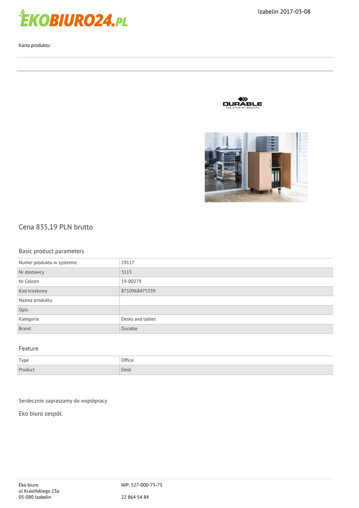 Izabelin 2017-03-08 Karta produktu: Cena 835,19 PLN brutto Basic product parameters Numer produktu w systemie 29117 Nr dostawcy 3115 Nr Celcen 19-00279 Kod kreskowy 8710968475339 Nazwa produktu Opis Kategoria Desks and tables Brand Durable Feature Type Office Product Desk Serdecznie zapraszamy do współpracy Eko biuro zespół. Eko biuro ul Krasińskiego 23a 05-080 Izabelin NIP: 527-000-75-75 22 864 54 84