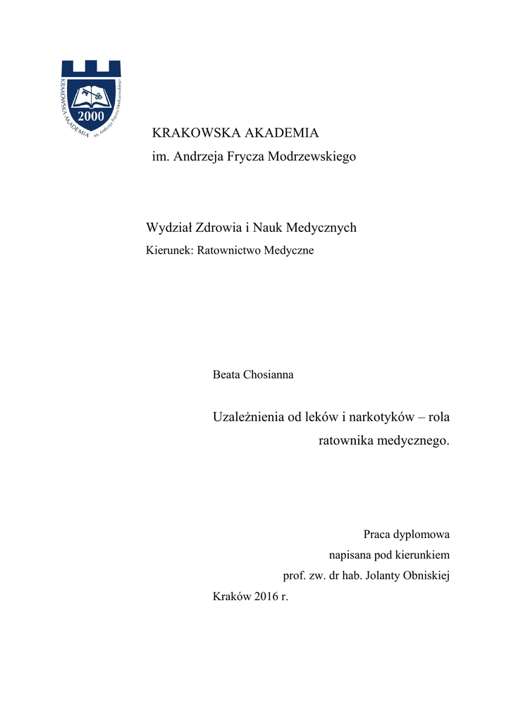KRAKOWSKA AKADEMIA im. Andrzeja Frycza Modrzewskiego Wydział Zdrowia i Nauk Medycznych Kierunek: Ratownictwo Medyczne Beata Chosianna Uzależnienia od leków i narkotyków – rola ratownika medycznego. Praca dyplomowa napisana pod kierunkiem prof. zw. dr hab. Jolanty Obniskiej Kraków 2016 r. SPIS TREŚCI 1.WSTĘP……………………………………………………………………………………….1 2. PROBLEM NARKOMANII I UZALEŻNIEŃ 2.1 NARKOMANIA W POLSCE……………………………………………………..2 2.2 PROBLEMY ZWIĄZANE Z NARKOTYKAMI……………………………....…2 2.3 CZYM JEST UZALEŻNIENIE ?...........................................................................3 2.4 RODZAJE UZALEŻNIEŃ………………………………………………………...5 3. NARKOTYKI 3.1 CO TO JEST NARKOTYK………………………………………………………..6 3.2 TOKSYKOMANIA………………………………………………………………..6 3.3 DZIAŁANIE NARKOTYKÓW…………………………………………………...7 3.4 KLASYFIKACJA SUBSTANCJI PSYCHOAKTYWNYCH……………………8 3.5 CHARAKTERSTYKA WYBRANYCH NARKOTYKÓW……………………...8 3.5.1 Amfetamina………………………………………………………………8 3.5.2 Kokaina…………………………………………………………………..9 3.5.3 Morfina…………………………………………………………………..9 3.5.4 Heroina………………………………………………………………….10 3.5.5 Konopie Indyjskie….…………………………………………………...11 3.5.6 LSD…………………..…………………………………………………11 3.5.7 ECSTASY………………………………………………………………11 3.5.8 Barbiturany………….…………………………………………………..12 3.5.9 Benzodiazepiny………..………………………………………………..12 3.6 LEKI UZALEŻNIAJĄCE WYDAWANE BEZ RECEPTY…………………...13 4. ROLA RATOWNIKA MEDYCZNEGO………………………………………...14 4.1 PO PIERWSZE – MIEJSCE ZDARZENIA…………………………………….14 4.2 OBJAWY…………………………………………………………………..…....15 4.3 PODSTAWOWE POSTĘPOWANIE……………………………………...……17 4.4 ZAPOBIEGANIE RESORPCJI…………………………………………………..18 4.5 ZATRZYMANIE KRĄŻENIA…………………………………………………...18 4.6 WSTRZĄS………………………………………………………………………..19 4.7 DRGAWKI…………………………………………………………………...…..19 4.8 TOKSYCZNY OBRZĘK PŁUC……………………………………...……….....19 4.9 ODTRUTKI………………………………………………………………………19 4.10 OPIOIDY…………………………………………………………….………….20 5. PODSUMOWANIE………………………………………………………..………………21 1.WSTĘP Uzależnienia wszelkiego rodzaju – to problem społeczny, obejmujący różne grupy wiekowe, w przypadku substancji psychoaktywnych najczęściej dotyka on młodzieży i osoby młode. Dla pojedynczej jednostki uzależnienie oznacza zaburzenie procesów psychicznych i somatycznych. W życiu społecznym uzależnienie objawia się jako niepohamowany nacisk przyjmowania określonych substancji, co stopniowo powoduje utratę kontroli nad zachowaniem, ciężkie nieleczone uzależnienia prowadzą do wyłączenia z prawidłowego funkcjonowania w społeczeństwie i ukierunkowanie życia zaburzonej jednostki na kompulsywne metody zaspokajania swojego łaknienia na substancję uzależniającą. Ostre zatrucia substancjami chemicznymi to stany nagłego zagrożenia życia, wymagające reakcji osoby będącej świadkiem zdarzenia oraz pilnej interwencji podjętej przez zespół ratownictwa medycznego. Chociaż procent wyjazdów zespołów ratownictwa medycznego do ostrych zatruć narkotykami w ogólnej puli jest dość mały, problem uzależnień jest dość poważny, ponieważ zatrucia mogą szybko doprowadzić do stanu zagrożenia życia, dlatego ratownik medyczny powinien być przygotowany na wyjazdy również tego typu oraz móc wykazać się podstawową wiedzą na temat uzależnień. Motywem wyboru tematu pracy była chęć przedstawienia problematyki uzależnień i narkomanii w zakresie wiedzy wartościowej dla ratownika medycznego. Ponadto celem artykułu jest określenie roli ratownika medycznego w postępowaniu z osobami w stanie zatrucia substancjami toksycznymi jakimi są narkotyki oraz przybliżenie specyfiki postępowania z pacjentami uzależnionymi. Ponieważ postępowanie ratownicze musi opierać się na rzetelnej wiedzy, którą dopiero można wykorzystać w praktyce, pierwsze trzy rozdziały powstały w celu przekazania podstaw teorii na temat uzależnień, narkotyków i problemu narkomanii, które ratownik medyczny powinien znać. W następnej części pracy omówione zostało podstawowe postępowanie ratownicze wobec osoby pod wpływem narkotyków z uwzględnieniem oceny miejsca zdarzenia, rozpoznawania podstawowych objawów przedawkowania poszczególnych substancji oraz roli ratownika medycznego w ratowaniu zdrowia i życia osoby, u której doszło do przedawkowania. [3,4,5] 2. PROBLEM NARKOMANII I UZALEŻNIEŃ 2.1 NARKOMANIA W POLSCE W Polsce, liczbę osób używających narkotyków, oszacowano po raz pierwszy w roku 1994. Dane przedstawiały ilość użytkowników w województwach kieleckim i wrocławskim. Wyniki wynosiły ok 20-40 tys osób korzystających z narkotyków w skali kraju. Kolejne badania wykonano w roku 2001. Źródłami danych były dane lecznictwa stacjonarnego, ambulatoryjnego oraz ankiet