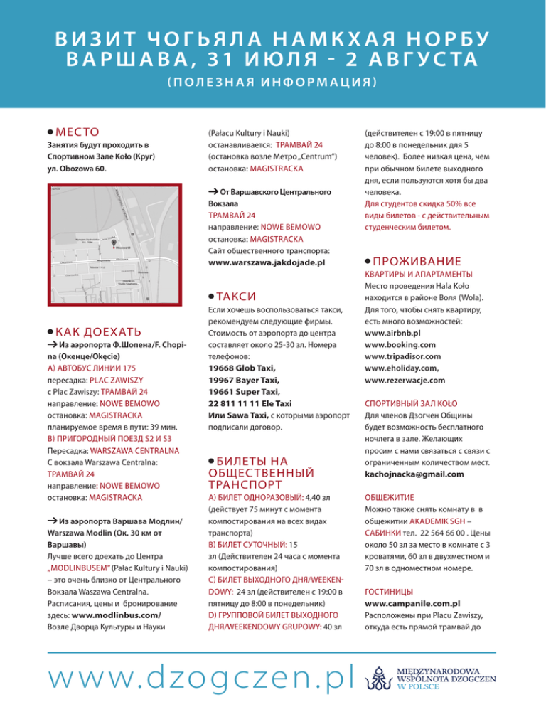 ВИЗИТ ЧОГЬЯЛА НАМКХАЯ НОРБУ В А Р Ш А В А , 3 1 И Ю Л Я - 2 А В Г У С ТА (ПОЛЕЗНАЯ ИНФОРМАЦИЯ) МЕС ТО Занятия будут проходить в Спортивном Зале Koło (Круг) ул. Obozowa 60. (Pałacu Kultury i Nauki) останавливается: ТРАМВАЙ 24 (остановка возле Mетро „Centrum”) остановка: MAGISTRACKA От Варшавского Центрального Вокзала ТРАМВАЙ 24 направление: NOWE BEMOWO остановка: MAGISTRACKA Сайт общественного транспорта: www.warszawa.jakdojade.pl ТАКСИ КАК ДОЕХАТЬ Из аэропорта Ф.Шопена/F. Chopina (Окенце/Okęcie) A) АВТОБУС ЛИНИИ 175 пересадка: PLAC ZAWISZY с Plac Zawiszy: ТРАМВАЙ 24 направление: NOWE BEMOWO остановка: MAGISTRACKA планируемое время в пути: 39 мин. B) ПРИГОРОДНЫЙ ПОЕЗД S2 И S3 Пересадка: WARSZAWA CENTRALNA С вокзала Warszawa Centralna: ТРАМВАЙ 24 направление: NOWE BEMOWO остановка: MAGISTRACKA Из аэропорта Варшава Модлин/ Warszawa Modlin (Ок. 30 км от Варшавы) Лучше всего доехать до Центра „MODLINBUSEM” (Pałac Kultury i Nauki) – это очень близко от Центрального Вокзала Waszawa Centralna. Расписания, цены и бронирование здесь: www.modlinbus.com/ Возле Дворца Культуры и Науки Если хочешь воспользоваться такси, рекомендуем следующие фирмы. Стоимость от аэропорта до центра составляет около 25-30 зл. Номера телефонов: 19668 Glob Taxi, 19967 Bayer Taxi, 19661 Super Taxi, 22 811 11 11 Ele Taxi Или Sawa Taxi, с которыми аэропорт подписали договор. БИЛЕТЫ НА ОБЩЕС ТВЕННЫЙ ТРАНСПОРТ A) БИЛЕТ ОДНОРАЗОВЫЙ: 4,40 зл (действует 75 минут с момента компостирования на всех видах транспорта) B) БИЛЕТ СУТОЧНЫЙ: 15 зл (Действителен 24 часа с момента компостирования) C) БИЛЕТ ВЫХОДНОГО ДНЯ/WEEKENDOWY: 24 зл (действителен с 19:00 в пятницу до 8:00 в понедельник) D) ГРУППОВОЙ БИЛЕТ ВЫХОДНОГО ДНЯ/WEEKENDOWY GRUPOWY: 40 зл www.dzogczen.pl (действителен с 19:00 в пятницу до 8:00 в понедельник для 5 человек). Более низкая цена, чем при обычном билете выходного дня, если пользуются хотя бы два человека. Для студентов скидка 50% все виды билетов - с действительным студенческим билетом. ПРОЖИВАНИЕ КВАРТИРЫ И АПАРТАМЕНТЫ Место проведения Hala Koło находится в районе Воля (Wola). Для того, чтобы снять квартиру, есть много возможностей: www.airbnb.pl www.booking.com www.tripadisor.com www.eholiday.com, www.rezerwacje.com СПОРТИВНЫЙ ЗАЛ KOŁO Для членов Дзогчен Общины будет возможность бесплатного ночлега в зале. Желающих просим с нами связаться с связи с ограниченным количеством мест. [email protected] ОБЩЕЖИТИЕ Можно также снять комнату в в общежитии AKADEMIK SGH – САБИНКИ тел. 22 564 66 00 . Цены около 50 зл за место в комнате с 3 кроватями, 60 зл в двухместном и 70 зл в одноместном номере. ГОСТИНИЦЫ www.campanile.com.pl Расположены при Placu Zawiszy, откуда есть прямой трамвай до ВИЗИТ ЧОГЬЯЛА НАМКХАЯ НОРБУ В А Р Ш А В А , 3 1 И Ю Л Я - 2 А В Г У С ТА (ПОЛЕЗНАЯ ИНФОРМАЦИЯ) Зала Коло (Hali Koło). Цены от 150 зл за двухместный номер. www.accorhotels.com a) Гостиница IBIS Варшава Центр, Алея Солидарности (Aleja Solidarności) 165 b) Гостиница IBIS Reduta, Ул. Варшавской Битвы (Bitwy Warszawskiej) 16 www.premiereclasse.com Premiere Classe ул. Товарова (Towarowa) около Площади Завиши (Placu Zawiszy), рядом с Campanile ХОСТЕЛ www.chmielna5.pl www.moonhostel.pl/hostel -warszawa/start/ www. okidoki.pl Если тебе нужна помощь при бронировании места в гостинице, хостеле или общежитии, пиши по адресу: [email protected] МАГАЗИНЫ Marcpol Ул. Ożarowska 61 Пн-сб 7-21; вск 9-18 Biedronka Ул. Deotymy 56 Пн-пт 7-22; суб 7-21; Вс 9-20 Carrefour Express Ул. Obozowa 87 CARREFOUR Express Ул. Ciołka 19/25 Пн-пт 6-22; Сб 7-22; вс 9-21 Delikatesy Centrum Ул. Ciołka 10 24h Ул. Obozowa 61 24h Ул. Obozowa 82 PSS Społem Ул. Górczewska 80 Ideal Ул. Banderii 4 (угол Obozowej и Radziwie) Żabka Ул. Zawiszy 16 Top Market Ул. Górczewska 93 ГДЕ ПОЕС ТЬ Остановка Koło Ул. Obozowa 80, +48 504 504 616 Пн-пт: 12-22:30, сб. 10-22:30, Вс. 10-21:30 Tajska Bazylia Ул. Erazma Ciołka 19/25 Пр 12-21,вт-пт 11- 22, сб 12-22, Вс 13-21 Sushi Wola Ул. Erazma Ciołka 20, тел. 22 251 2222 Пн-чт 12-21, пт 12-22, сб-вс 12-21 Pizz