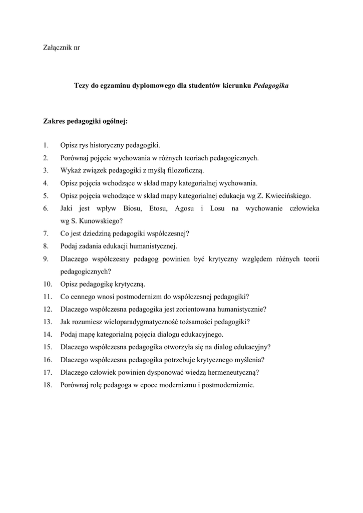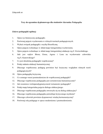 Załącznik nr Tezy do egzaminu dyplomowego dla studentów kierunku Pedagogika Zakres pedagogiki ogólnej: 1. Opisz rys historyczny pedagogiki. 2. Porównaj pojęcie wychowania w różnych teoriach pedagogicznych. 3. Wykaż związek pedagogiki z myślą filozoficzną. 4. Opisz pojęcia wchodzące w skład mapy kategorialnej wychowania. 5. Opisz pojęcia wchodzące w skład mapy kategorialnej edukacja wg Z. Kwiecińskiego. 6. Jaki jest wpływ Biosu, Etosu, Agosu i Losu na wychowanie człowieka wg S. Kunowskiego? 7. Co jest dziedziną pedagogiki współczesnej? 8. Podaj zadania edukacji humanistycznej. 9. Dlaczego współczesny pedagog powinien być krytyczny względem różnych teorii pedagogicznych? 10. Opisz pedagogikę krytyczną. 11. Co cennego wnosi postmodernizm do współczesnej pedagogiki? 12. Dlaczego współczesna pedagogika jest zorientowana humanistycznie? 13. Jak rozumiesz wieloparadygmatyczność tożsamości pedagogiki? 14. Podaj mapę kategorialną pojęcia dialogu edukacyjnego. 15. Dlaczego współczesna pedagogika otworzyła się na dialog edukacyjny? 16. Dlaczego współczesna pedagogika potrzebuje krytycznego myślenia? 17. Dlaczego człowiek powinien dysponować wiedzą hermeneutyczną? 18. Porównaj rolę pedagoga w epoce modernizmu i postmodernizmie. Zakres metodologii badań pedagogicznych: 1. Wymień i scharakteryzuj etapy badań pedagogicznych. 2. Wymień różnice pomiędzy jakościowymi i ilościowymi badaniami w pedagogice. 3. Opisz moralne aspekty pedagogicznych badań naukowych. 4. Zdefiniuj pojęcia metoda badawcza, technika badań i narzędzie badawcze, opisz relacje pomiędzy tymi pojęciami. 5. Opisz rozumienie i rodzaje problemów badawczych w pedagogice. 6. Zdefiniuj hipotezy robocze i stawiane im wymagania. 7. Opisz użyteczność badań eksperymentalnych w pedagogice. 8. Metoda sondażu diagnostycznego – wymagania jej stawiane. 9. Wymień problemy badawcze, które można badać metodą monografii pedagogicznej. 10. Metoda indywidualnych przypadków - opisz jej zalety i wady. 11. Wymień i scharakteryzuj techniki badawcze w badaniach pedagogicznych. 12. Wymień kryteria poprawności kwestionariusza ankiety. 13. Opisz technikę obserwacji i jej rodzaje. 14. Scharakteryzuj techniki badań socjometrycznych. 15. Jakie są kryteria doboru próby badawczej w badaniach pedagogicznych. Zakres specjalności Edukacja wczesnoszkolna z wychowaniem przedszkolnym: 1. Pedagogika przedszkolna jako subdyscyplina nauk pedagogicznych - jej przedmiot, cele, funkcje i zadania. 2. Złożony charakter pedagogiki wczesnoszkolnej – cele, funkcje i zadania. 3. Podstawowe formy działalności dziecka w wieku przedszkolnym – zabawa, praca, nauka. 4. Metody rozwijające aktywność edukacyjną dziecka w młodszym wieku szkolnym – pojęcie, klasyfikacja, charakterystyka. 5. Stymulowanie rozwoju dziecka w przedszkolu. 6. Rola i znaczenie literatury dziecięcej w kształtowaniu osobowości dziecka. 7. Współczesne tendencje i innowacje w edukacji przedszkolnej. 8. Miejsce i rola środków dydaktycznych w edukacji przedszkolnej i wczesnoszkolnej. 9. Proces adaptacji dziecka w przedszkolu i w szkole. 10. Planowanie pracy dydaktyczno – wychowawczej nauczyciela w klasach I-III. 11. Gotowość dziecka do podjęcia obowiązku szkolnego – wskaźniki i wyznaczniki. 12. Udział rodziców w edukacji dzieci. 13. Metody, formy i zasady pracy w przedszkolu. 14. Indywidualizacja we wspomaganiu rozwoju dzieci. 15. Wybrane koncepcje edukacji alternatywnej stosowane w przedszkolu i w klasach I-III. 16. Trudności w nauce czytania i pisania dzieci. 17. Diagnoza, profilaktyka i terapia w edukacji przedszkolnej i wczesnoszkolnej. 18. Ewaluacja osiągnięć edukacyjnych w przedszkolu i w klasach I-III. Zakres specjalności Pedagogika opiekuńczo – wychowawcza: 1. Opiekuńcze funkcje rodziny i szkoły. 2. Struktura i funkcje polskiego systemu opieki nad dzieckiem. 3. Diagnozowanie potrzeb opiekuńczych dzieci i młodzieży. 4. Różne oblicza sieroctwa. 5. Instytucjonalne i rodzinne formy opieki nad dzieckiem w Polsce. 6. Dom dziecka jako środowisko opiekuńczo – wychowawcze. 7. Profilaktyka zachowań problemowych. 8. Usamodzielnianie wychowanków placówek opiekuńczo-wychowawczych i resocjalizacyjnych. 9. Oddziaływania opiekuńcze, wychowawcze i resocjalizacyjne w placówkach dla młodzieży społecznie niedostosowanej. 10. Kierunki zmian w polskim systemie opieki nad dziećmi - inspiracje europejskie. 11. Formy terapii w pracy z dziećmi osieroconymi. 12. Indywidualny plan pracy z dzieckiem i jego rodziną w placówce opiekuńczowychowawczej. 13. Realizacja indywidualnych programów edukacyjno-terapeutycznych uczniów ze specjalnymi potrzebami edukacyjnymi. 14. Przestrzeganie praw dziecka w Polsce. 15. Praca opiekuńczo - wychowawcza z dzieckiem agresywnym i nadpobudliwym psychoruchowo.