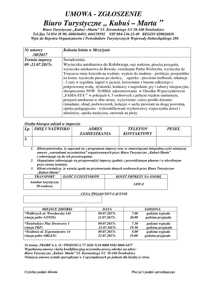 UMOWA - ZGŁOSZENIE Biuro Turystyczne „ Kubuś – Marta ” Biuro Turystyczne „Kubuś –Marta” Ul. Żeromskiego 1/1 58-160 Świebodzice Tel./fax 74 854 38 90; 608636483; 604139592 NIP 884-136-23-49 REGON 020026018 Wpis do Rejestru Organizatorów i Pośredników Turystycznych Wojewody Dolnośląskiego 288 Nr umowy /M/2017 Termin imprezy 09 -21.07.2017r. Kolonia letnia w Mrzeżynie Świadczenia: Wycieczka autokarowa do Kołobrzegu, rejs statkiem, piracka przygoda, wycieczka autokarowa do Rewala- zwiedzanie Parku Wieloryba, wycieczka do Trzęsacza ruiny kościoła na wydmie, wyjście do stadniny - prelekcja, przejażdżka na koniu, wycieczki piesze po okolicy, ognisko - pieczenie kiełbasek, inhalacje - 2 razy w tygodniu, kąpiel w jacuzzi, korzystanie z basenu odkrytego z podgrzewaną wodą, dyskoteki, konkursy z nagrodami, gry i zabawy integracyjne, ubezpieczenie NNW 10.000zł, zakwaterowanie w Ośrodku Wypoczynkowym „FAMA-STA"” w pokojach 4, 5 osobowych z pełnym węzłem sanitarnym, przejazd autokarem w obie strony, wyżywienie: cztery posiłki dziennie (śniadanie, obiad, podwieczorek, kolacja) + suchy prowiant na drogę powrotną, opieka pedagogiczna - wykwalifikowani wychowawcy wypoczynku dzieci i młodzieży, opieka medyczna, ratownik na plaży. Osoba biorąca udział w imprezie Lp. IMIĘ I NAZWISKO ADRES ZAMIESZKANIA 1. TELEFON KONTAKTOWY PESEL 1. Klient potwierdza, że zapoznał się z programem imprezy oraz ze stanowiącymi integralną część niniejszej umowy „warunkami uczestnictwa” organizowanych przez Biuro Turystyczne „Kubuś-Marta” i zobowiązuje się do ich przestrzegania. 2. Organizator zobowiązuje się przeprowadzić imprezę zgodnie z przewidzianym planem i w określonym przez strony terminie. 3. Klient oświadcza, że wyraża zgodę na przetwarzanie danych osobowych przez Biuro Turystyczne „Kubuś-Marta” TRANSPORT ILOŚĆ UCZESTNIKÓW KOSZT IMPREZY NA OSOBĘ Autokar turystyczny 50 osobowy 1450 zł CENA ŚWIADCZEŃ ŁĄCZNIE MIEJSCE ZBIÓRKI *Wałbrzych ul. Wrocławska 144 (stacja paliw LOTOS) DATA 09.07.2017r. 21.07.2017r. 7.00 20.00 GODZINA godzina wyjazdu godzina przyjazdu *Świebodzice Plac Dworcowy 1 (stacja PKP) *Świdnica ul. Esperantystów 14 (stacja paliw ORLEN) 09.07.2017r. 21.07.2017r. 09.07.2017r. 21.07.2017r. 7.30 19.30 8.00 19.00 godzina wyjazdu godzina przyjazdu godzina wyjazdu godzina przyjazdu Nr konta: PKOBP S.A. O / ŚWIDNICA 77 1020 5138 0000 9502 0068 6477 Wypełnioną umowę i kartę kwalifikacyjną uczestnika proszę odesłać na adres: Biuro Turystyczne ,,Kubuś- Marta” Ul. Żeromskiego 1/1 58-160 Świebodzice Niniejsza umowa została sporządzona w 2 egzemplarzach po jednym dla każdej ze stron Czytelny podpis klienta Pieczęć i podpis sprzedającego