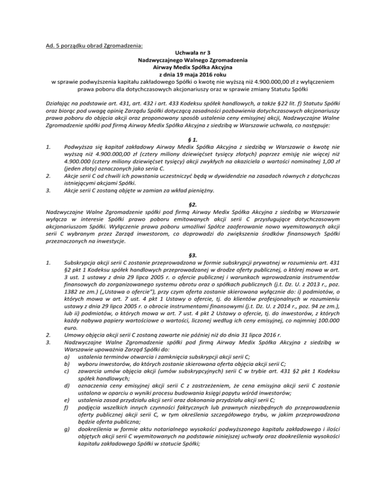 Ad. 5 porządku obrad Zgromadzenia: Uchwała nr 3 Nadzwyczajnego Walnego Zgromadzenia Airway Medix Spółka Akcyjna z dnia 19 maja 2016 roku w sprawie podwyższenia kapitału zakładowego Spółki o kwotę nie wyższą niż 4.900.000,00 zł z wyłączeniem prawa poboru dla dotychczasowych akcjonariuszy oraz w sprawie zmiany Statutu Spółki Działając na podstawie art. 431, art. 432 i art. 433 Kodeksu spółek handlowych, a także §22 lit. f) Statutu Spółki oraz biorąc pod uwagę opinię Zarządu Spółki dotyczącą zasadności pozbawienia dotychczasowych akcjonariuszy prawa poboru do objęcia akcji oraz proponowany sposób ustalenia ceny emisyjnej akcji, Nadzwyczajne Walne Zgromadzenie spółki pod firmą Airway Medix Spółka Akcyjna z siedzibą w Warszawie uchwala, co następuje: 1. 2. 3. § 1. Podwyższa się kapitał zakładowy Airway Medix Spółka Akcyjna z siedzibą w Warszawie o kwotę nie wyższą niż 4.900.000,00 zł (cztery miliony dziewięćset tysięcy złotych) poprzez emisję nie więcej niż 4.900.000 (cztery miliony dziewięćset tysięcy) akcji zwykłych na okaziciela o wartości nominalnej 1,00 zł (jeden złoty) oznaczonych jako seria C. Akcje serii C od chwili ich powstania uczestniczyć będą w dywidendzie na zasadach równych z dotychczas istniejącymi akcjami Spółki. Akcje serii C zostaną objęte w zamian za wkład pieniężny. §2. Nadzwyczajne Walne Zgromadzenie spółki pod firmą Airway Medix Spółka Akcyjna z siedzibą w Warszawie wyłącza w interesie Spółki prawo poboru emitowanych akcji serii C przysługujące dotychczasowym akcjonariuszom Spółki. Wyłączenie prawa poboru umożliwi Spółce zaoferowanie nowo wyemitowanych akcji serii C wybranym przez Zarząd inwestorom, co doprowadzi do zwiększenia środków finansowych Spółki przeznaczonych na inwestycje. 1. 2. 3. §3. Subskrypcja akcji serii C zostanie przeprowadzona w formie subskrypcji prywatnej w rozumieniu art. 431 §2 pkt 1 Kodeksu spółek handlowych przeprowadzanej w drodze oferty publicznej, o której mowa w art. 3 ust. 1 ustawy z dnia 29 lipca 2005 r. o ofercie publicznej i warunkach wprowadzania instrumentów finansowych do zorganizowanego systemu obrotu oraz o spółkach publicznych (j.t. Dz. U. z 2013 r., poz. 1382 ze zm.) („Ustawa o ofercie”), przy czym oferta zostanie skierowana wyłącznie do: i) podmiotów, o których mowa w art. 7 ust. 4 pkt 1 Ustawy o ofercie, tj. do klientów profesjonalnych w rozumieniu ustawy z dnia 29 lipca 2005 r. o obrocie instrumentami finansowymi (j.t. Dz. U. z 2014 r., poz. 94 ze zm.), lub ii) podmiotów, o których mowa w art. 7 ust. 4 pkt 2 Ustawy o ofercie, tj. do inwestorów, z których każdy nabywa papiery wartościowe o wartości, liczonej według ich ceny emisyjnej, co najmniej 100.000 euro. Umowy objęcia akcji serii C zostaną zawarte nie później niż do dnia 31 lipca 2016 r. Nadzwyczajne Walne Zgromadzenie spółki pod firmą Airway Medix Spółka Akcyjna z siedzibą w Warszawie upoważnia Zarząd Spółki do: a) ustalenia terminów otwarcia i zamknięcia subskrypcji akcji serii C; b) wyboru inwestorów, do których zostanie skierowana oferta objęcia akcji serii C; c) zawarcia umów objęcia akcji (umów subskrypcyjnych) serii C w trybie art. 431 §2 pkt 1 Kodeksu spółek handlowych; d) oznaczenia ceny emisyjnej akcji serii C z zastrzeżeniem, że cena emisyjna akcji serii C zostanie ustalona w oparciu o wyniki procesu budowania księgi popytu wśród inwestorów; e) ustalenia zasad przydziału akcji serii oraz dokonania przydziału akcji serii C; f) podjęcia wszelkich innych czynności faktycznych lub prawnych niezbędnych do przeprowadzenia oferty publicznej akcji serii C, w tym określenia szczegółowego trybu, w jakim przeprowadzona będzie oferta publiczna; g) dookreślenia w formie aktu notarialnego wysokości podwyższonego kapitału zakładowego i ilości objętych akcji serii C wyemitowanych na podstawie niniejszej uchwały oraz dookreślenia wysokości kapitału zakładowego Spółki w statucie Spółki; h) i) dokonania wszelkich innych czynności niezbędnych do wpisu niniejszej Uchwały do rejestru przedsiębiorców Krajowego Rejestru Sądowego; zawarcia umowy o rejestrację akcji serii C w depozycie papierów wartościowych oraz dopuszczenia i wprowadzenia ich do obrotu na Giełdzie Papierów Wartościowych w Warszawie S.A. §4. W związku z podwyższeniem kapitału zakładowego Spółki zmienia się §6 ust. 1 Statutu Spółki w ten sposób, że przepis ten otrzymuje nowe następujące brzmienie: 1. Kapitał zakładowy Spółki wynosi nie mniej niż 49.518.445,00 zł (słownie: czterdzieści dziewięć milionów pięćset osiemnaście tysięcy czterysta czterdzieści pięć złotych) i nie więcej niż 54.418.444,00 zł (słownie: pięćdziesiąt cztery miliony czterysta osiemnaście tysięcy czterysta czterdzieści cztery złote) oraz dzieli się na nie mniej niż 49.518.445 (słownie: czterdzieści dziewięć milionów pięćset osiemnaście tysięcy czterysta czterdzieści pięć) i nie więcej niż 54.418.444 (słownie: pięćdziesiąt cztery miliony czterysta osiemnaście tysięcy czterysta czterdzieści cztery) akcje o wartości nominalnej 1,00 zł (słownie: jeden złoty) każda. Akcje w kapitale zakładowym Spółki dzielą się na następujące serie: a) 43.518.444 (słownie: czterdzieści trzy miliony pięćset osiemnaście tysięcy czterysta czterdzieści cztery) akcje zwykłe na okaziciela serii A; b) 6.000.000 (słownie: sześć milionów) akcji zwykłych na okaziciela serii B; c) nie więcej niż 4.900.000 (cztery miliony dziewięćset tysięcy) akcji zwykłych na okaziciela serii C. §5. Uchwała wchodzi w życie z dniem podjęcia.