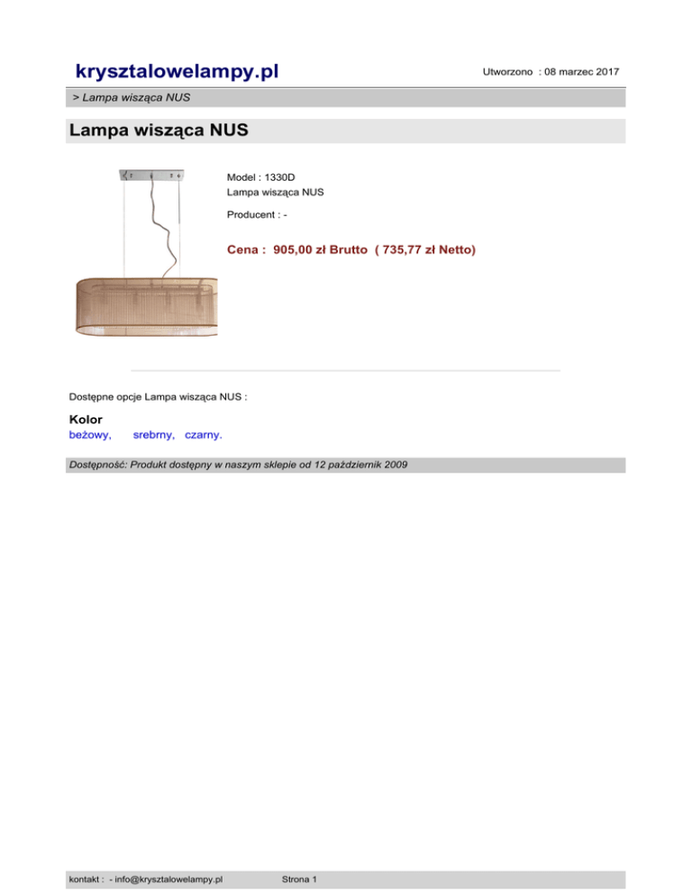 krysztalowelampy.pl Utworzono : 08 marzec 2017 > Lampa wisząca NUS Lampa wisząca NUS Model : 1330D Lampa wisząca NUS Producent : - Cena : 905,00 zł Brutto ( 735,77 zł Netto) Dostępne opcje Lampa wisząca NUS : Kolor beżowy, srebrny, czarny. Dostępność: Produkt dostępny w naszym sklepie od 12 październik 2009 kontakt : - [email protected] Strona 1