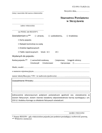 F23-PO-17u/KD (A) Strzyżów dnia,…………….… .............................................................. (imię i nazwisko lub nazwa właściciela) Starostwo Powiatowe w Strzyżowie ................................................................... ................................................................... (adres właściciela) ................................................................... (nr PESEL lub REGON*) Zawiadamiam o:** utracie, uszkodzeniu, kradzieży: Karty pojazdu Nalepki kontrolnej na szybę Znaków legalizacyjnych Tablic rejestracyjnych: Sztuk: 1 2 Wydanych do pojazdu: Rodzaj pojazdu:** samochód osobowy, ciężarowy ciągnik rolniczy motocykl motorower przyczepa …………..……………… Marki, model………………………………………………………….………………………… o numerze rejestracyjnym............................................................................................................. numer identyfikacyjny VIN / nr nadwozia (podwozia)…………................................................ Uzasadnienie Wniosku:…………………………………………………………………….... ………………………………………………………………………………………………….. ………………………………………………………………………………………………….. Jednocześnie własnoręcznym podpisem poświadczam zgodność ww. oświadczenia ze stanem faktycznym. Jestem również świadomy odpowiedzialności karnej wynikającej z art. 233 § 1 Kodeksu Karnego za składanie fałszywych oświadczeń. ....................................................... (podpis właściciela) * Numer REGON - gdy właścicielem pojazdu jest podmiot posiadający osobowość prawną. ** Właściwe zaznaczyć.