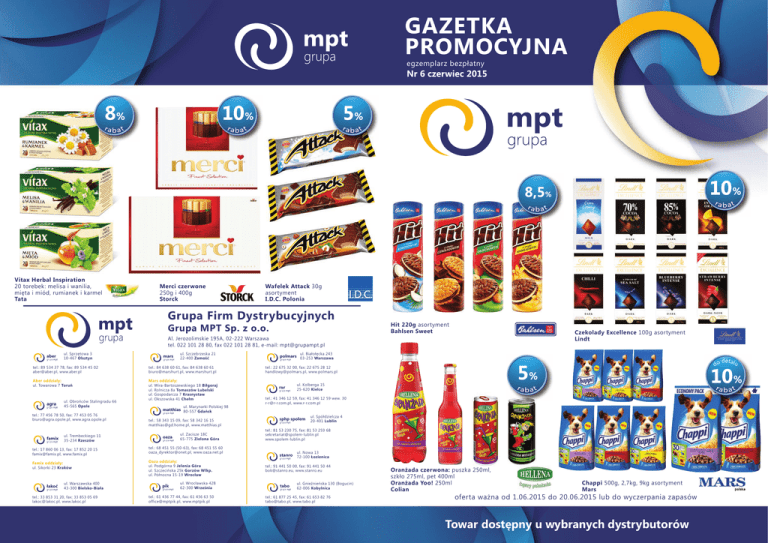 GAZETKA PROMOCYJNA egzemplarz bezpłatny Nr 6 czerwiec 2015 8% 10% 5% 10% 8,5% Vitax Herbal Inspiration 20 torebek: melisa i wanilia, mięta i miód, rumianek i karmel Tata Merci czerwone 250g i 400g Storck Wafelek Attack 30g asortyment I.D.C. Polonia Grupa Firm Dystrybucyjnych Grupa MPT Sp. z o.o. Hit 220g asortyment Bahlsen Sweet Czekolady Excellence 100g asortyment Lindt Al. Jerozolimskie 195A, 02-222 Warszawa tel. 022 101 28 80, fax 022 101 28 81, e-mail: [email protected] ul. Sprzętowa 3 10-467 Olsztyn ul. Szczebrzeska 21 22-400 Zamość tel.: 89 534 37 78, fax: 89 534 45 02 [email protected], www.aber.pl tel.: 84 638 60 61, fax: 84 638 60 61 [email protected], www.marshurt.pl Aber oddziały: ul. Towarowa 7 Toruń Mars oddziały: ul. Wira-Bartoszewskiego 18 Biłgoraj ul. Rolnicza 8a Tomaszów Lubelski ul. Gospodarcza 7 Krasnystaw ul. Okszowska 41 Chełm ul. Obrońców Stalingradu 66 45-565 Opole tel.: 77 456 78 50, fax: 77 453 05 76 [email protected], www.agra.opole.pl ul. Trembeckiego 11 35-234 Rzeszów ul. Marynarki Polskiej 98 80-557 Gdańsk tel.: 58 343 15 09, fax: 58 342 16 15 [email protected], www.matthias.pl ul. Zacisze 18C 65-775 Zielona Góra tel.: 17 860 06 13, fax: 17 852 20 15 [email protected], www.famix.pl tel.: 68 451 55 (50-63), fax: 68 451 55 60 [email protected], www.oaza.net.pl Famix oddziały: ul. Sikorki 23 Kraków Oaza oddziały: ul. Podgórna 9 Jelenia Góra ul. Szczecińska 25k Gorzów Wlkp. ul. Północna 15-19 Wrocław ul. Warszawska 400 43-300 Bielsko-Biała tel.: 33 853 31 20, fax: 33 853 05 69 [email protected], www.lakoc.pl ul. Wrocławska 42B 62-300 Września tel.: 61 436 77 44, fax: 61 436 63 50 [email protected], www.mptpik.pl ul. Białołęcka 243 03-253 Warszawa detalu do 5% tel.: 22 675 32 00, fax: 22 675 28 12 [email protected], www.polmars.pl ul. Kolberga 15 25-620 Kielce 10% tel.: 41 346 12 59, fax: 41 346 12 59 wew. 30 [email protected], www.r-r.com.pl sphp społem ul. Spółdzielcza 4 20-401 Lublin tel.: 81 53 230 75, fax: 81 53 259 68 [email protected] www.spolem-lublin.pl ul. Nowa 13 72-100 Łozienica tel.: 91 441 50 00, fax: 91 441 50 44 [email protected], www.stanro.eu ul. Gnieźnieńska 130 (Bogucin) 62-006 Kobylnica tel.: 61 877 25 45, fax: 61 653 82 76 [email protected], www.tabo.pl Oranżada czerwona: puszka 250ml, szkło 275ml, pet 400ml Oranżada Yoo! 250ml Colian Chappi 500g, 2,7kg, 9kg asortyment Mars oferta ważna od 1.06.2015 do 20.06.2015 lub do wyczerpania zapasów Towar dostępny u wybranych dystrybutorów 23% 20% Helio Popcorn do mikrofalówki 80g i 90g asortyment Helio 5% 8% 12% Milka Pieguski 135g asortyment Milka Grains 126g Milka Choco Moo 120 Milka Choco Lila Stix 112g Mondelez Milky Way 21,5g Snickers Single stix 25g Mars Czekolada Alpen Gold 90g asortyment Mondelez 5% 10% Latte duo saszeta 22g asortyment Ice Latte duo saszetka 27,5g Mokate 20% Super Cena Oki 27g: z ziarnami, z ziarnami i truskawkami Ptasie Mleczko Ekstra Mleczne 316,4g Czekotubka 50g Wedel Cappuccino 110g struna asortyment Mokate 8% Oferta Specjalna Finezja 250g Prima 200g: Jasno i Ciemno Palona, Impresja Prima 7% Dr Witt 1L: multiwitamina, marchew-pomarańcza, sok pomarańczowy, czarna porzeczka, jabłko multiwitamina zielona Ketchup Kotlin 450g: łagodny, pikantny, pomidory malinowe Agros Nova oferta ważna od 1.06.2015 do 20.06.2015 lub do wyczerpania zapasów Gazetka obowiązuje tylko na terenie Polski 13,5% 25% Kawa Tchibo Family 100g Gold Selection Crema 90g Kawa Tchibo Family 500g Kawa Espresso 500g ziarno: Crema, Sicilia i Milano Tchibo Sos Terravita 200g asortyment Czekolada Terravita 165g: mleczna, bakaliowa, gorzka z arachidami Eurovita 18,5% 7,5% Inka kartonik 150g Inka 100g: magne, błonnik, wapń Grana Towar dostępny u wybranych dystrybutorów 5%