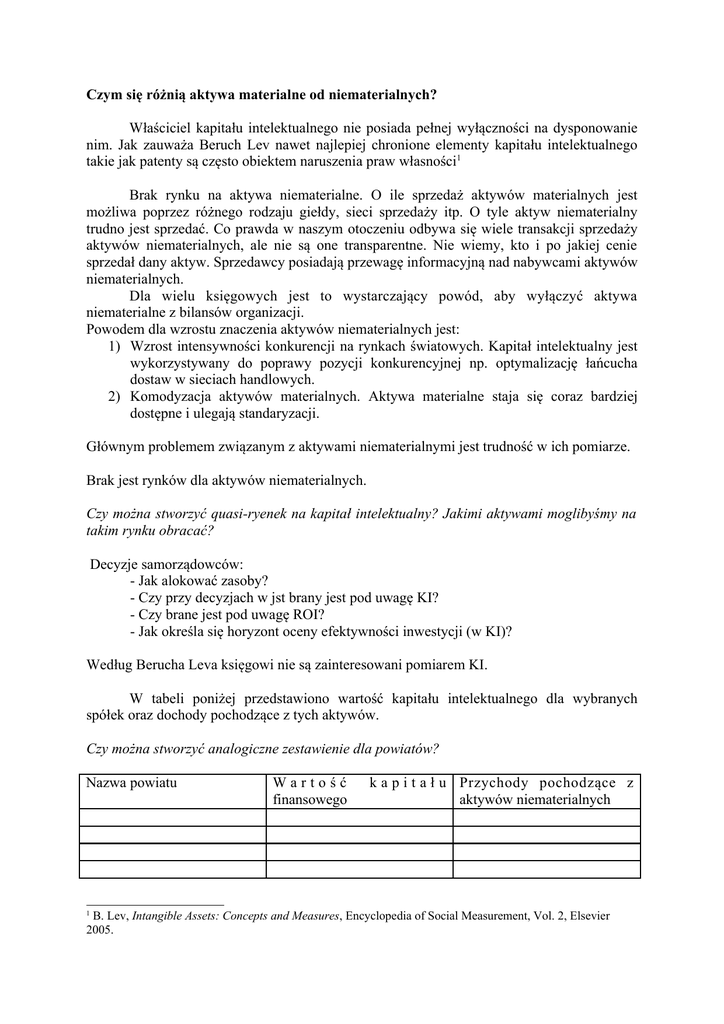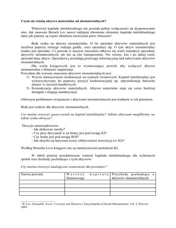 Czym się różnią aktywa materialne od niematerialnych? Właściciel kapitału intelektualnego nie posiada pełnej wyłączności na dysponowanie nim. Jak zauważa Beruch Lev nawet najlepiej chronione elementy kapitału intelektualnego takie jak patenty są często obiektem naruszenia praw własności1 Brak rynku na aktywa niematerialne. O ile sprzedaż aktywów materialnych jest możliwa poprzez różnego rodzaju giełdy, sieci sprzedaży itp. O tyle aktyw niematerialny trudno jest sprzedać. Co prawda w naszym otoczeniu odbywa się wiele transakcji sprzedaży aktywów niematerialnych, ale nie są one transparentne. Nie wiemy, kto i po jakiej cenie sprzedał dany aktyw. Sprzedawcy posiadają przewagę informacyjną nad nabywcami aktywów niematerialnych. Dla wielu księgowych jest to wystarczający powód, aby wyłączyć aktywa niematerialne z bilansów organizacji. Powodem dla wzrostu znaczenia aktywów niematerialnych jest: 1) Wzrost intensywności konkurencji na rynkach światowych. Kapitał intelektualny jest wykorzystywany do poprawy pozycji konkurencyjnej np. optymalizację łańcucha dostaw w sieciach handlowych. 2) Komodyzacja aktywów materialnych. Aktywa materialne staja się coraz bardziej dostępne i ulegają standaryzacji. Głównym problemem związanym z aktywami niematerialnymi jest trudność w ich pomiarze. Brak jest rynków dla aktywów niematerialnych. Czy można stworzyć quasi-ryenek na kapitał intelektualny? Jakimi aktywami moglibyśmy na takim rynku obracać? Decyzje samorządowców: - Jak alokować zasoby? - Czy przy decyzjach w jst brany jest pod uwagę KI? - Czy brane jest pod uwagę ROI? - Jak określa się horyzont oceny efektywności inwestycji (w KI)? Według Berucha Leva księgowi nie są zainteresowani pomiarem KI. W tabeli poniżej przedstawiono wartość kapitału intelektualnego dla wybranych spółek oraz dochody pochodzące z tych aktywów. Czy można stworzyć analogiczne zestawienie dla powiatów? Nazwa powiatu Wartość finansowego k a p i t a ł u Przychody pochodzące z aktywów niematerialnych B. Lev, Intangible Assets: Concepts and Measures, Encyclopedia of Social Measurement, Vol. 2, Elsevier 2005. 1 (Wartość przychodów generowanych przez aktywa niematerialne) = (wartość przychodów (normalizded earnings) – (przychody z aktywów materialnych)2 – (przychody z aktywów fizycznych). 2 Na podstawie arkusza bilansu.