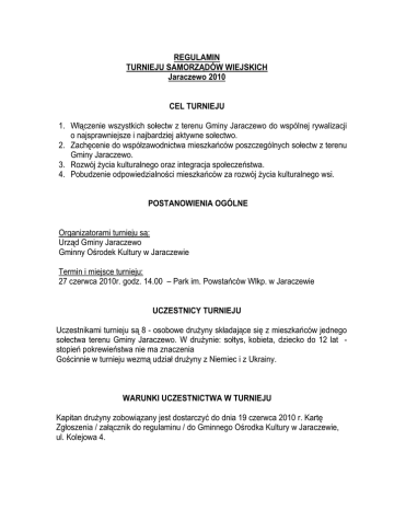 REGULAMIN TURNIEJU SAMORZĄDÓW WIEJSKICH Jaraczewo 2010 CEL TURNIEJU 1. Włączenie wszystkich sołectw z terenu Gminy Jaraczewo do wspólnej rywalizacji o najsprawniejsze i najbardziej aktywne sołectwo. 2. Zachęcenie do współzawodnictwa mieszkańców poszczególnych sołectw z terenu Gminy Jaraczewo. 3. Rozwój życia kulturalnego oraz integracja społeczeństwa. 4. Pobudzenie odpowiedzialności mieszkańców za rozwój życia kulturalnego wsi. POSTANOWIENIA OGÓLNE Organizatorami turnieju są: Urząd Gminy Jaraczewo Gminny Ośrodek Kultury w Jaraczewie Termin i miejsce turnieju: 27 czerwca 2010r. godz. 14.00 – Park im. Powstańców Wlkp. w Jaraczewie UCZESTNICY TURNIEJU Uczestnikami turnieju są 8 - osobowe drużyny składające się z mieszkańców jednego sołectwa terenu Gminy Jaraczewo. W drużynie: sołtys, kobieta, dziecko do 12 lat stopień pokrewieństwa nie ma znaczenia Gościnnie w turnieju wezmą udział drużyny z Niemiec i z Ukrainy. WARUNKI UCZESTNICTWA W TURNIEJU Kapitan drużyny zobowiązany jest dostarczyć do dnia 19 czerwca 2010 r. Kartę Zgłoszenia / załącznik do regulaminu / do Gminnego Ośrodka Kultury w Jaraczewie, ul. Kolejowa 4. Uczestnik turnieju, tj. drużyna, oświadcza, że wyraża zgodę na udostępnienie na stronach internetowych Gminy Jaraczewo opisu i zdjęć wykonanych przez organizatorów w czasie trwania Turnieju. KONKURENCJE 1. Celne oko - strzelanie z wiatrówki - (drużyny 3 osobowe, w tym jedna pani). 2. Celna ręka - (drużyny 3 osobowe, w tym jedna pani), rzut 5 piłeczkami tenisowymi do odległych o 7 m butelek z wodą np. Żywiec – ustawionych na stołach. 3. Celna noga – w parku znajduje się na placu zabaw kratownica z łańcucha, która po dostosowaniu, zastąpi prowizoryczną bramkę piłkarską z zaznaczonymi polami punktowymi. Uczestnik konkursu / dziecko / oddaje 5 strzałów piłką do bramki. 4. Ważenie pyrek – sterta pyrek, z której każda drużyna nabiera do jednakowych worków, 10 kg na „oko” – bez wagi. Po zważeniu wagą cyfrową, okazuje się, która drużyna była najbliżej 10 kg. 5. Rzut pyrką do wiadra z wodą. Każda drużyna wystawi 3 zawodników – obowiązkowo mężczyzna – kobieta - dziecko, którzy - każdy rzucając 5 pyrkami, muszą trafić do odległego o 10 metrów, wiadra z wodą /pyrki wybierają zawodnicy z uprzednio ważonych przez siebie w poprzedniej konkurencji/. 6. Slalom z pyrką – Zawodnik pokonuje tor slalomu tocząc pyrkę kijem unihokejowym – na czas. Liczy się czas pyrki na mecie. /pyrkę wybierają zawodnicy z uprzednio ważonych przez siebie w poprzedniej konkurencji/. Pominięcie w slalomie 1 „pachołka” powoduje dodanie 10 sekund. 7. Kulanie opony /od „malucha”/ - konkurencja dla kobiety i dziecka, dystans 20 m podzielony na dwa odcinki 10 metrowe. Zawodnik kula oponę slalomem do ostatniego „pachołka” - okrąża go /zmiana zawodnika/ wraca na metę – start. Liczy się czas opony na mecie. Pominięcie w slalomie 1 „pachołka” powoduje dodanie 10 sekund. 8. Siłacze – Przeciąganie dużego ciągnika rolniczego o 10 m. (drużyny 5 osobowe, w tym jedna pani). Start i metę wyznacza oś przedniego koła. 9. Rodeo – / 1 reprezentant drużyny / konkurencja polega na jak najdłuższym utrzymaniu się na mechanicznym byku. Próbuje on na wszystkie sposoby zrzucić nas na ziemię. Tak jak na prawdziwym Rodeo jedną ręką trzymamy się byka, a drugą utrzymujemy w powietrzu. Nie ma jednak przy tym mowy, o jakimkolwiek niebezpieczeństwie, ponieważ otacza nas nadmuchiwany powietrzem materac. Całkowicie amortyzuje upadek, więc zabawa jest w pełni bezpieczna. 10. Dojenie sztucznej krowy - super zabawny konkurs w dojeniu sztucznej krowy. Opis konkursu: Zawodnik podchodzi do stanowiska, siada na zydlu i czeka na sygnał do rozpoczęcia dojenia. Po skończonym dojeniu (1minuta) mleko przelewane jest do menzurki, z której następuje odczyt. (Krowa do dojenia jest pełnowymiarowa, woda dzięki specjalnemu barwnikowi wygląda jak mleko ) OCENA KONKURENCJI Do oceny każdej konkurencji zostaną przez Organizatorów wyznaczeni BEZSTRONNI SĘDZIOWIE oraz obserwator w osobie Radnego Gminy Jaraczewo. NAGRODY Drużyny otrzymują puchary, dyplomy i nagrody ufundowane przez organizatorów. POSTANOWIENIA KOŃCOWE Organizatorzy nie ponoszą odpowiedzialności za szkody materialne uczestników podczas turnieju. Koszty przejazdu uczestników pokrywają uczestnicy konkursu. Ostateczna interpretacja regulaminu należy do organizatorów. Kwestie sporne rozstrzygać będzie komisja sędziowska, po wpłaceniu kaucji w wys. 50 zł na rzecz Organizatora. Regulamin w jego pełnym brzmieniu zostanie zamieszczony na stronie Organizatora, pod adresem www.gok.jaraczewo.pl Wszelkie pytania związane z konkursem prosimy kierować Gminnego Ośrodka Kultury, Tel.62 740 8032.