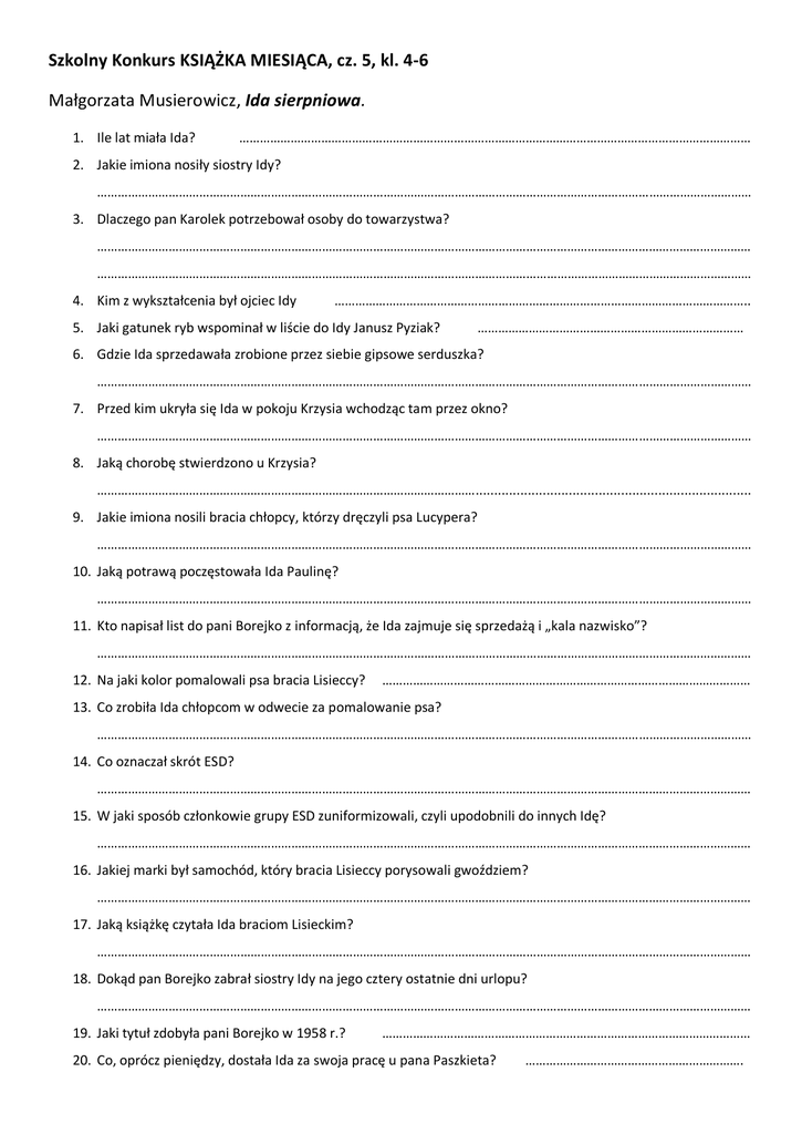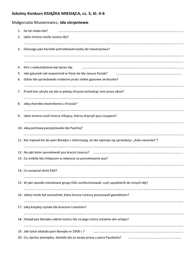 Szkolny Konkurs KSIĄŻKA MIESIĄCA, cz. 5, kl. 4-6 Małgorzata Musierowicz, Ida sierpniowa. 1. Ile lat miała Ida? …………………………………………………………………………………………………………………………………… 2. Jakie imiona nosiły siostry Idy? ………………………………………………………………………………………………………………………………………………………………………… 3. Dlaczego pan Karolek potrzebował osoby do towarzystwa? ………………………………………………………………………………………………………………………………………………………………………… ………………………………………………………………………………………………………………………………………………………………………… 4. Kim z wykształcenia był ojciec Idy ………………………………………………………………………………………………………….. 5. Jaki gatunek ryb wspominał w liście do Idy Janusz Pyziak? …………………………………………………………………… 6. Gdzie Ida sprzedawała zrobione przez siebie gipsowe serduszka? ………………………………………………………………………………………………………………………………………………………………………… 7. Przed kim ukryła się Ida w pokoju Krzysia wchodząc tam przez okno? ………………………………………………………………………………………………………………………………………………………………………… 8. Jaką chorobę stwierdzono u Krzysia? ………………………………………………………………………………………………….......................................................................... 9. Jakie imiona nosili bracia chłopcy, którzy dręczyli psa Lucypera? ………………………………………………………………………………………………………………………………………………………………………… 10. Jaką potrawą poczęstowała Ida Paulinę? ………………………………………………………………………………………………………………………………………………………………………… 11. Kto napisał list do pani Borejko z informacją, że Ida zajmuje się sprzedażą i „kala nazwisko”? ………………………………………………………………………………………………………………………………………………………………………… 12. Na jaki kolor pomalowali psa bracia Lisieccy? ……………………………………………………………………………………………… 13. Co zrobiła Ida chłopcom w odwecie za pomalowanie psa? ………………………………………………………………………………………………………………………………………………………………………… 14. Co oznaczał skrót ESD? ………………………………………………………………………………………………………………………………………………………………………… 15. W jaki sposób członkowie grupy ESD zuniformizowali, czyli upodobnili do innych Idę? ………………………………………………………………………………………………………………………………………………………………………… 16. Jakiej marki był samochód, który bracia Lisieccy porysowali gwoździem? ………………………………………………………………………………………………………………………………………………………………………… 17. Jaką książkę czytała Ida braciom Lisieckim? ………………………………………………………………………………………………………………………………………………………………………… 18. Dokąd pan Borejko zabrał siostry Idy na jego cztery ostatnie dni urlopu? ………………………………………………………………………………………………………………………………………………………………………… 19. Jaki tytuł zdobyła pani Borejko w 1958 r.? ……………………………………………………………………………………………… 20. Co, oprócz pieniędzy, dostała Ida za swoja pracę u pana Paszkieta? ……………………………………………………….