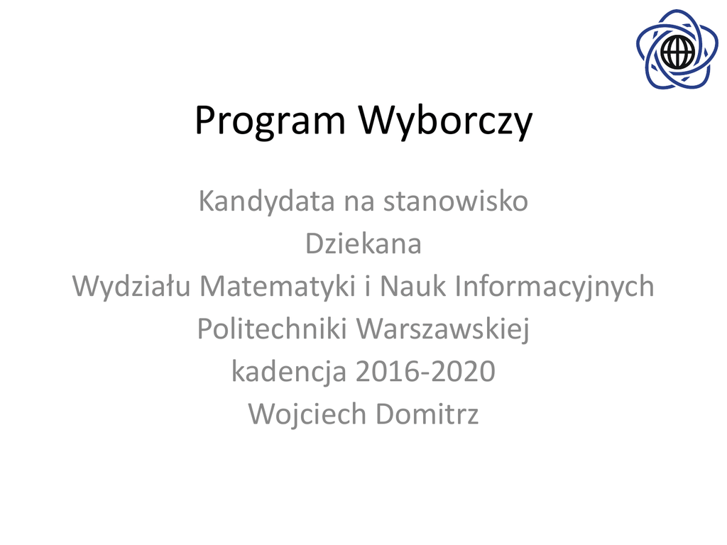 Program Wyborczy Kandydata na stanowisko Dziekana Wydziału Matematyki i Nauk Informacyjnych Politechniki Warszawskiej kadencja 2016-2020 Wojciech Domitrz Strategia Rozwoju Wydziału do roku 2020 • Wizja Wydział MiNI – ważna jednostka liczącej się w świecie uczelni; nowoczesny, ambitny i dynamiczny ośrodek badawczoedukacyjny • Misja Służba społeczeństwu poprzez 1. Rzetelne uprawianie nauki 2. Kształcenie elit intelektualnych 3. Szerzenie edukacji matematycznej i informatycznej 4. Wykorzystanie wiedzy matematycznej i informatycznej na potrzeby gospodarcze i społeczne Program wyborczy kandydata na stanowisko Dziekana MiNI PW Kształcenie 1. Dostosowanie oferty edukacyjnej do potrzeb gospodarczych i społecznych 2. Zapewnienie wysokiej jakości kształcenia 3. Podniesienie krajowej i międzynarodowej pozycji Wydziału w obszarze kształcenia 4. Wzmocnienie pozycji poprzez promocję Program wyborczy kandydata na stanowisko Dziekana MiNI PW Badania naukowe 1. Utrzymanie wysokiej kategorii naukowej Wydziału w kraju i jak najlepszej rozpoznawalności w świecie 2. Podniesienie jakości i efektywności badań naukowych 3. Komercjalizacja wyników badań naukowych 4. Intensyfikacja współpracy krajowej i zagranicznej Program wyborczy kandydata na stanowisko Dziekana MiNI PW Organizacja i zarządzanie • Dalsze zwiększanie efektywności zarządzania • Integracja społeczności • Racjonalne gospodarowanie bazą materialną i niematerialną • Współpraca z otoczeniem Program wyborczy kandydata na stanowisko Dziekana MiNI PW Kandydaci na prodziekanów • Prodziekan ds. Nauki prof. dr hab. Janina Kotus • Prodziekan ds. Rozwoju dr hab. inż. Maciej Grzenda • Prodziekan ds. Nauczania dr Konstanty Junosza-Szaniawski • Prodziekan ds. Studenckich dr Bogusława Karpińska Program wyborczy kandydata na stanowisko Dziekana MiNI PW
