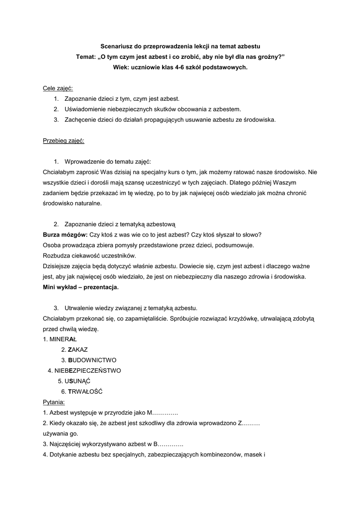 Scenariusz do przeprowadzenia lekcji na temat azbestu Temat: „O tym czym jest azbest i co zrobić, aby nie był dla nas groźny?” Wiek: uczniowie klas 4-6 szkół podstawowych. Cele zajęć: 1. Zapoznanie dzieci z tym, czym jest azbest. 2. Uświadomienie niebezpiecznych skutków obcowania z azbestem. 3. Zachęcenie dzieci do działań propagujących usuwanie azbestu ze środowiska. Przebieg zajęć: 1. Wprowadzenie do tematu zajęć: Chciałabym zaprosić Was dzisiaj na specjalny kurs o tym, jak moŜemy ratować nasze środowisko. Nie wszystkie dzieci i dorośli mają szansę uczestniczyć w tych zajęciach. Dlatego później Waszym zadaniem będzie przekazać im tę wiedzę, po to by jak najwięcej osób wiedziało jak moŜna chronić środowisko naturalne. 2. Zapoznanie dzieci z tematyką azbestową Burza mózgów: Czy ktoś z was wie co to jest azbest? Czy ktoś słyszał to słowo? Osoba prowadząca zbiera pomysły przedstawione przez dzieci, podsumowuje. Rozbudza ciekawość uczestników. Dzisiejsze zajęcia będą dotyczyć właśnie azbestu. Dowiecie się, czym jest azbest i dlaczego waŜne jest, aby jak najwięcej osób wiedziało, Ŝe jest on niebezpieczny dla naszego zdrowia i środowiska. Mini wykład – prezentacja. 3. Utrwalenie wiedzy związanej z tematyką azbestu. Chciałabym przekonać się, co zapamiętaliście. Spróbujcie rozwiązać krzyŜówkę, utrwalającą zdobytą przed chwilą wiedzę. 1. MINERAŁ 2. ZAKAZ 3. BUDOWNICTWO 4. NIEBEZPIECZEŃSTWO 5. USUNĄĆ 6. TRWAŁOŚĆ Pytania: 1. Azbest występuje w przyrodzie jako M…………. 2. Kiedy okazało się, Ŝe azbest jest szkodliwy dla zdrowia wprowadzono Z……… uŜywania go. 3. Najczęściej wykorzystywano azbest w B…………. 4. Dotykanie azbestu bez specjalnych, zabezpieczających kombinezonów, masek i rękawic to N…………….. 5. Do 2032 roku Polacy muszą U…….. wszystkie wyroby zawierające azbest. 6. Szczególną cechą wyrobów azbestowych, jest ich T…………. 4. Rozpowszechnianie wiedzy na temat azbestu i zasad postępowania z nim. Podział klasy na zespoły: kaŜdy z zespołów ma za zadanie przygotować krótką, zajmującą koło jednej minuty, informację o szkodliwości wyrobów zawierających azbest i konieczności zgłoszenia o ich istnieniu urzędowi gminy. Dzięki tym zajęciom wiecie, Ŝe azbest jest szkodliwy i waŜne jest, aby został usunięty. Wyobraźnie sobie, Ŝe zaproszono was do radia lub telewizji, Ŝeby ostrzec innych przed szkodliwością wyrobów zawierających azbest. Proszę, aby kaŜdy zespół przygotował krotki komunikat na ten temat. KaŜdy zespół prezentuje swój komunikat na forum klasy. Forma jest dowolna – muzyczna, teatralna lub inne, np. dzieci mogą ułoŜyć mini wiersz, mogą „wyrapować” lub „wyskakać” w rytmie hip-hop.