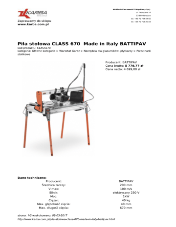 KARBA B.Karczewski i Wspólnicy Sp.J. ul. Fabryczna 14 53-609 Wrocław tel. +48 71 724-24-65 Zapraszamy do sklepu www.karba.com.pl tel. +48 71 718-20-03 Piła stołowa CLASS 670 Made in Italy BATTIPAV kod produktu: CLASS670 kategoria: Główne kategorie > Warsztat Garaż > Narzędzia dla glazurników, płytkarzy > Przecinarki stolikowe Producent: BATTIPAV Cena brutto: 5 779,77 zł Cena netto: 4 699,00 zł Dane techniczne: Producent: Średnica tarczy: V max: Silnik: Moc: Ciężar: Max. głębokość cięcia: Max. długość cięcia: BATTIPAV 200 mm 100 m/s elektryczny 230 V 1kW 40 kg 40 mm 670 mm strona: 1/2 wydrukowano: 08-03-2017 http://www.karba.com.pl/pila-stolowa-class-670-made-in-italy-battipav.html Opis: Dł. cięcia: 670 mm SPRAY SYSTEM, FAST LEG, Wdec, AxT Wysokiej jakości piła stołowa mostowa z głowicą roboczą poruszającą się po stalowej prowadnicy łożyskowanej w każdej płaszczyźnie. Lekkość posuwu głowicy oraz dokładność prowadzenia zadowolą nawet najbardziej wymagających klientów. Nowoczesny, awangardowy design z innowacyjnymi rozwiązaniami technicznymi, bardzo solidna, oferująca doskonałą precyzję, zaprojektowana do cięcia cienkich elementów jak płytki, kafle. Silnik o mocy 1kW, ale połączony z tarczą o średnicy tylko 200mm, pozwala na łatwe zagłębianie narzędzia w nawet najtwardsze mieszanki. Jest to standardowa moc popularnie stosowana do tarcz o średnicy 250mm, stąd duży zapas mocy. Maszyna wyposażona jest w 4 opatentowane rozwiązania: SpraySystem - system podawania wody na tarczę diamentową, który zwiększa wydajność cięcia oraz żywotność tarczy diamentowej FastLEG - system szybkiego montażu nóg bez użycia narzędzi, możliwość obniżenia środka ciężkości poprzez zblokowanie zacisków na innej wysokości Wdec - dekantacja wanny wodnej, dzięki temu rozwiązaniu pompka wodna ma długo czystą wodę, ponieważ nieczystości spływają do niżej osadzonych zagłębień AxT - system pompowania wody przez nurnikową pompę wodną dodatkowo: profilowana aluminiowa rama wanny wodnej dla uzyskania maksymalnej sztywności, a równocześnie niskiej wagi jedyna na rynku maszyna, w której przy wahadłowym cięciu osłona tarczy zawsze jest ustawiona równolegle do stołu, co oferuje znacznie większy zakres dla głębokości ustawienia głowicy Głębokość cięcia: Max. głębokość cięcia 90° - 40 mm Max. głębokość cięcia 45° - 40 mm Silnik: 1kW 230V 60Hz (zabezpieczenie termiczne i przeciążeniowe) zabezpieczenie przez przegrzaniem strona: 2/2 wydrukowano: 08-03-2017 http://www.karba.com.pl/pila-stolowa-class-670-made-in-italy-battipav.html