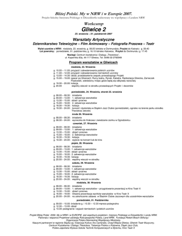 Bliżej Polski. My w NRW i w Europie 2007. Projekt Szkolny Instytutu Polskiego w Düsseldorfie realizowany we współpracy z Landem NRW Workcamp Gliwice 2 23. września – 01. październik 2007 Warsztaty Artystyczne Dziennikarstwo Telewizyjne – Film Animowany – Fotografia Prasowa – Teatr Wylot uczniów z NRW: niedziela, 23. września, g. 08.05 lotnisko w Dortmundzie, Przylot do Katowic: g. 09.40 Lot powrotny: poniedziałek, 01. października, g. 16.10 lotnisko Katowice, Przylot do Dortmundu: g. 17.45 Noclegi: Centrum kształcenia i Dialogu „Theotokos”, ul. Kopernika 63a, 44-117 Gliwice, Tel. 0048-32-2792949 Program warsztatów w Gliwicach niedziela, 23. Września g. 10.00 – 11.00: przyjazd i zakwaterowanie polskich uczniów g. 11.00 – 12.00: przyjazd i zakwaterowanie niemieckich uczniów g. 13.00 – 14.30: obiad, przedstawienie zespołu prowadzącego Projekt g. 15.00 – 19.00: spacer po Gliwicach: Ruiny teatru, Rynek, Katedra, Radiostacja Gliwicka, Zameczek Piastowski, odwiedziny miejsc gdzie będą się odbywały warsztaty g. 19.30 – 20.00: kolacja, g. 20.00 wspólny wieczór w ośrodku prowadzących Projekt i docentów poniedziałek, 24. Września, wtorek 25. września g. 08.00 – 08.30 : śniadanie g. 09.00 – 13.00 : 1. sekwencja warsztatów g. 13.30 – 15.00 : obiad i przerwa g. 15.00 – 18.00 : 2. sekwencja warsztatów g. 18.30 – 19.30 : kolacja g. 19.30 – 24.00 : koncert i dyskoteka w Sląskim Jazz Clubie (poniedziałek), ognisko na terenie parku ośrodka Theotokos (wtorek) środa 26. Września g. 08.00 – 08.30 : śniadanie g. 08.30 – 24.00 : wycieczka do Krakowa i zwiedzanie zamku w Ogrodzieńcu czwartek, 27. Września g. 08.00 – 08.30 : g. 09.00 – 13.00 : g. 13.30 – 15.00 : g. 15.00 – 18.00 : g. 18.30 – 19.30 : g. 19.30 – 24.00 : śniadanie 1. sekwencja warsztatów obiad i przerwa 2. Sekwencja warsztatów kolacja wyjście na koncert lub do kina piątek, 28. Września g. 08.00 – 08.30 : śniadanie g. 09.00 – 13.00 : 1. sekwencja warsztatów g. 13.30 – 15.00 : obiad i przerwa g. 15.00 – 18.00 : 2. sekwencja warsztatów g. 18.30 – 19.30: kolacja g. 20.00 – 24.00 : wspólny wieczór w ośrodku sobota, 29. Września g. 08.00 – 08.30 : śniadanie g. 09.00 – 13.00 : 1. sekwencja warsztatów g. 13.30 – 15.00 : obiad i przerwa g. 15.00 – 18.00 : 2. sekwencja warsztatów g. 18.30 – 19.30: kolacja g. 20.00 – 24.00 : wspólny wieczór w ośrodku niedziela, 30. Września g. 08.00 – 08.30 : g. 09.00 – 13.00 : g. 13.30 – 15.00 : g. 16.00 – 19.00 : g. 20.00 – 24.00 : śniadanie 1. sekwencja warsztatów – przygotowanie prezentacji w Kino Teatr X obiad i przerwa Otwarta prezentacja wyników warsztatów w Kino Teatr X na zakończenie zabawa w Ślaskim Clubie Jazzowym dla uczestników warsztatów poniedziałek, 01. Października g. 09.00 – 10.00: śniadanie g. i 10.30 – 12.30 mpreza pożegnalna g. 12.30 – 13.00: obiad g. 13.30: pożegnanie i wyjazd niemieckich i polskich uczniów Projekt Bliżej Polski 2006. My w NRW i w EUROPIE jest wspólnym projektem Instytutu Polskiego w Düsseldorfie i Landu NRW. Patronatu i wsparcia Projektowi udzielają Rzeczpospolita Polska, Land NRW, Fundacja Robert Bosch Stiftung i Organizacja Polsko-Niemieckiej Współpracy Młodzieży. Naszymi partnerami w regionie Sląska są: Instytucja Kultury Ars Cameralis, Urząd Miasta Gliwice, Gliwicki Teatr Muzyczny, Centrum Kształcenia i Dialogu Theotokos, Telewizja Polska o./Katowice, Śląski Jazz Club, Polsko-Japońska Wyższa Szkoła Technik Komputerowych w Bytomiu, Kino Teatr X