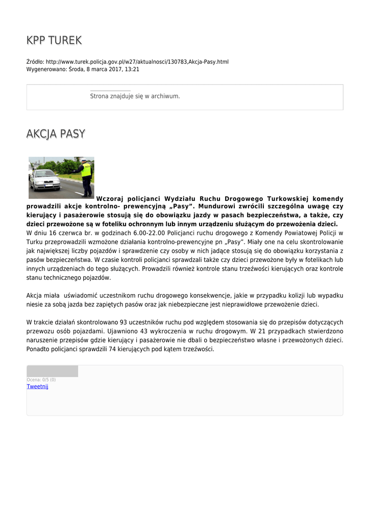 KPP TUREK Źródło: http://www.turek.policja.gov.pl/w27/aktualnosci/130783,Akcja-Pasy.html Wygenerowano: Środa, 8 marca 2017, 13:21 Strona znajduje się w archiwum. AKCJA PASY Wczoraj policjanci Wydziału Ruchu Drogowego Turkowskiej komendy prowadzili akcje kontrolno- prewencyjną „Pasy”. Mundurowi zwrócili szczególna uwagę czy kierujący i pasażerowie stosują się do obowiązku jazdy w pasach bezpieczeństwa, a także, czy dzieci przewożone są w foteliku ochronnym lub innym urządzeniu służącym do przewożenia dzieci. W dniu 16 czerwca br. w godzinach 6.00-22.00 Policjanci ruchu drogowego z Komendy Powiatowej Policji w Turku przeprowadzili wzmożone działania kontrolno-prewencyjne pn „Pasy”. Miały one na celu skontrolowanie jak największej liczby pojazdów i sprawdzenie czy osoby w nich jadące stosują się do obowiązku korzystania z pasów bezpieczeństwa. W czasie kontroli policjanci sprawdzali także czy dzieci przewożone były w fotelikach lub innych urządzeniach do tego służących. Prowadzili również kontrole stanu trzeźwości kierujących oraz kontrole stanu technicznego pojazdów. Akcja miała uświadomić uczestnikom ruchu drogowego konsekwencje, jakie w przypadku kolizji lub wypadku niesie za sobą jazda bez zapiętych pasów oraz jak niebezpieczne jest nieprawidłowe przewożenie dzieci. W trakcie działań skontrolowano 93 uczestników ruchu pod względem stosowania się do przepisów dotyczących przewozu osób pojazdami. Ujawniono 43 wykroczenia w ruchu drogowym. W 21 przypadkach stwierdzono naruszenie przepisów gdzie kierujący i pasażerowie nie dbali o bezpieczeństwo własne i przewożonych dzieci. Ponadto policjanci sprawdzili 74 kierujących pod kątem trzeźwości. Ocena: 0/5 (0) Tweetnij